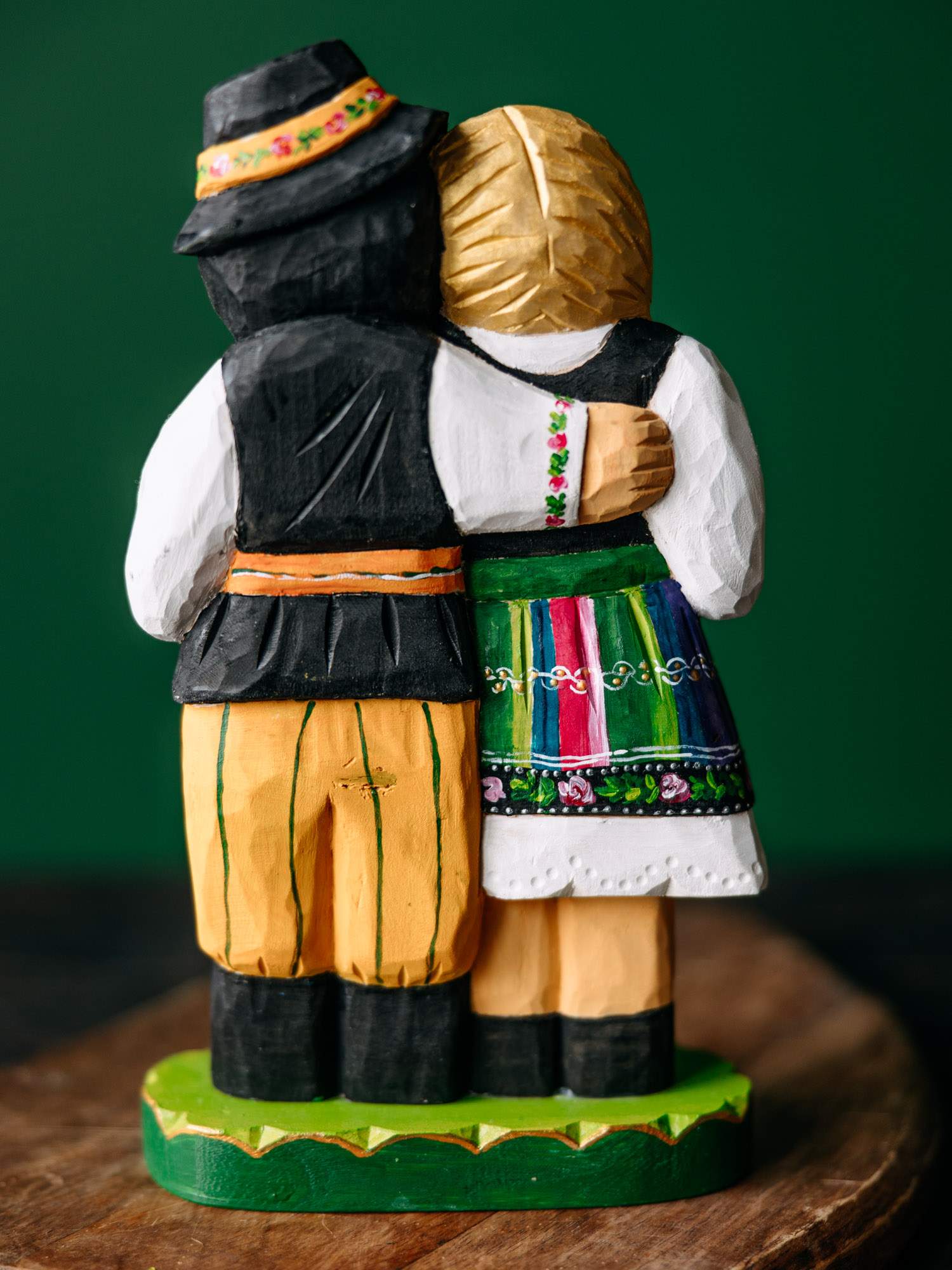 Rzeźba wykonana z drewna, ukazująca parę w stroju łowickim. Postacie zostały ręcznie wyrzeźbione oraz pomalowane z zachowaniem proporcji i detali charakterystycznych dla kultury ludowej. Rzeźba utrzymana w intensywnej, wielobarwnej kolorystyce. Całość została wykonana przez rzeźbiarkę z okolic Łowicza.