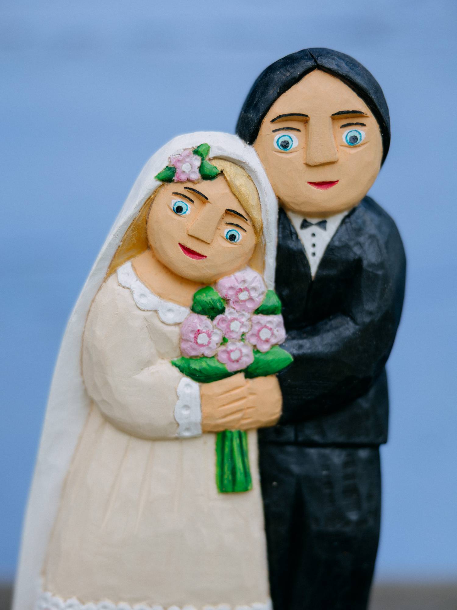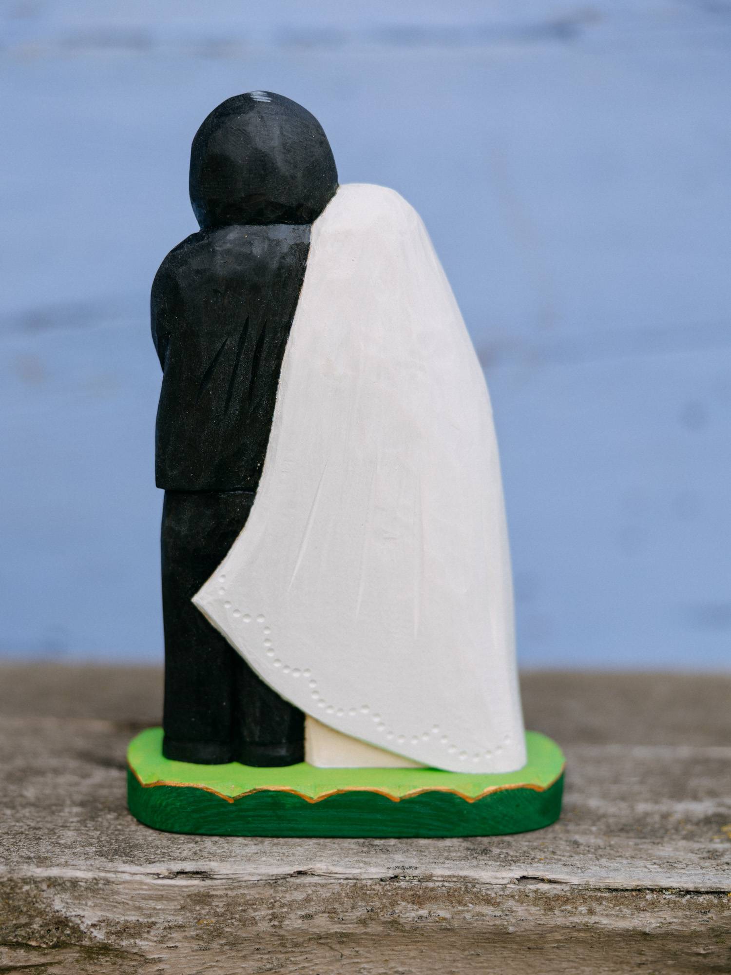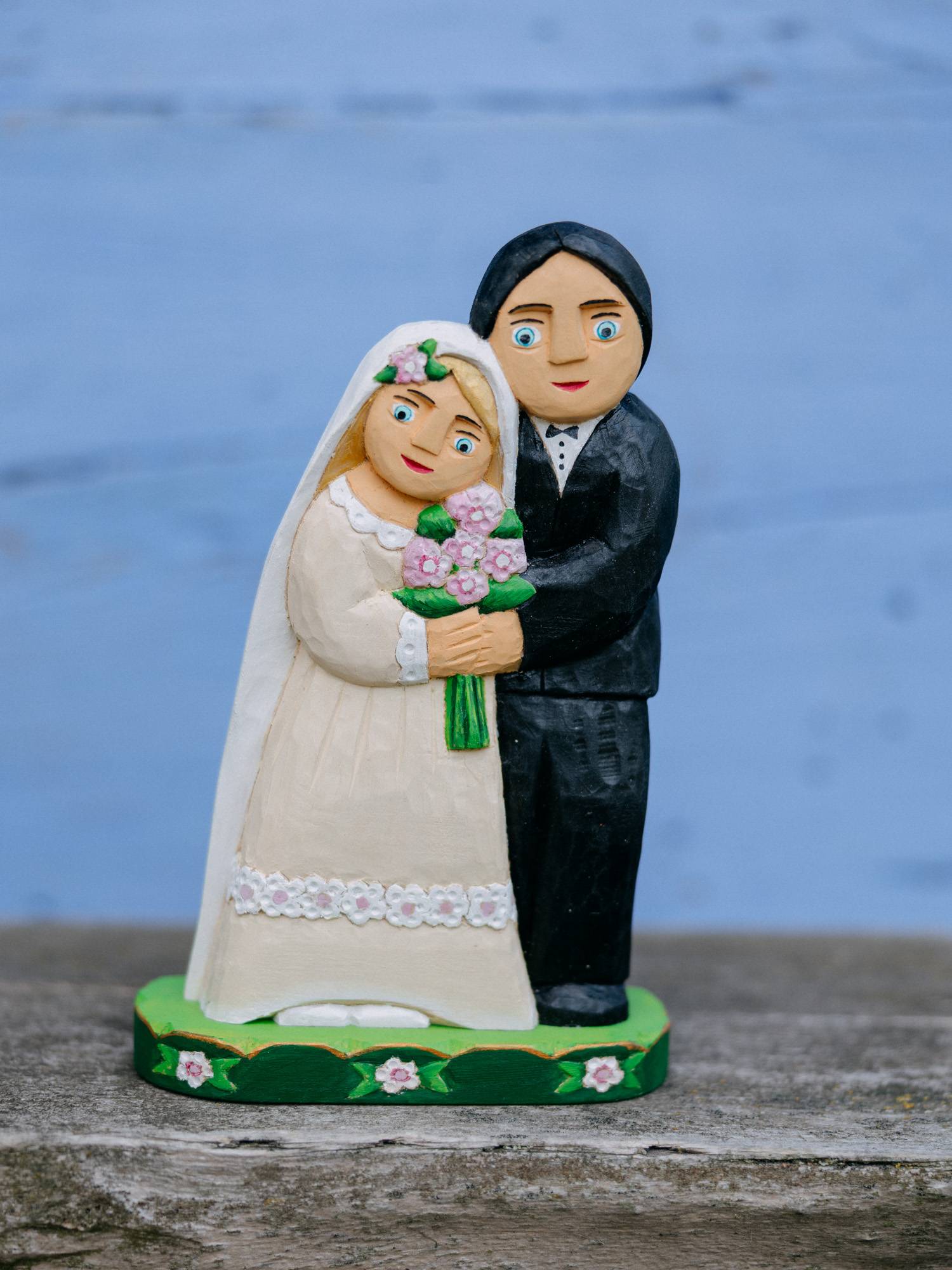 Ręcznie wykonana, 24-centymetrowa rzeźba przedstawiająca przytulającą się parę młodą. Panna młoda jest ubrana w jasną sukienkę. W ręku trzyma bukiet kwiatków, a na głowie ma długi biały welon. Pan młody jest ubrany w czarny garnitur oraz ma czarne włosy. Całość została wykonana przez rzeźbiarkę z okolic Łowicza.