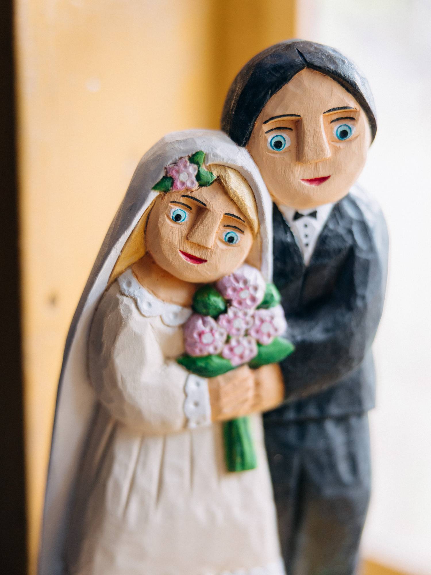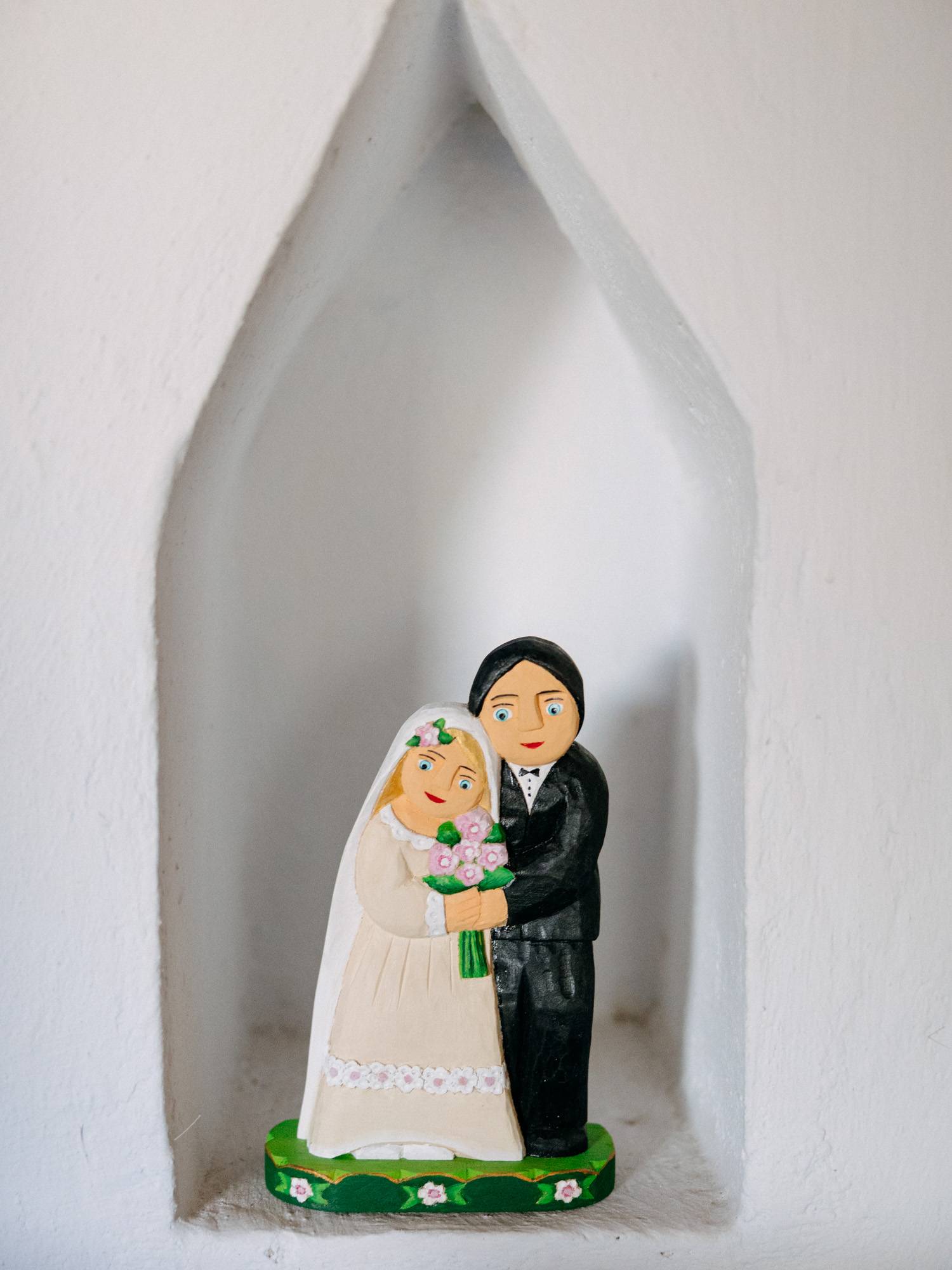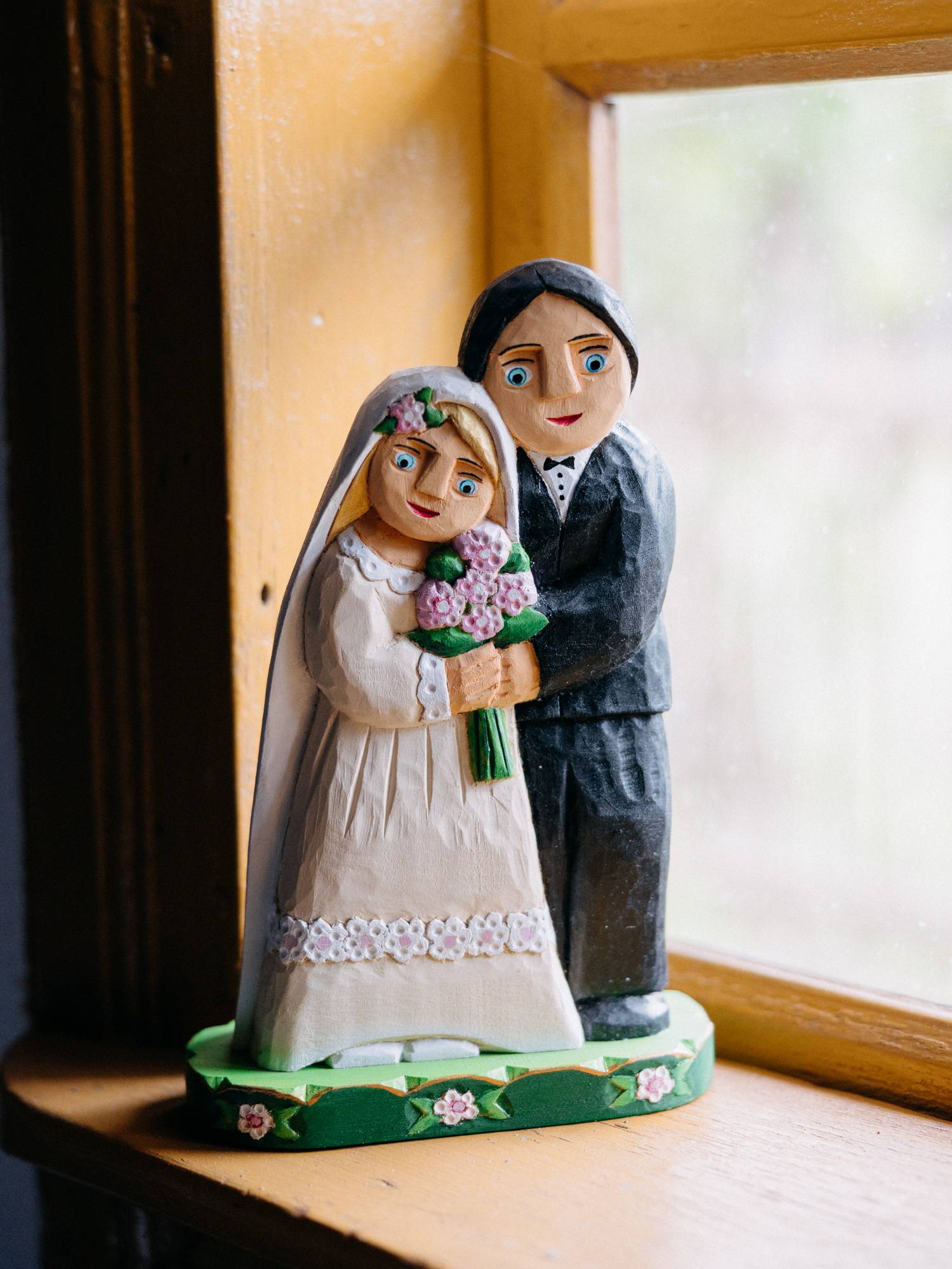 Ręcznie wykonana, 24-centymetrowa rzeźba przedstawiająca przytulającą się parę młodą. Panna młoda jest ubrana w jasną sukienkę. W ręku trzyma bukiet kwiatków, a na głowie ma długi biały welon. Pan młody jest ubrany w czarny garnitur oraz ma czarne włosy. Całość została wykonana przez rzeźbiarkę z okolic Łowicza.