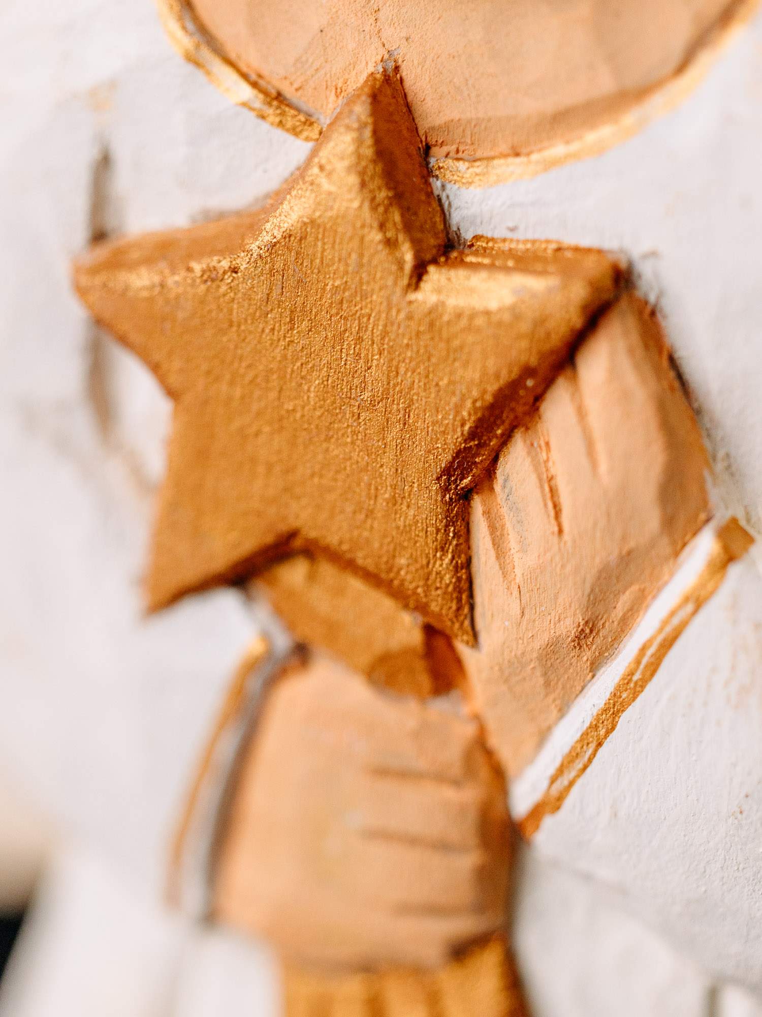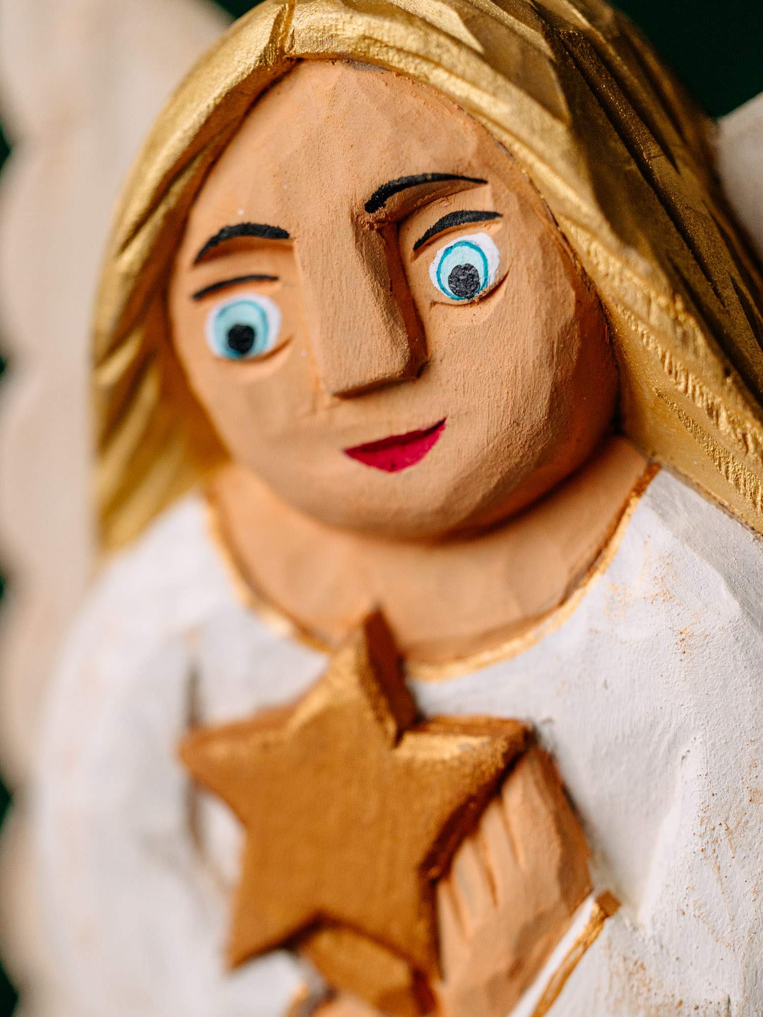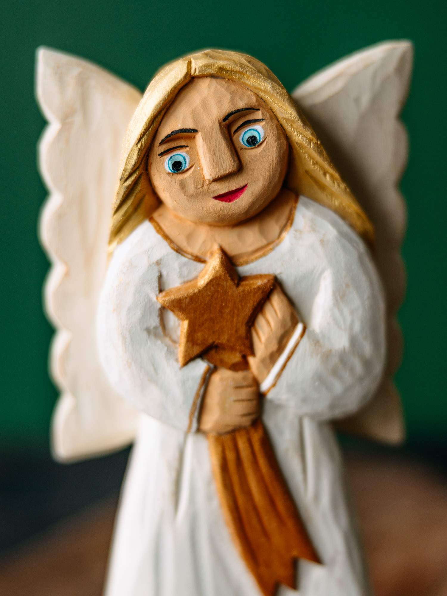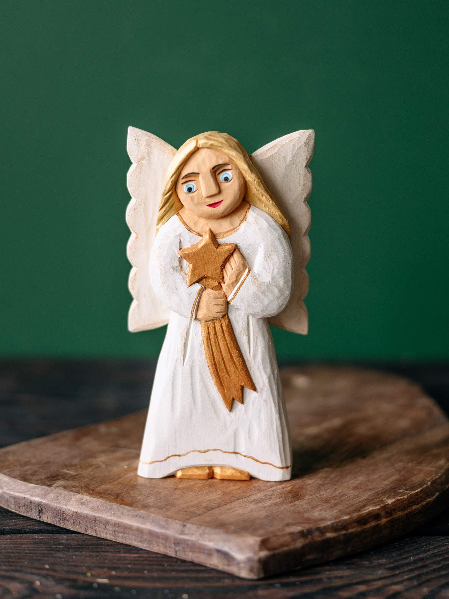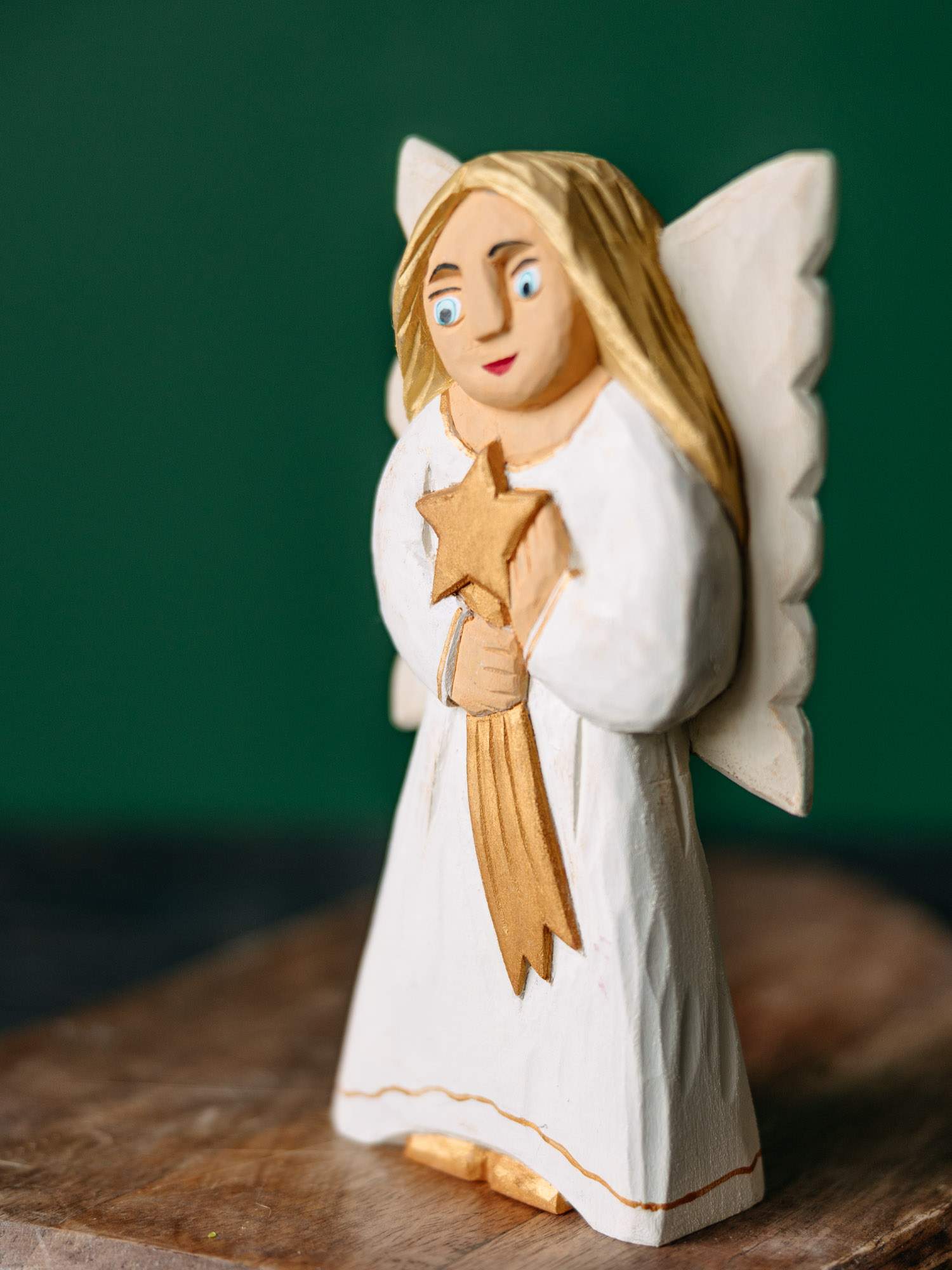Wykonana ręcznie drewniana rzeźba Anioła w białej sukience, zdobionej złotymi elementami. W dłoniach trzyma gwiazdę, a za plecami znajdują się białe skrzydła. Całość utrzymana jest w kolorystyce biało-złotej. Wykonana przez rzeźbiarkę z okolic Łowicza.