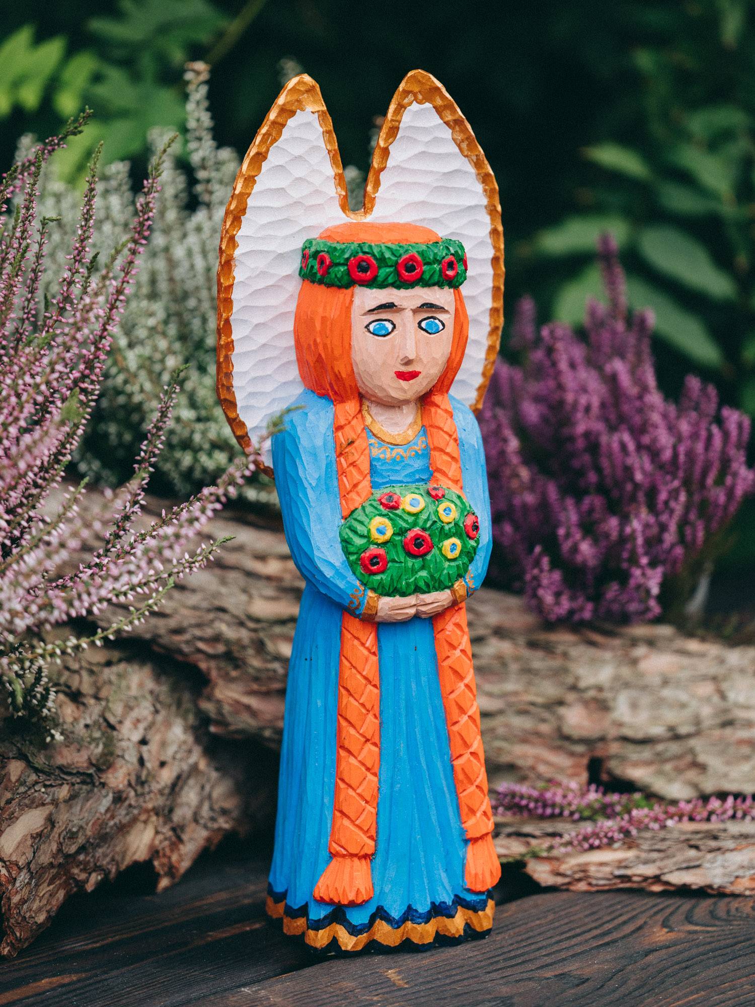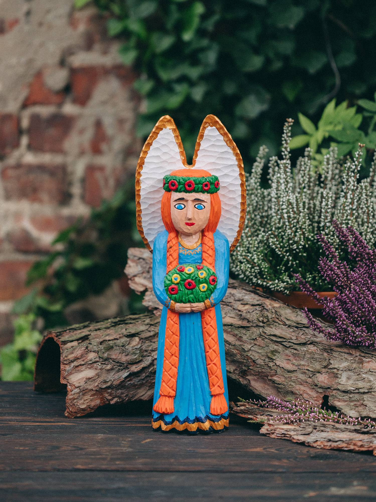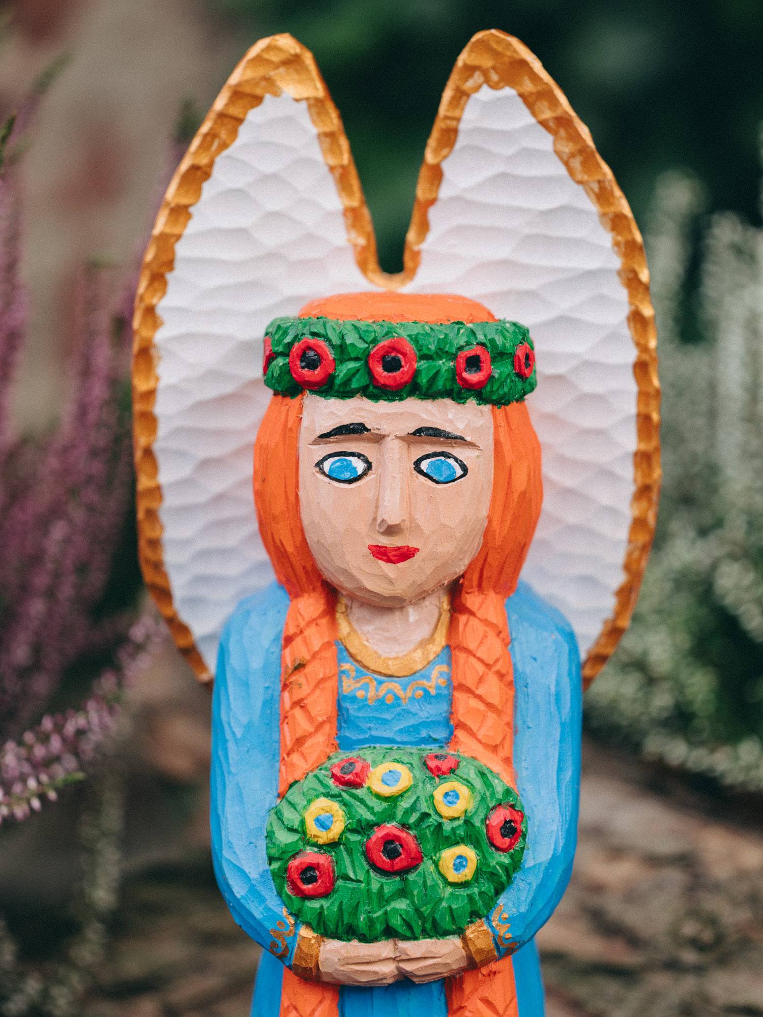 Wykonana ręcznie z drewna rzeźba przedstawiająca anioła w niebieskiej szacie, zdobionej złotymi elementami. Postać ma długie, pomarańczowe włosy zaplecione w dwa grube warkocze, a na głowie zielony wianek zdobiony czerwonymi kwiatkami. W dłoniach trzyma bukiet kolorowych kwiatków. Za plecami znajdują się duże białe skrzydła ze złotą obwódką.