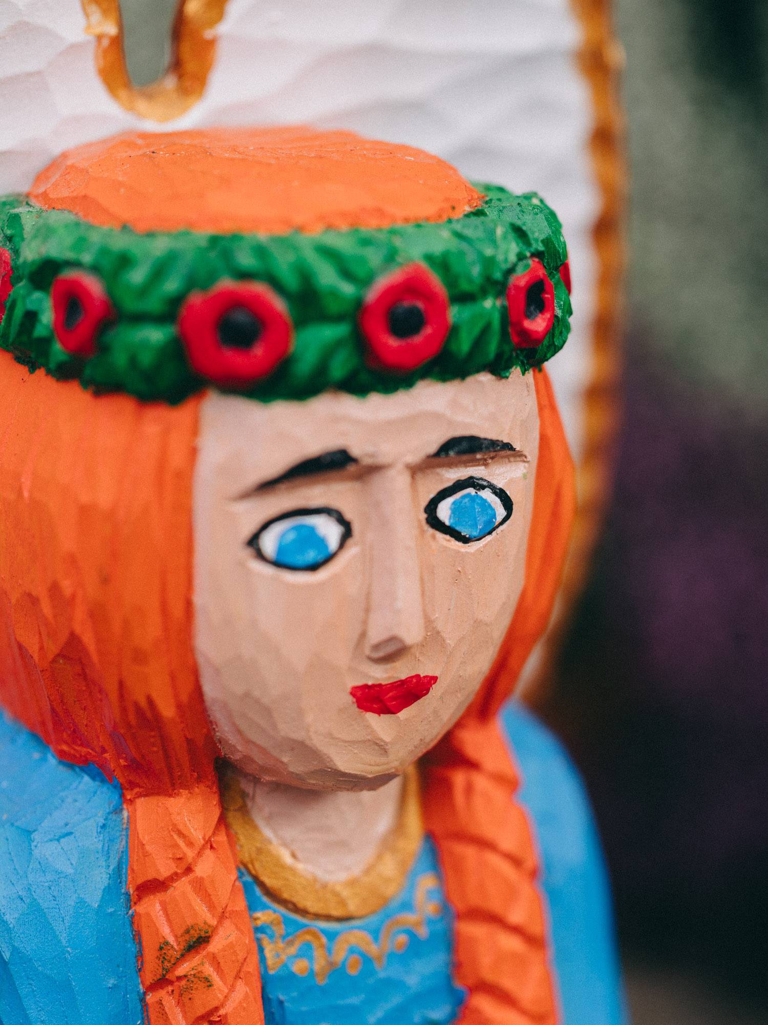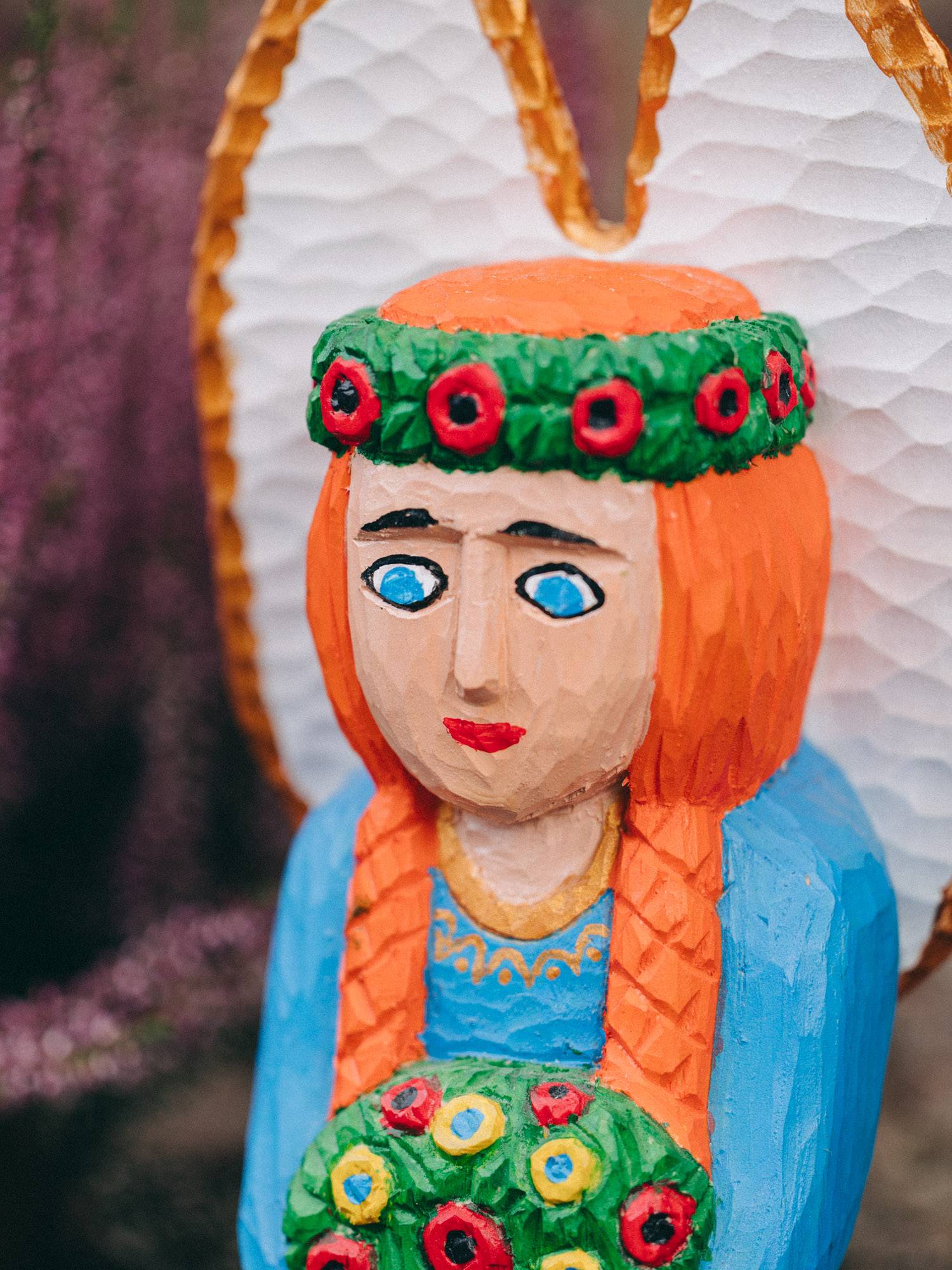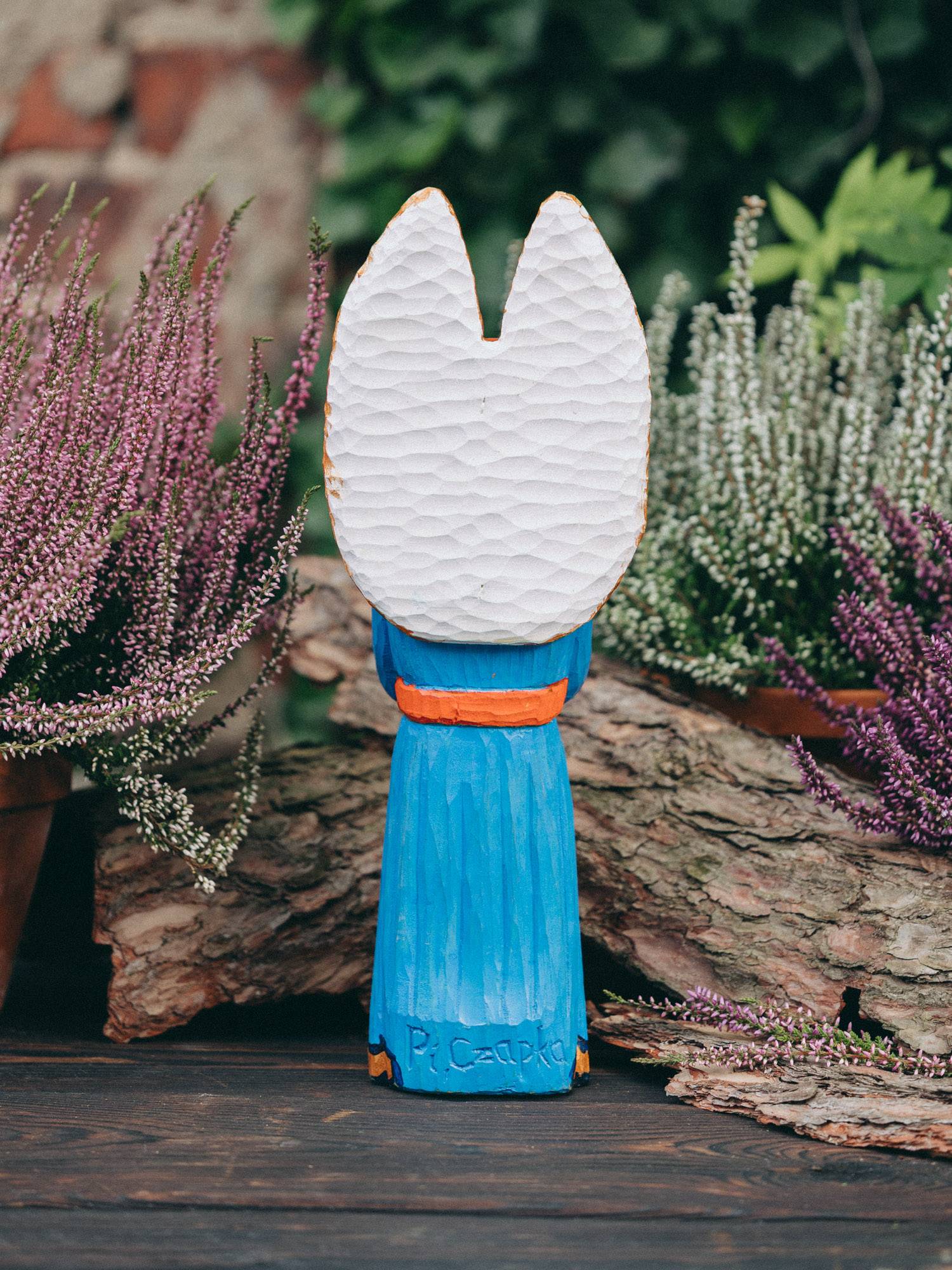 Wykonana ręcznie z drewna rzeźba przedstawiająca anioła w niebieskiej szacie, zdobionej złotymi elementami. Postać ma długie, pomarańczowe włosy zaplecione w dwa grube warkocze, a na głowie zielony wianek zdobiony czerwonymi kwiatkami. W dłoniach trzyma bukiet kolorowych kwiatków. Za plecami znajdują się duże białe skrzydła ze złotą obwódką.