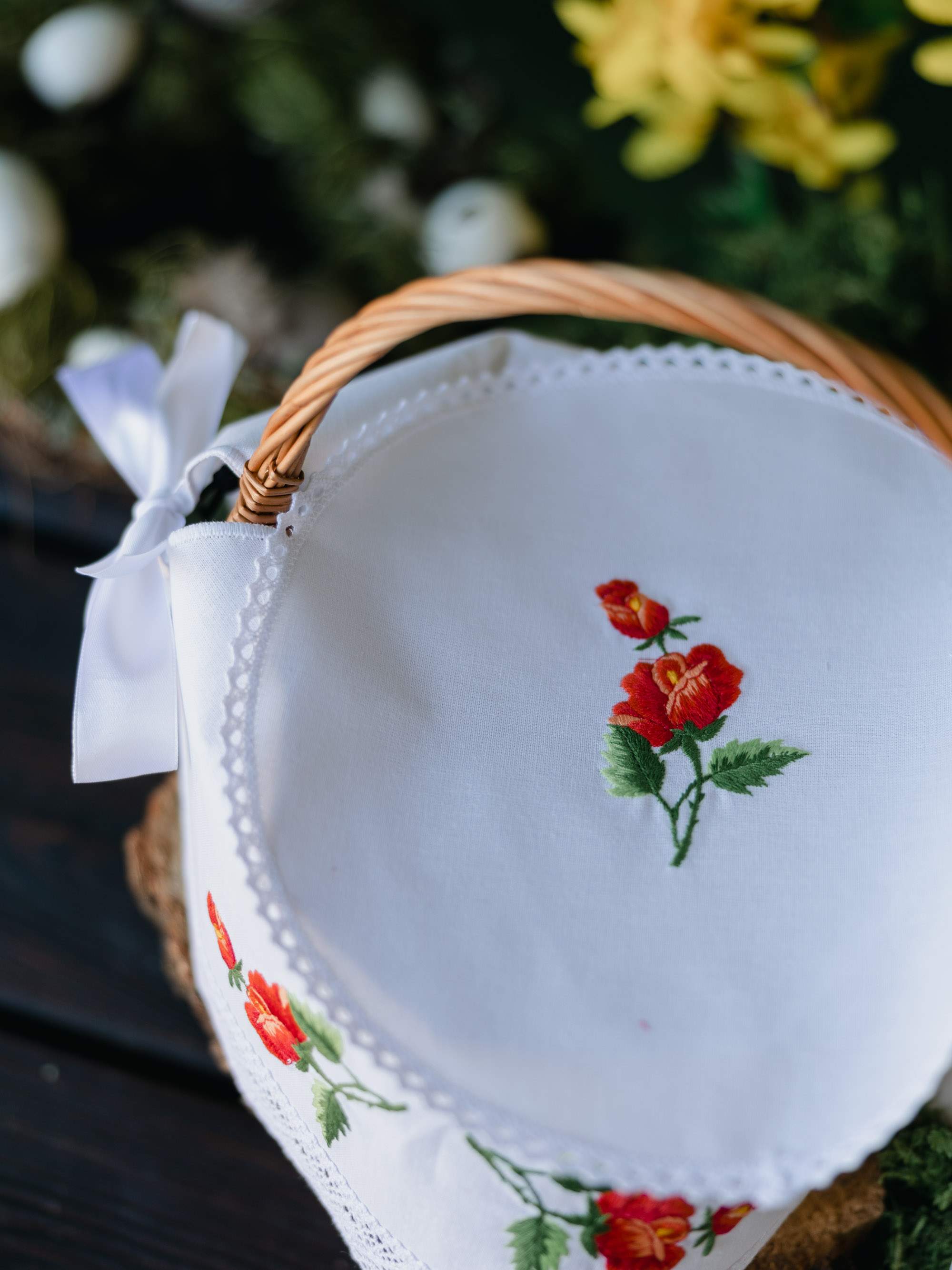 Zestaw dużych serwetek do koszyczka, ozdobiony koronkowym obszyciem oraz haftowanymi detalami - czerwonymi różami. W zestawie znajduje się mniejsza, okągła serwetka służąca do okrycia pokarmu, oraz większa serweta do wyłożenia koszyczka. Większa serweta posiada białe wstążki na bokach, które należy przywiązać do uchwytu koszyczka. Komplet został wykonany przez hafciarkę z okolic Łowicza.