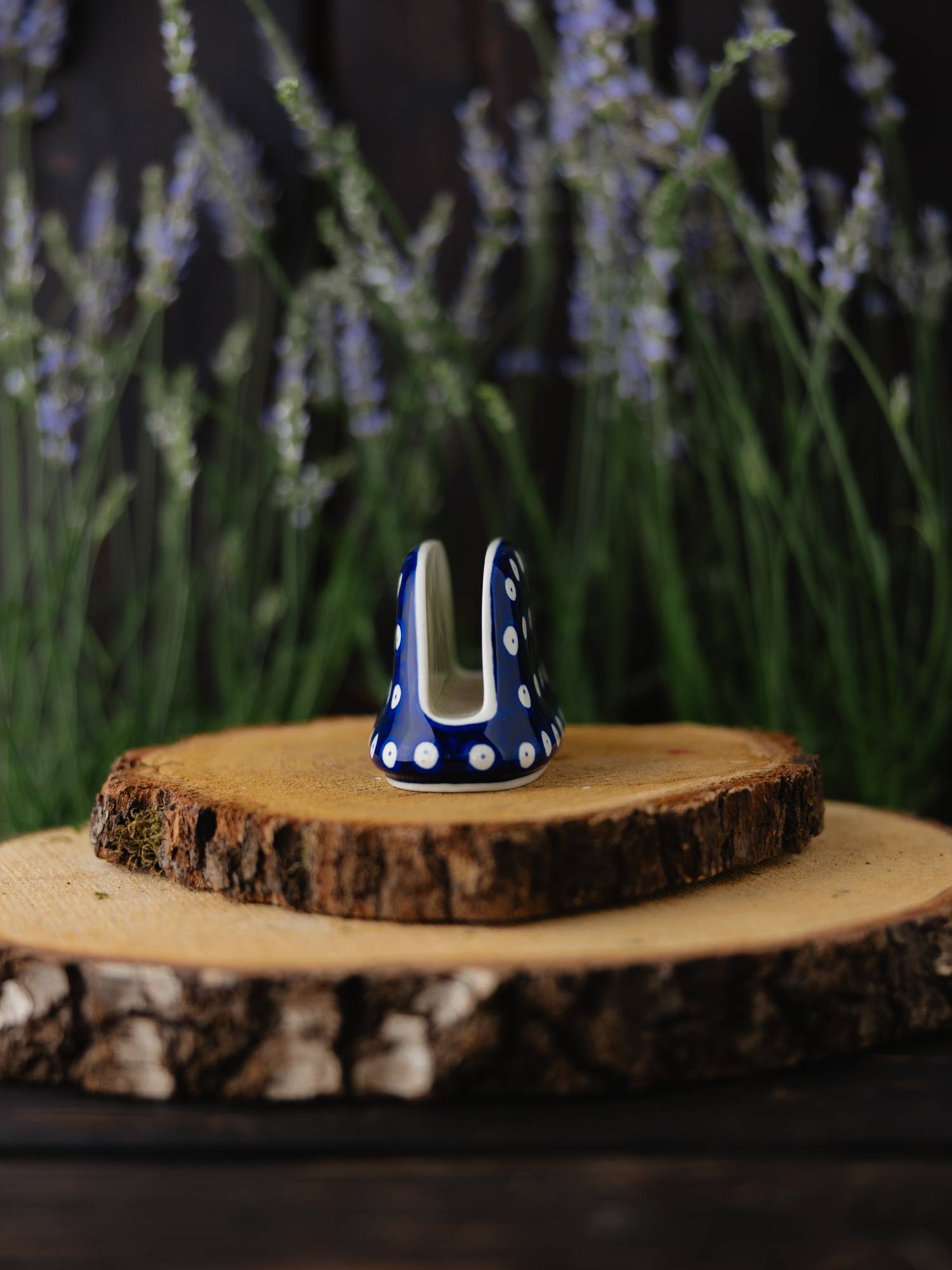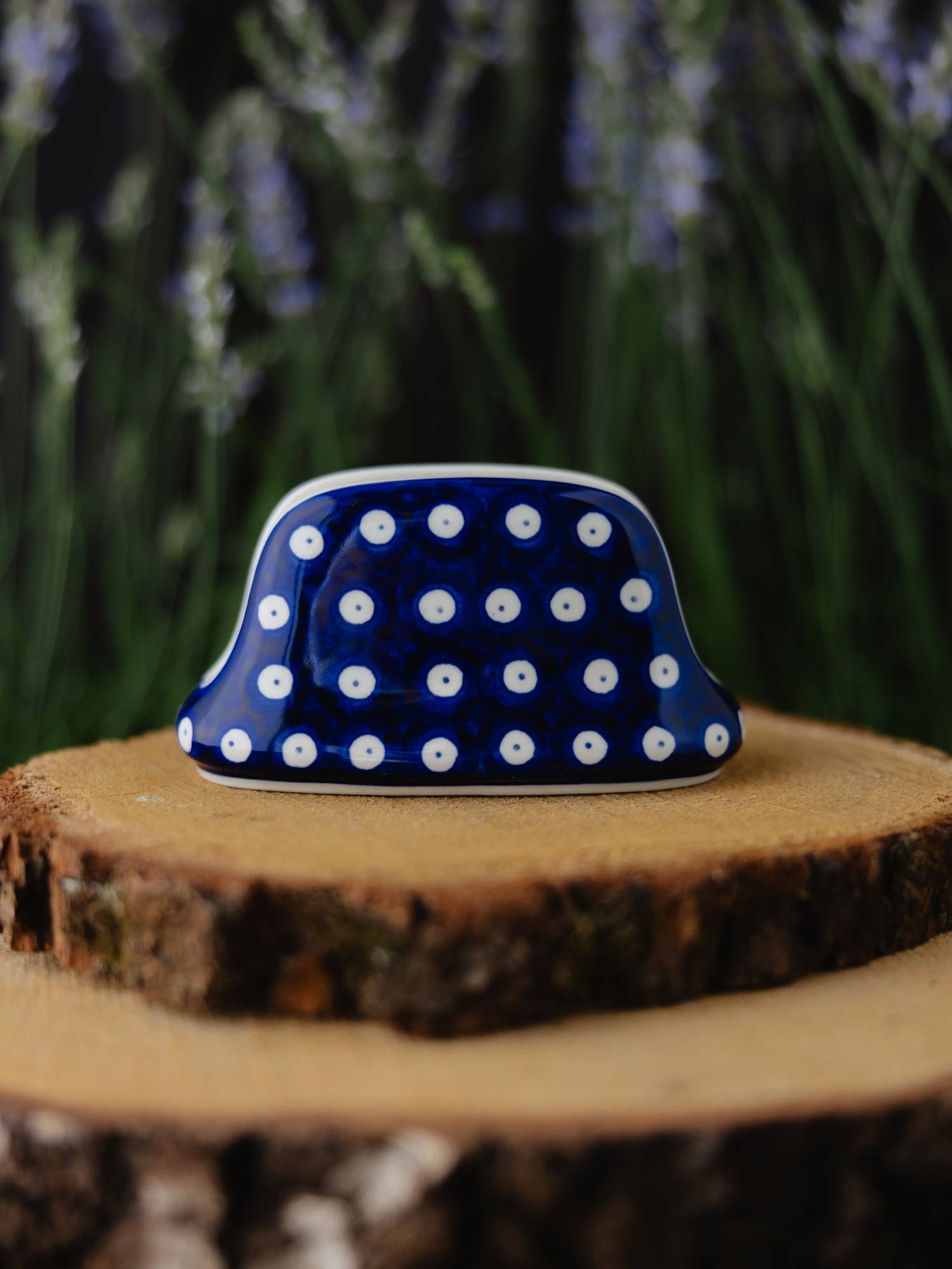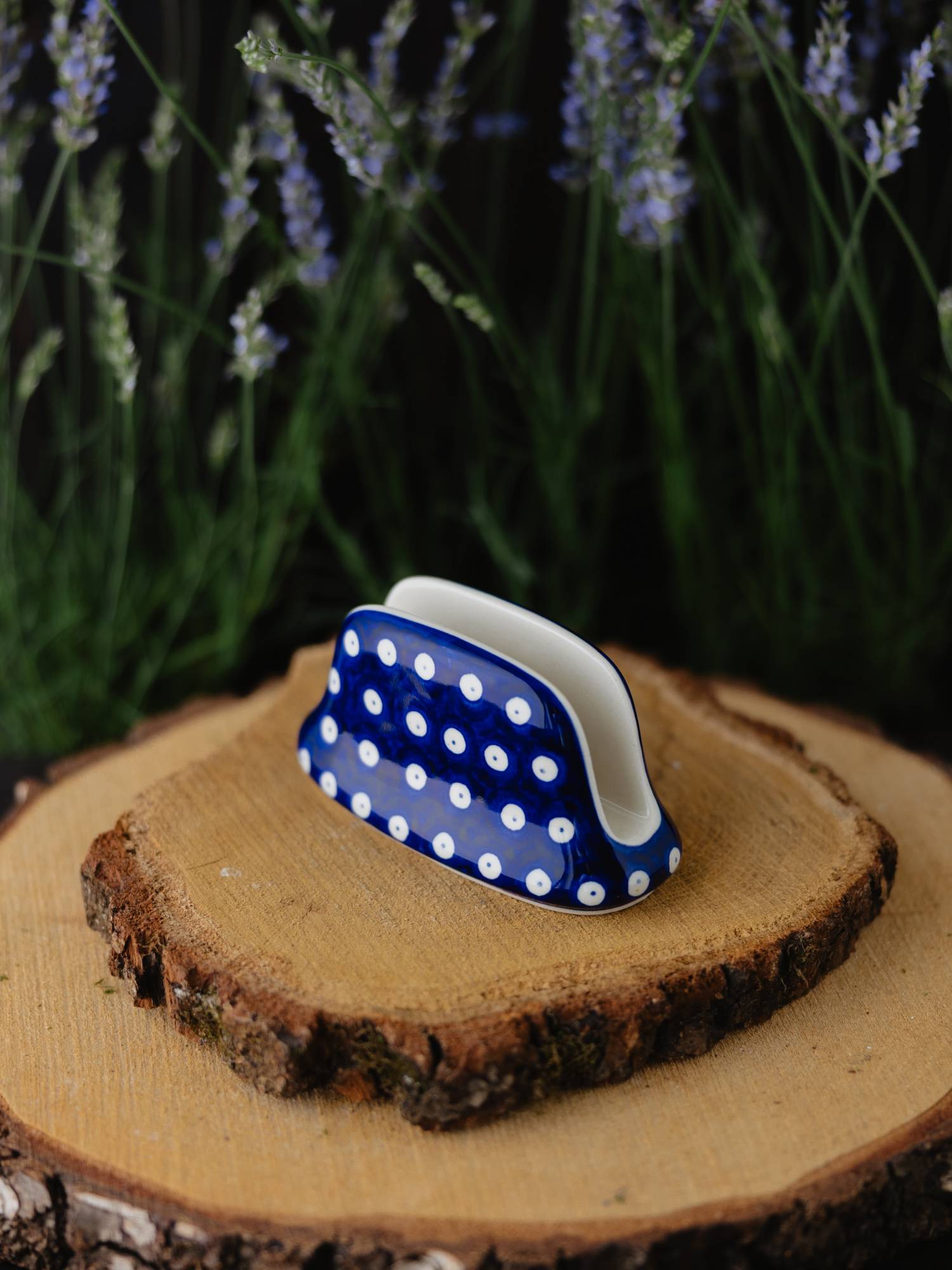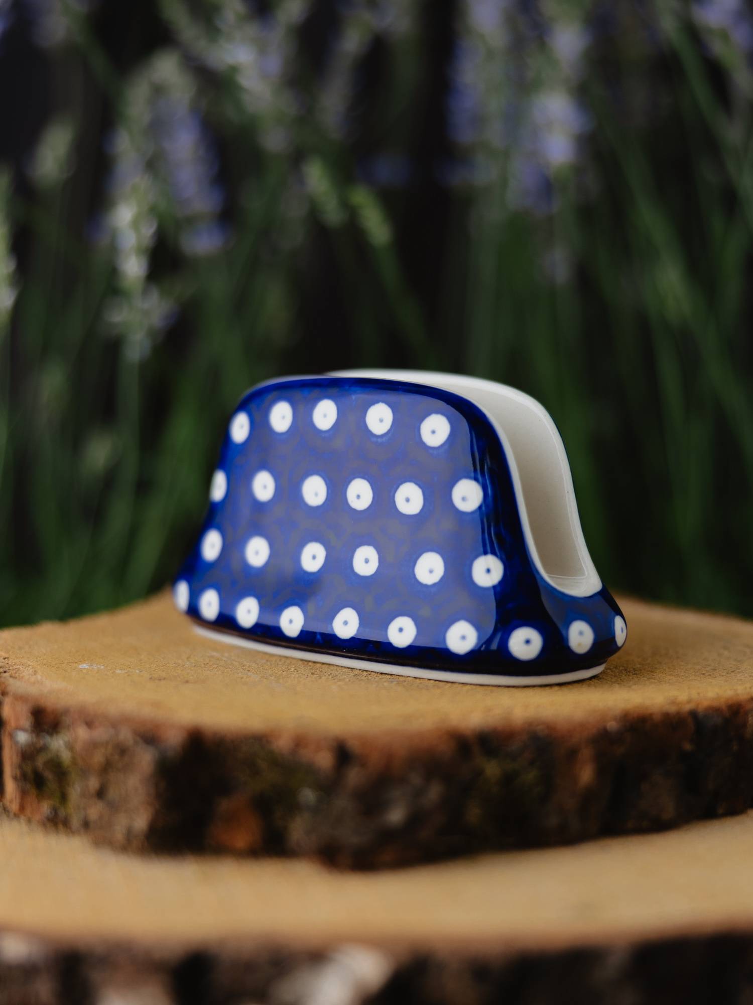 Ceramiczny serwetnik o klasycznym, prostym kształcie, ozdobiony muzealnym, kobaltowym wzorem groszków.