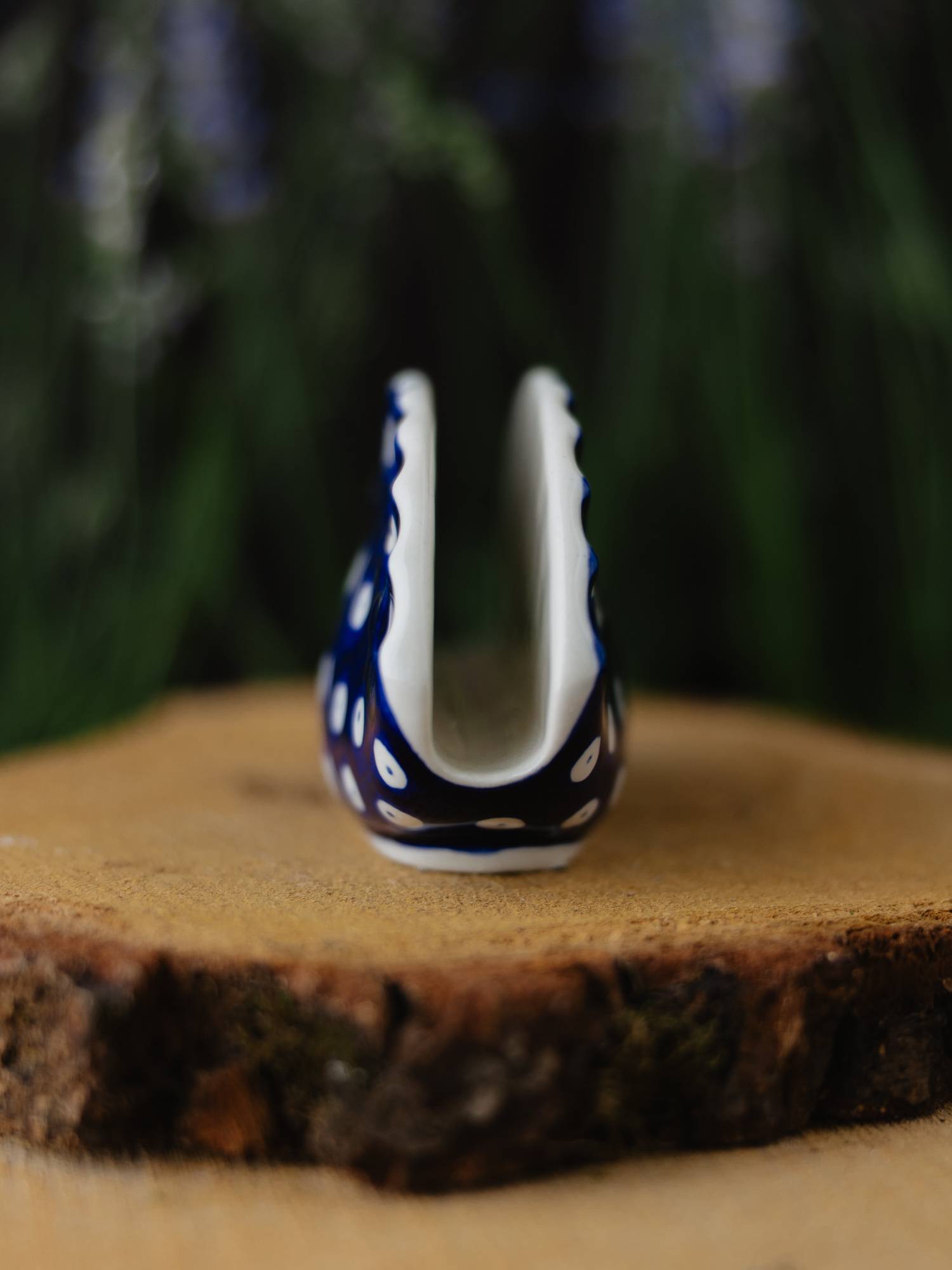 Serwetnik w nietypowym, owalnym kształcie przypominającym pieroga. Jasna ceramika została ozdobiona ręcznie, kobaltowym wzorem groszków. Delikatne rozszerzenie ku podstawie zapewnia stabilność całości, a szeroka wnęka sprawia, że pomieści wiele serwetek lub chusteczek. Serwetnik został wykonany w „Ceramice Artystycznej” w Bolesławcu.