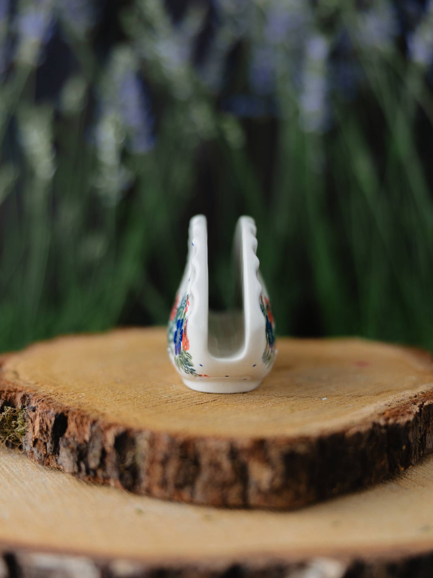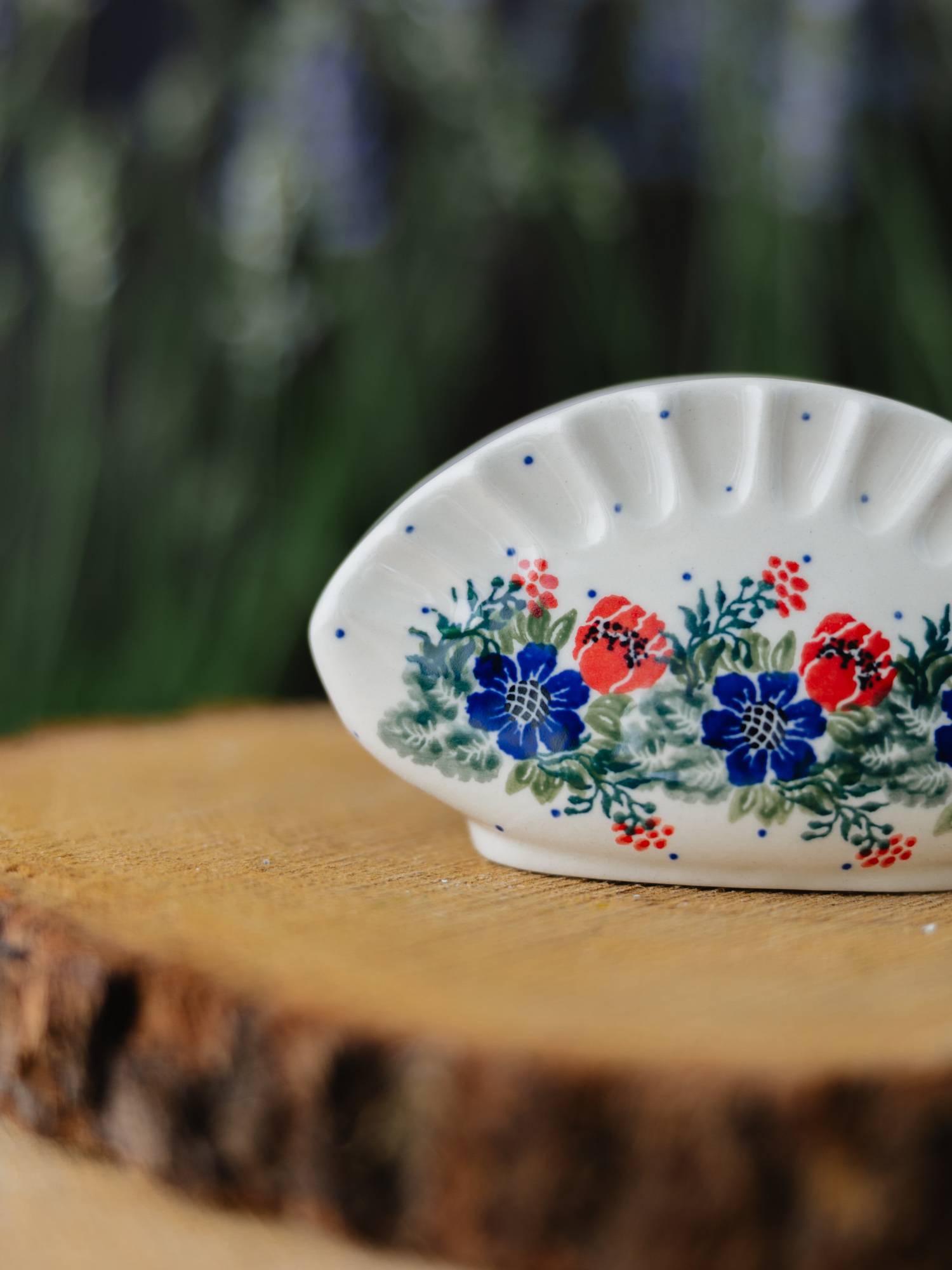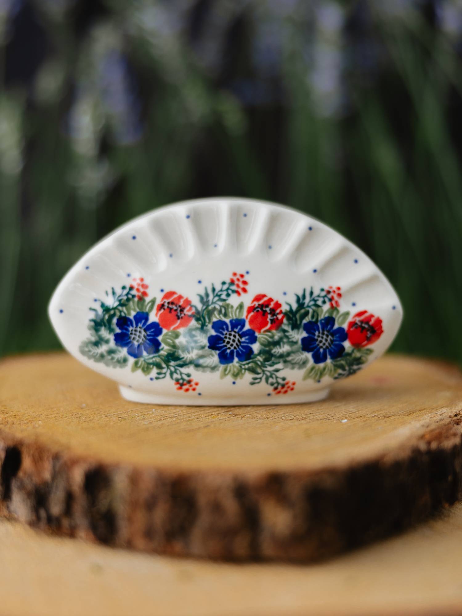 Serwetnik w nietypowym, owalnym kształcie przypominającym pieroga. Jasna ceramika została ozdobiona ręcznie, zielono-kobaltowym wzorem wianka z czerwonymi makami. Delikatne rozszerzenie ku podstawie zapewnia stabilność całości, a szeroka wnęka sprawia, że pomieści wiele serwetek lub chusteczek. Serwetnik został wykonany w „Ceramice Artystycznej” w Bolesławcu.