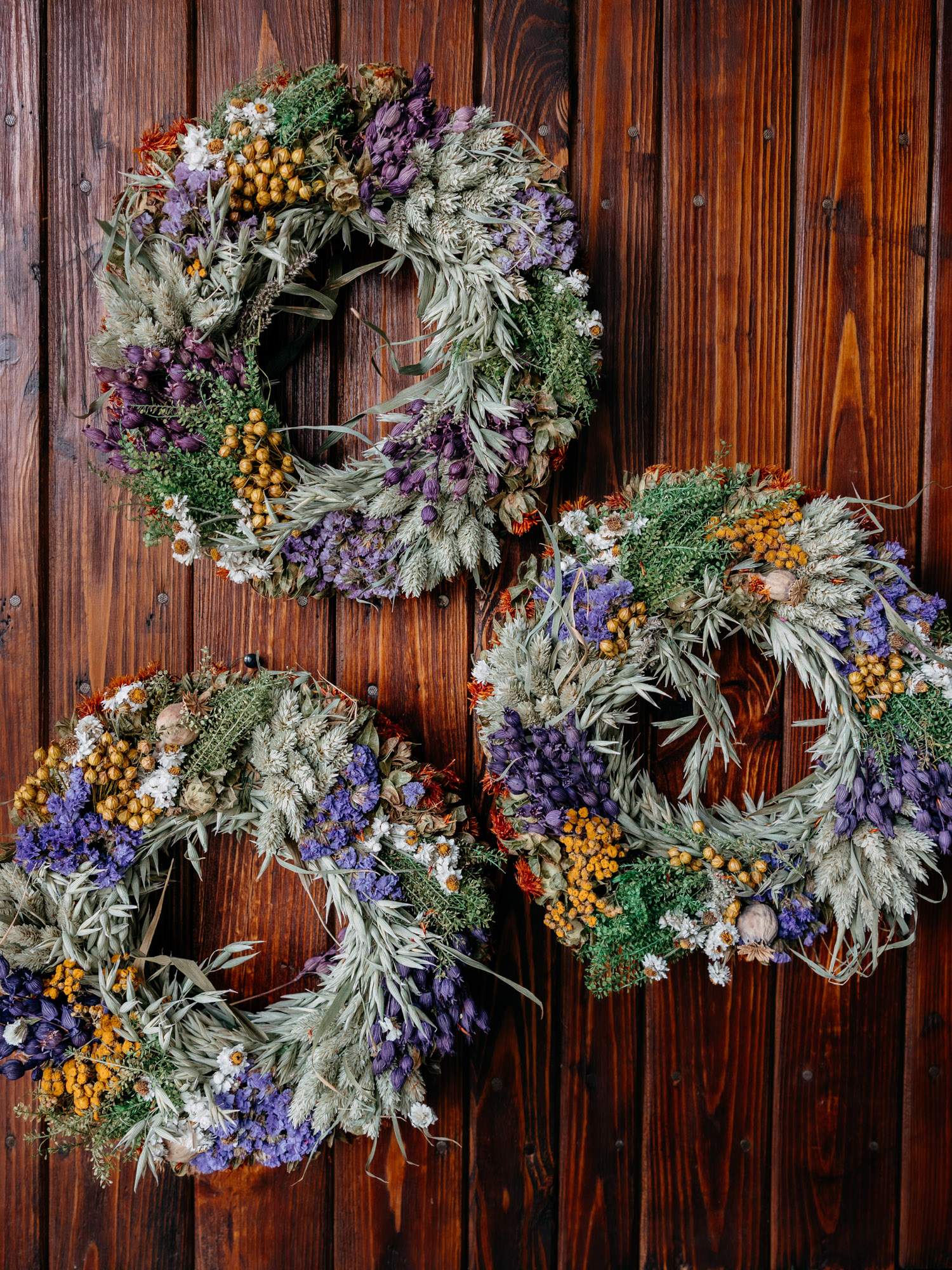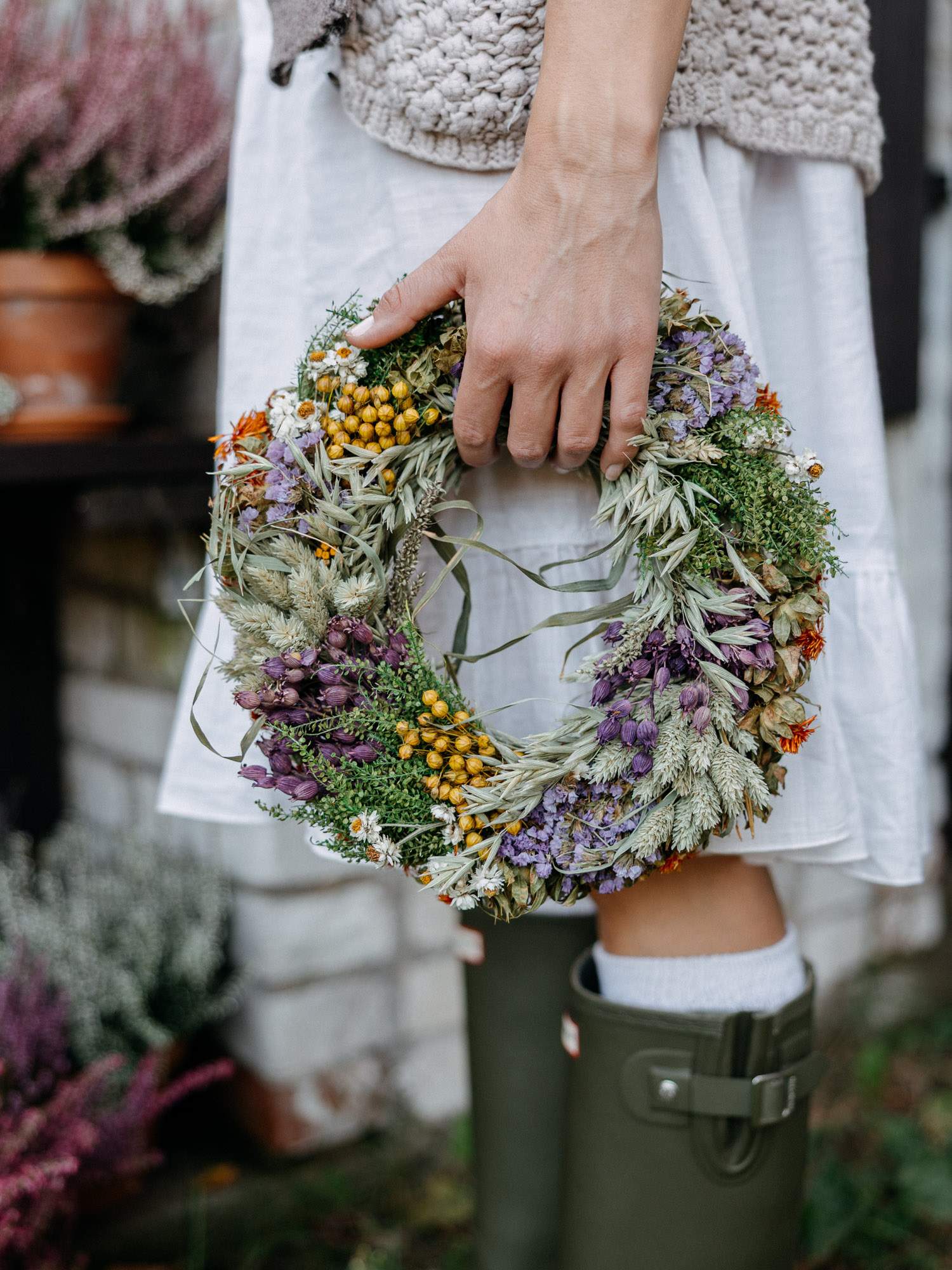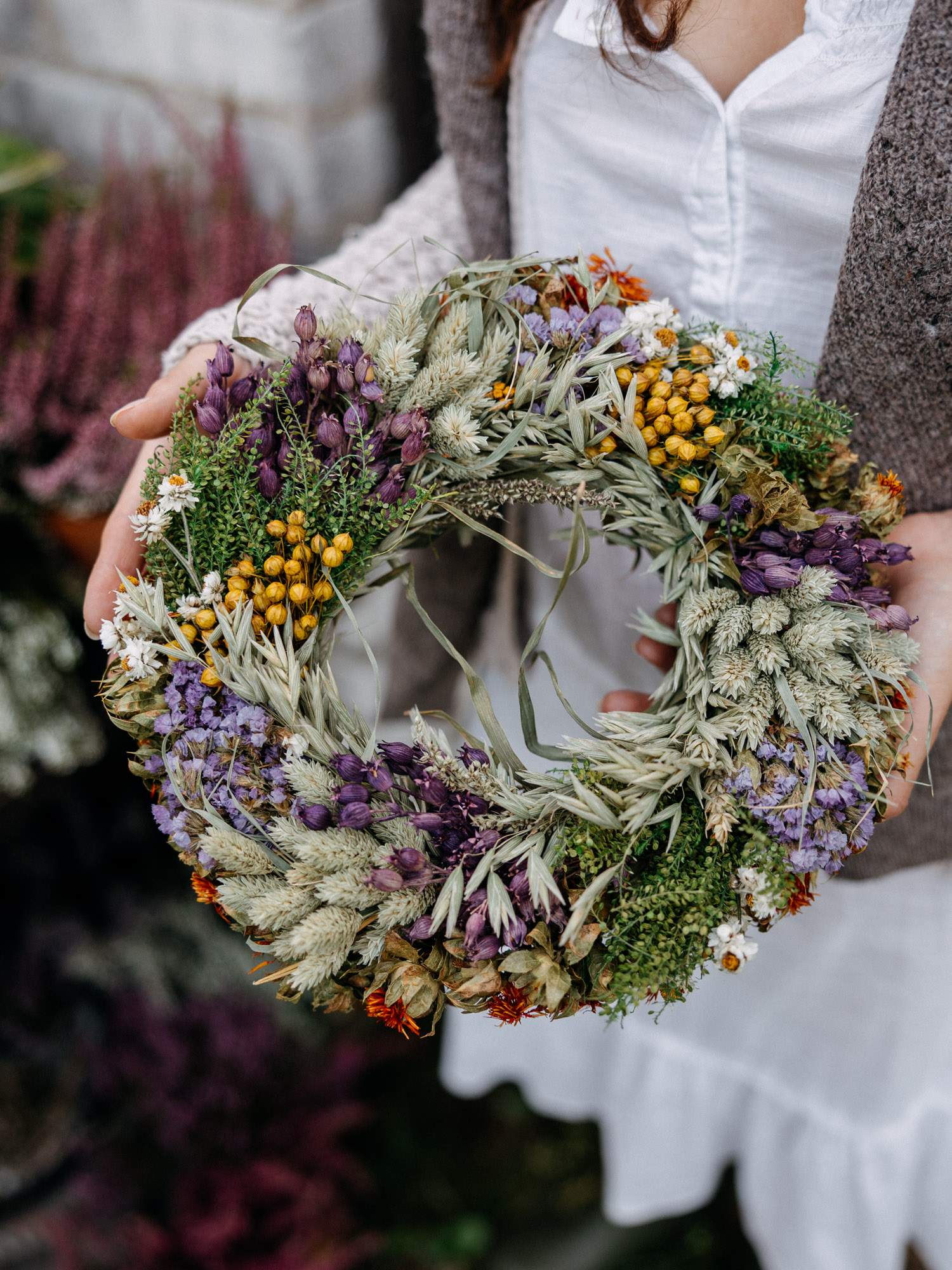 Wykonany ręcznie okrągły wianek z naturalnych suszonych roślin w odcieniach jasnej zieleni, fioletowo-białych kwiatów oraz z żółtymi akcentami. Wianek ma formę klasycznego okręgu z wolnym środkiem. Dzięki naturalnym suszonym roślinom wianek posłuży przez wiele miesięcy. Idealny do powieszenia, na prezent lub jako ozdoba stołu. Wianki mogą różnić się w odcieniach.