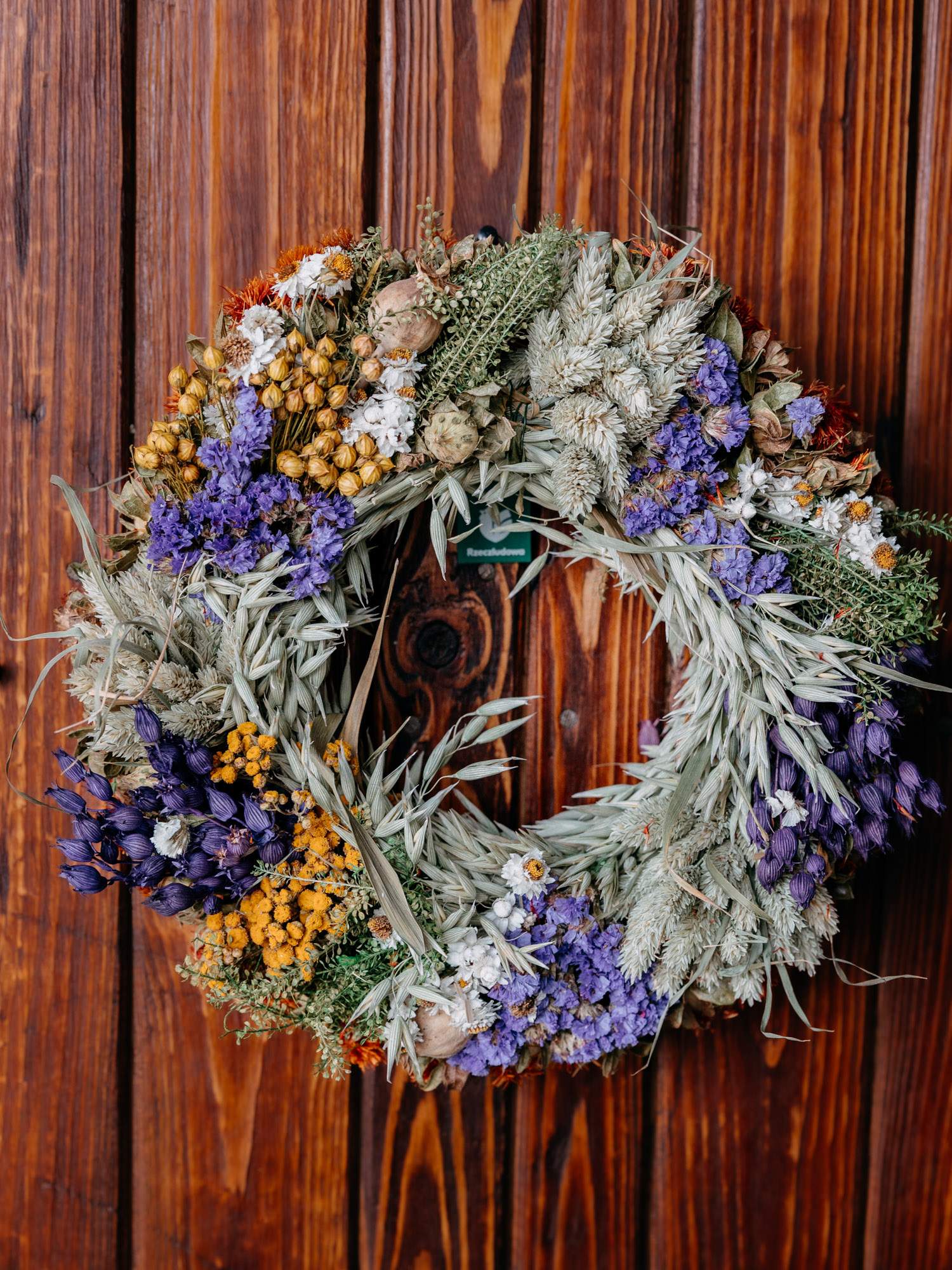 Ręcznie pleciony, suszony wianek, wykonany z naturalnych roślin oraz z fioletowo-białych kwiatów.