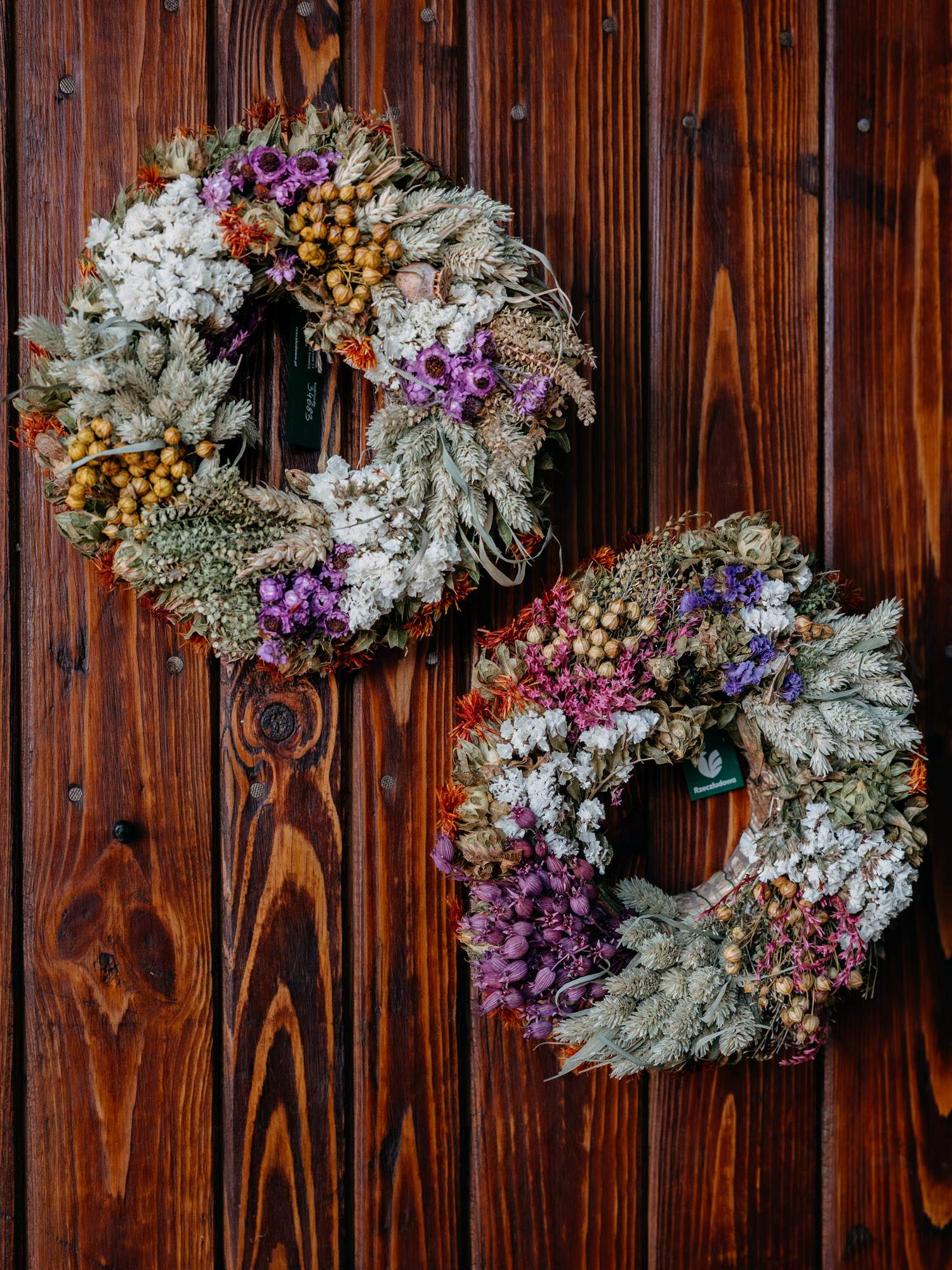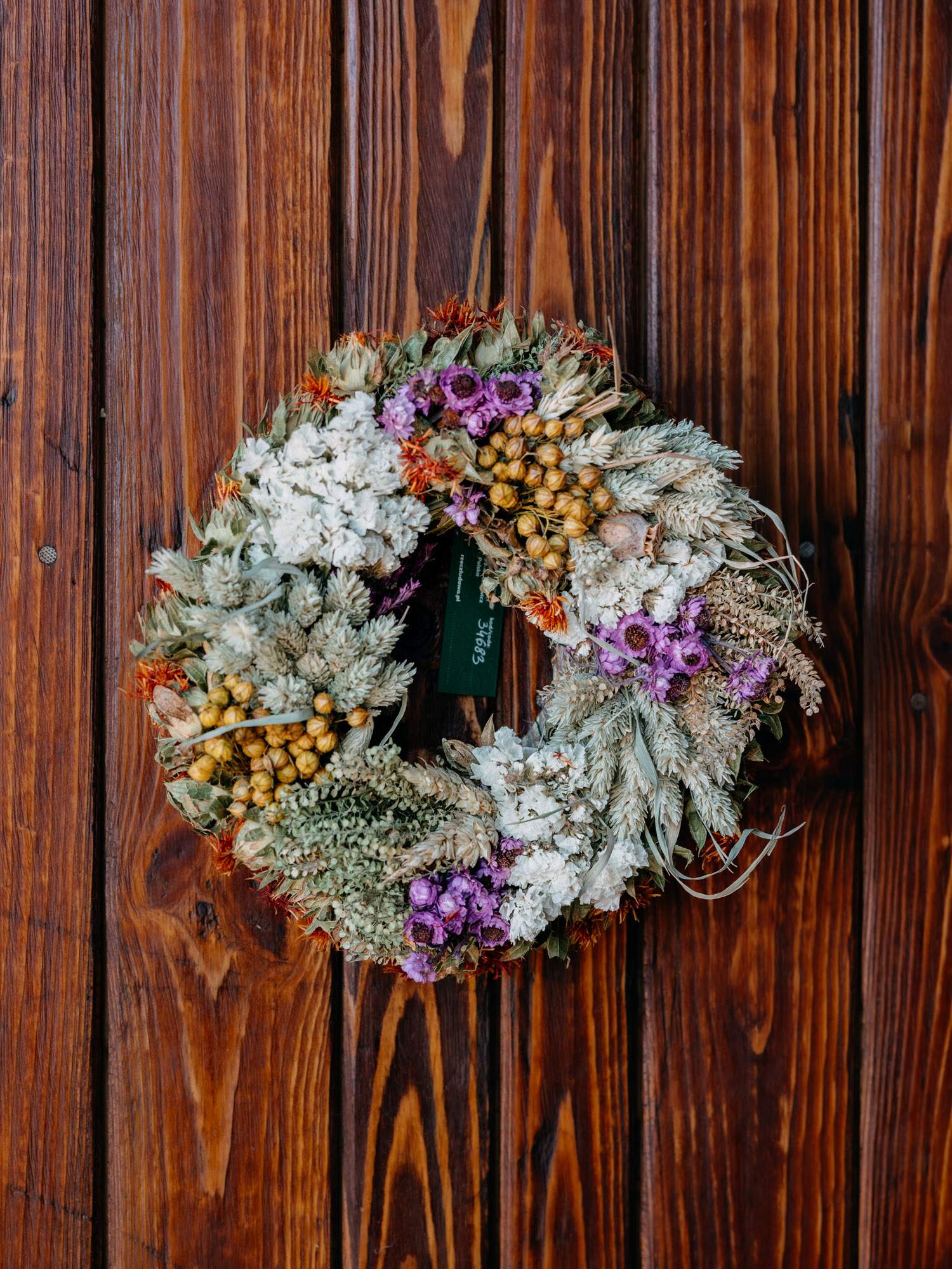 Ręcznie wykonany mały, okrągły wianek z suszonych roślin.