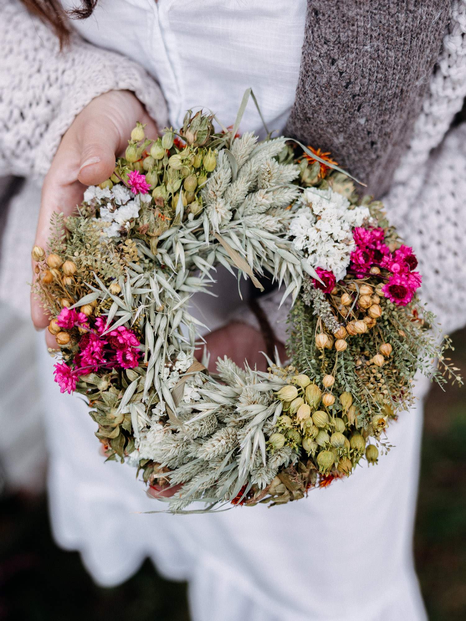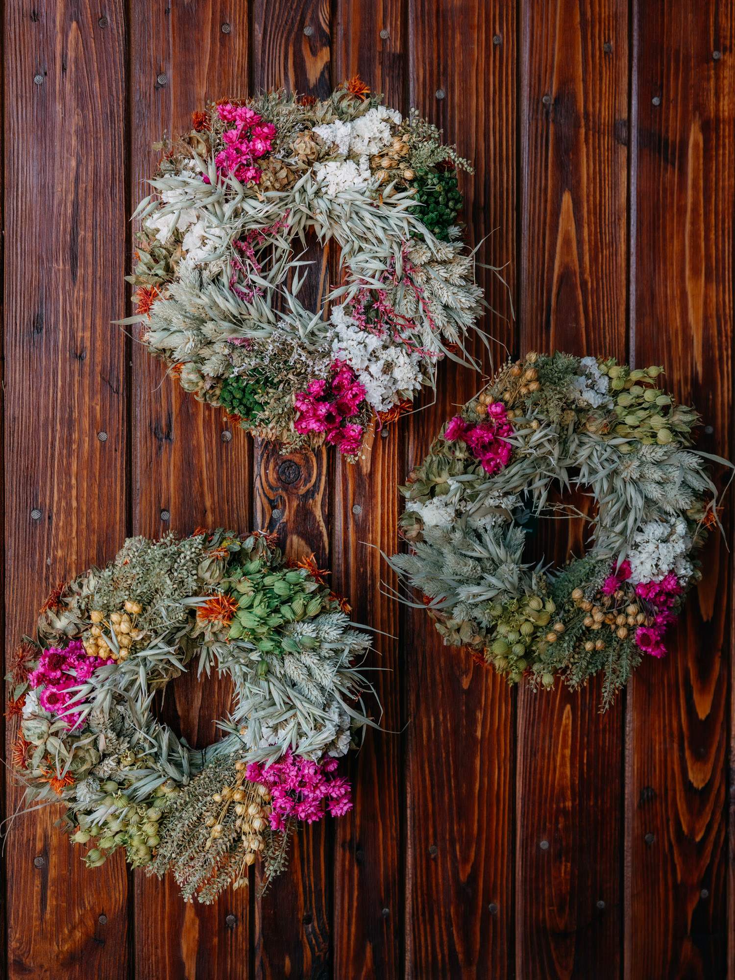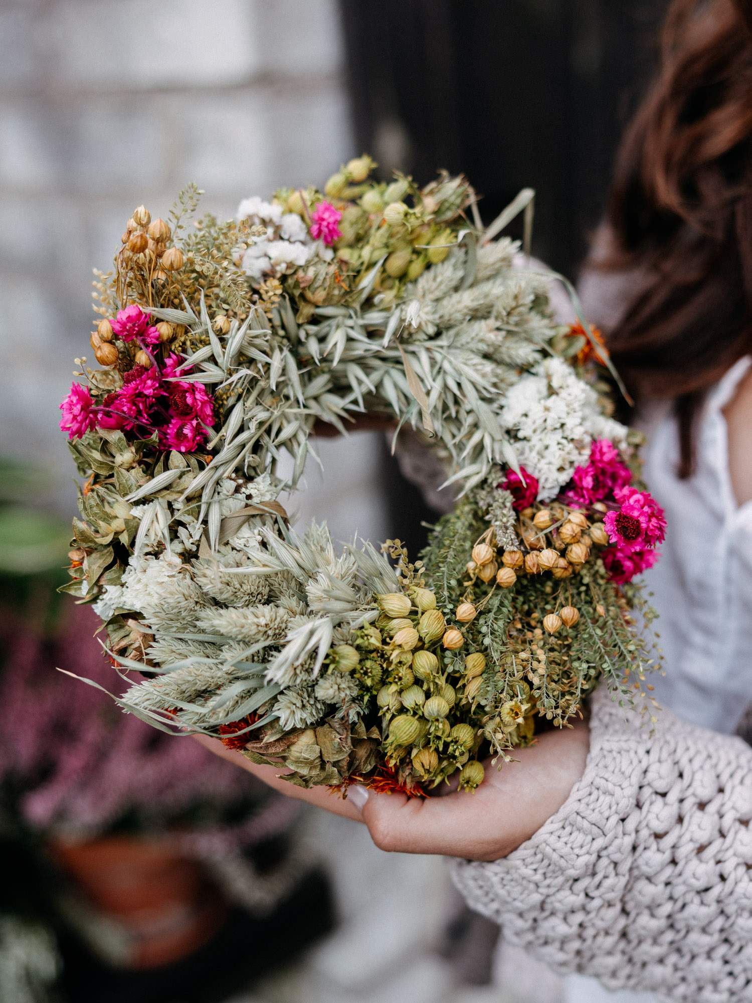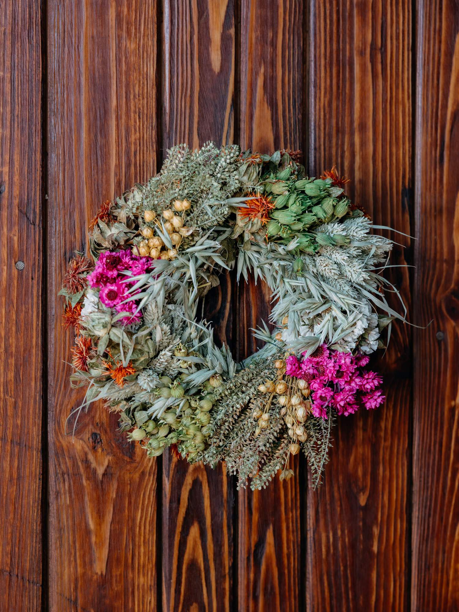 Delikatna kompozycja wykonana z naturalnych suszonych roślin i różowo-białych kwiatków. Wianek ma formę klasycznego okręgu z wolnym środkiem. Dzięki naturalnym suszonym roślinom wianek posłuży przez wiele miesięcy. Mały rozmiar sprawia, że doskonale nadaje się do powieszenia, na prezent lub jako ozdoba stołu. Wianki mogą różnić się w odcieniach.