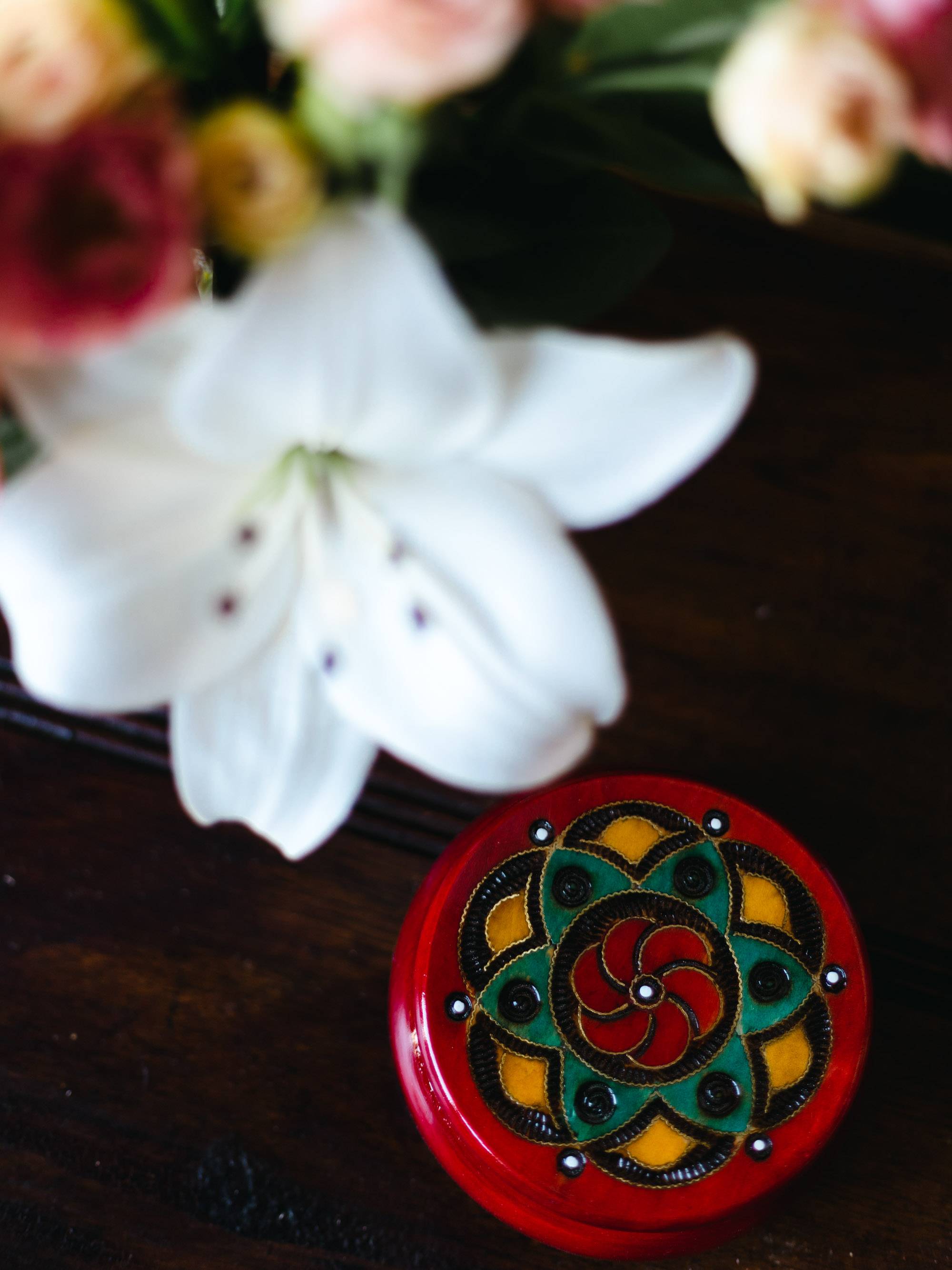 Ręcznie wykonana drewniana szkatułka w czerwonym kolorze, o średnicy 12 cm, z rzeźbionym wieczkiem.