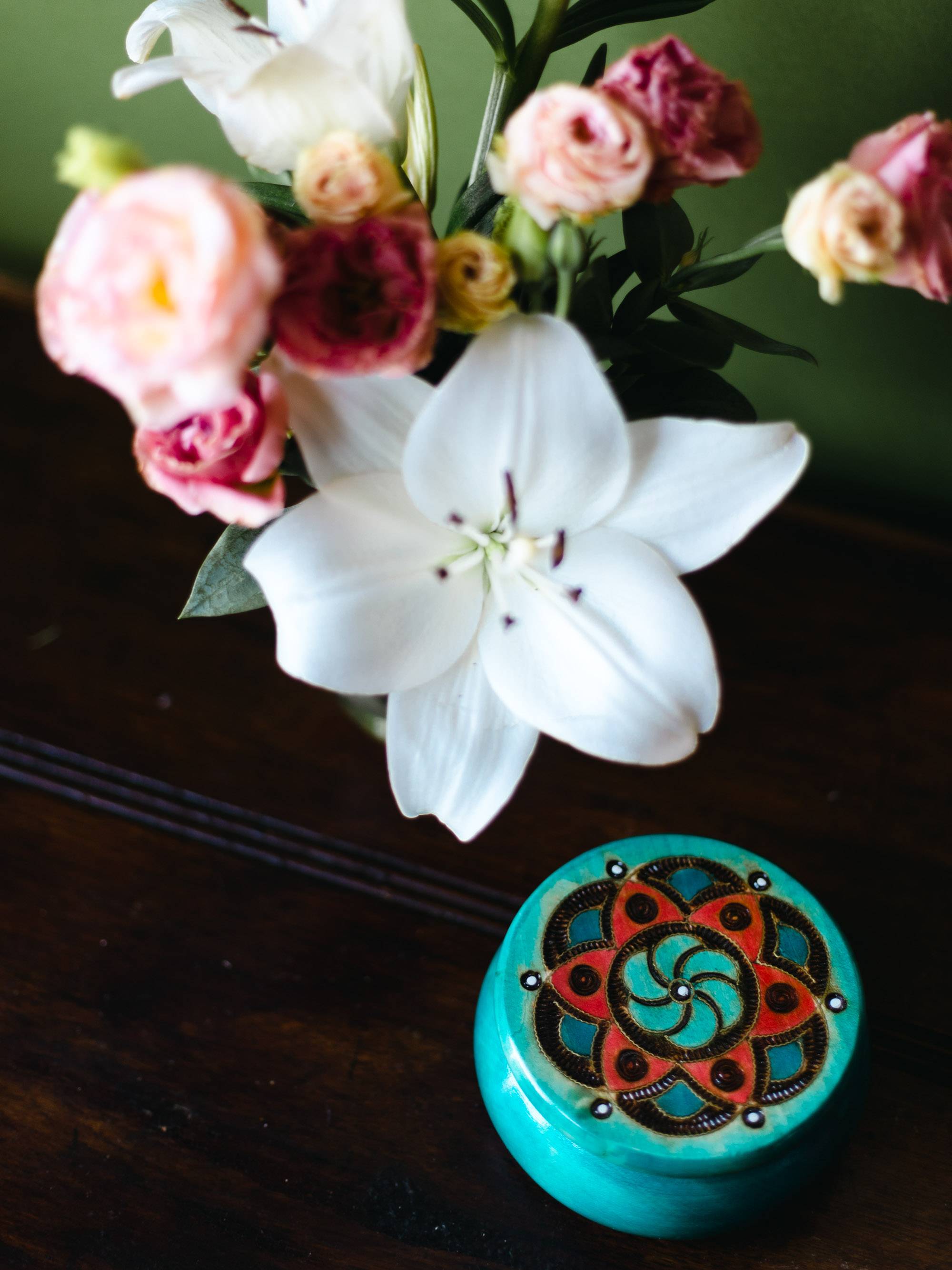 Ręcznie wykonana drewniana szkatułka w turkusowym kolorze, o średnicy 12 cm, z rzeźbionym wieczkiem.