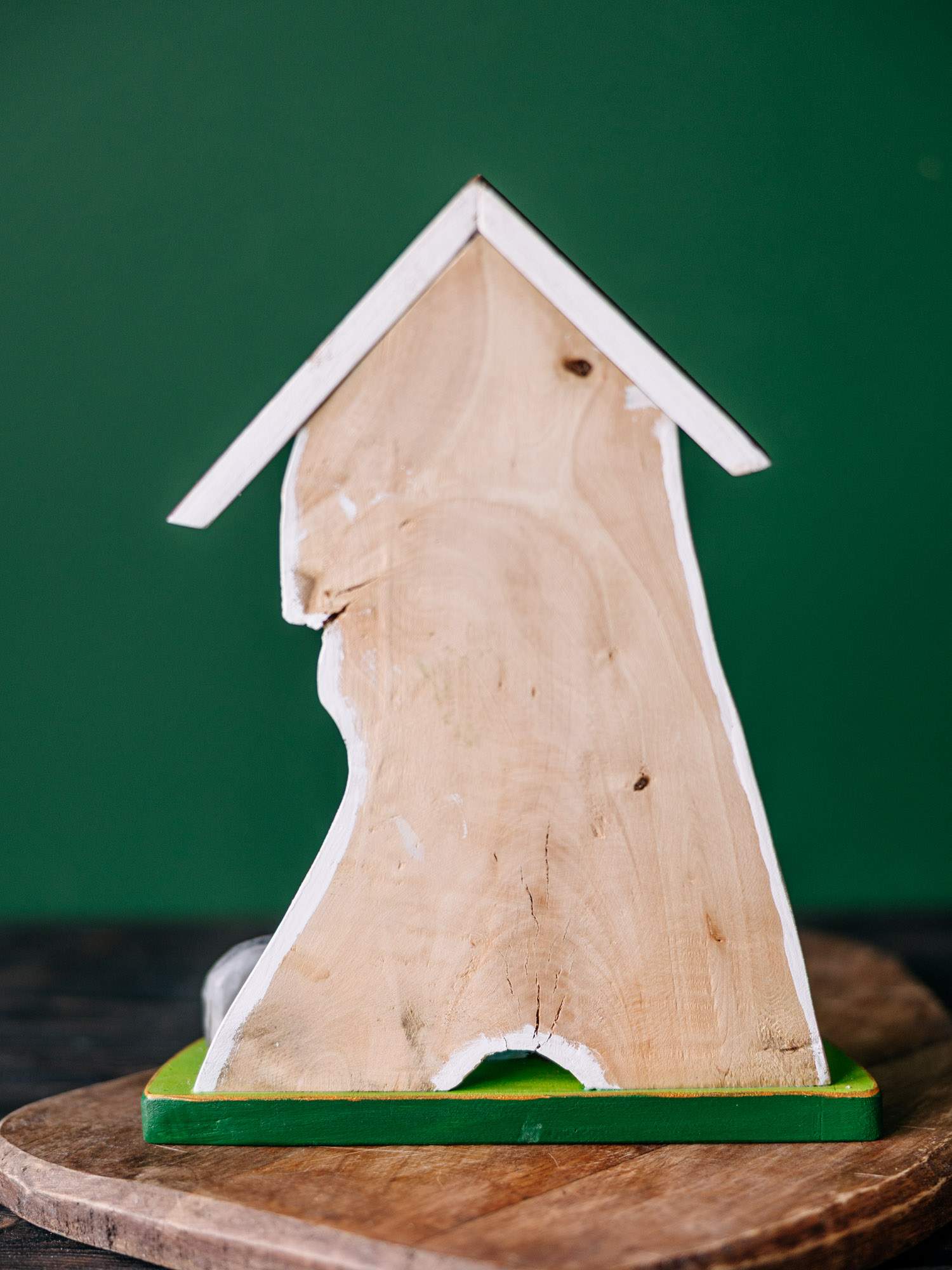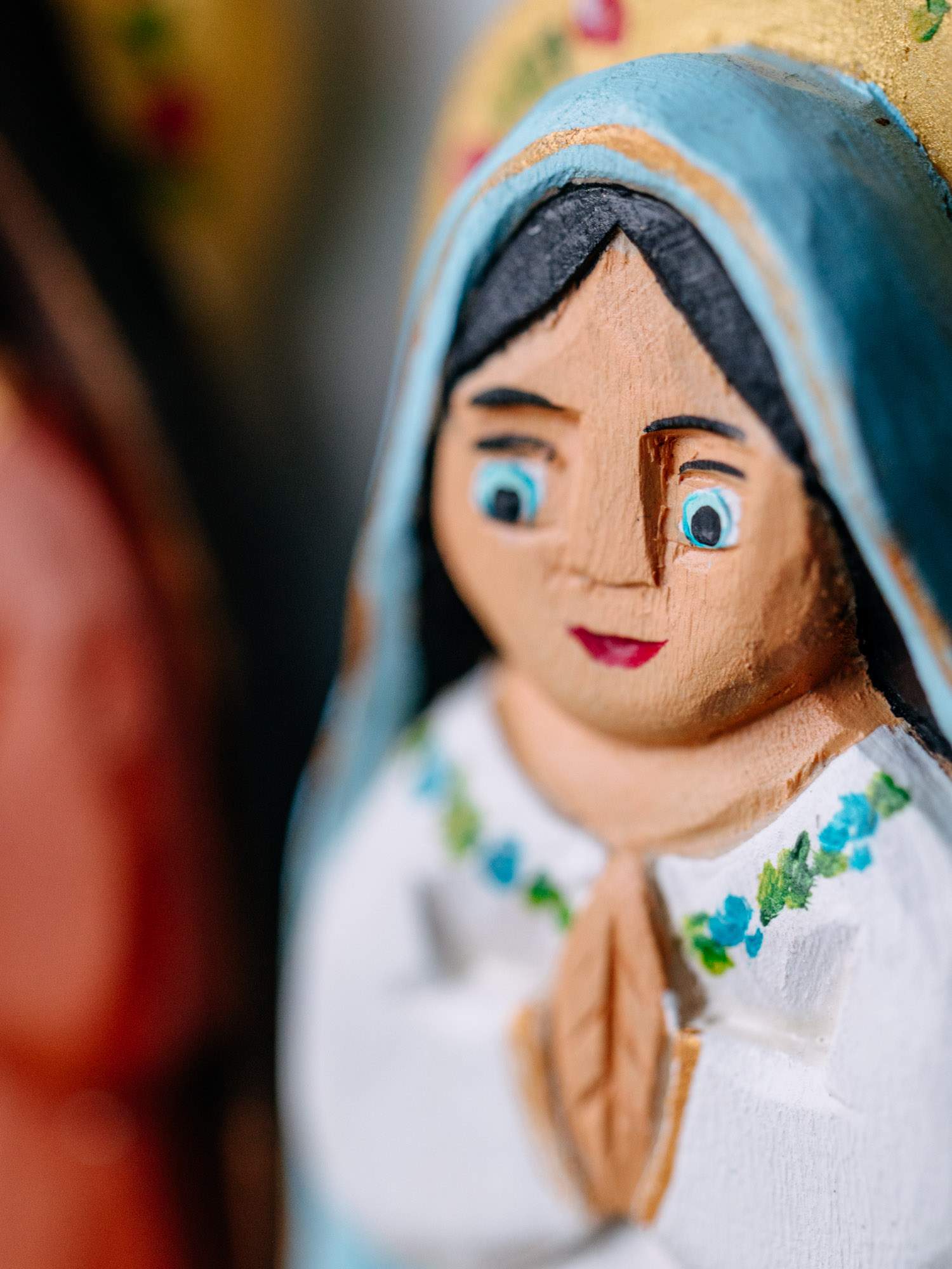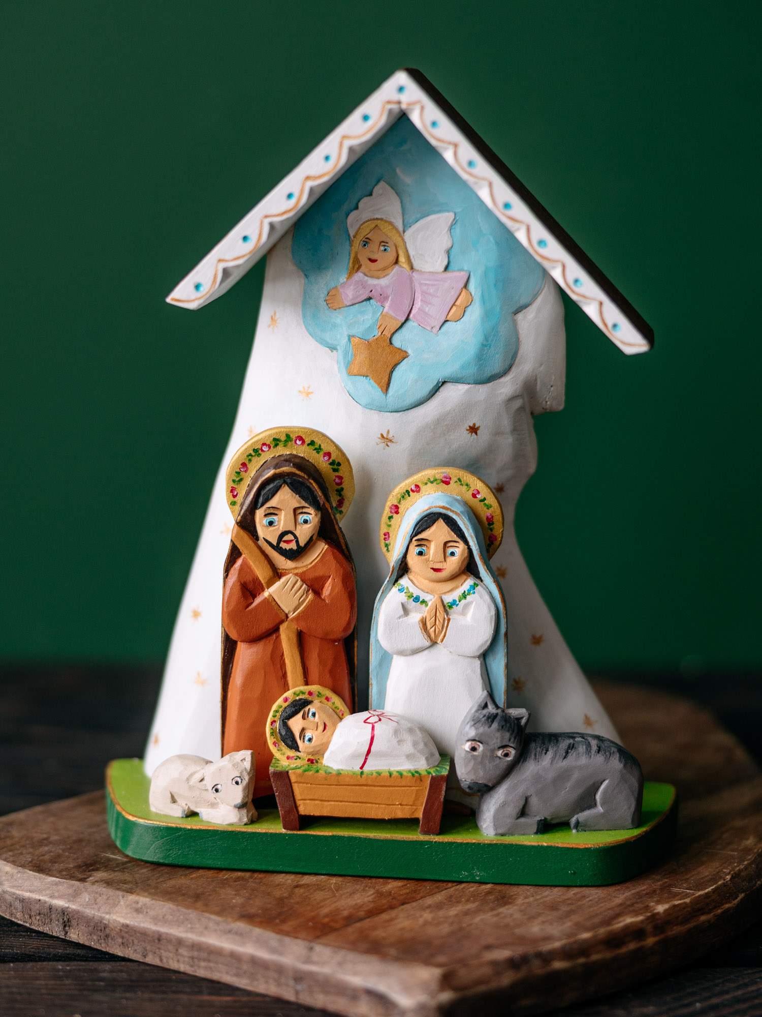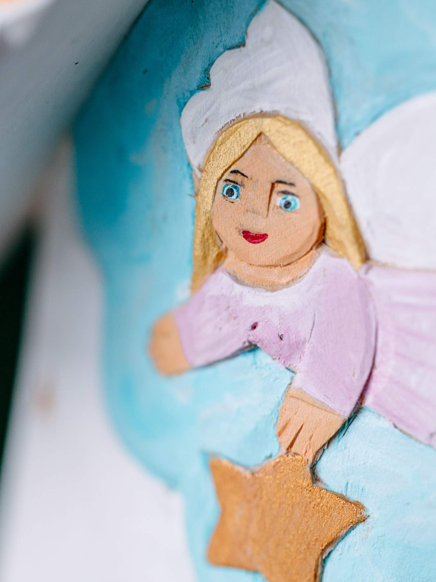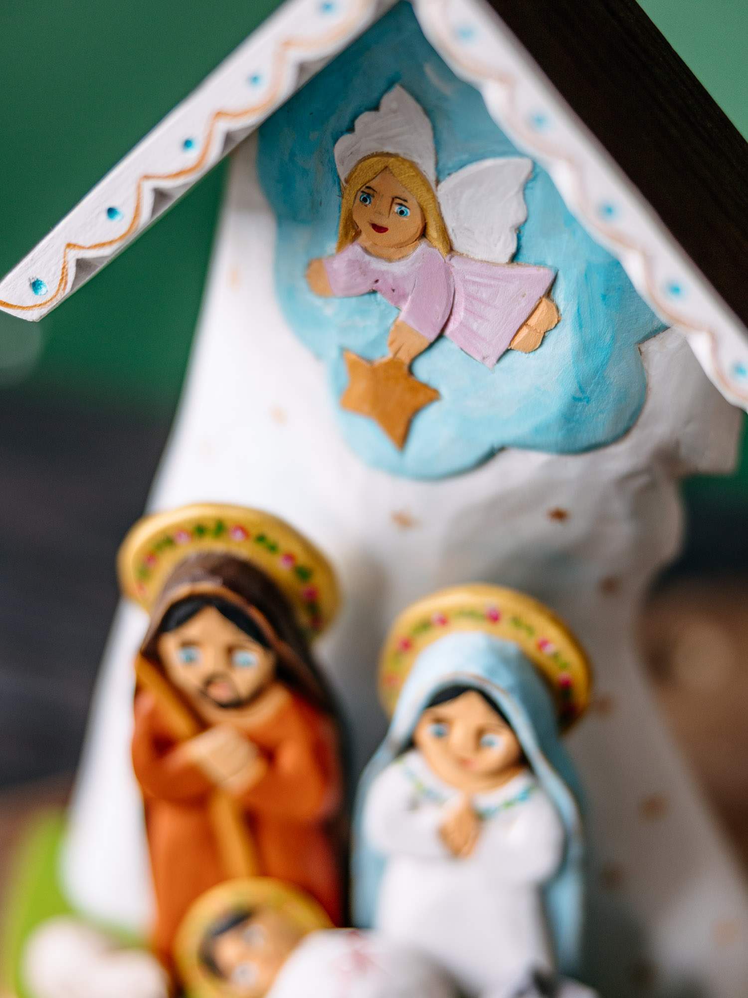 Ręcznie wykonana szopka bożonarodzeniowa, przedstawiająca scenę narodzin Jezusa. W kompozycji znajdują się postacie Maryi, Józefa, Dzieciątka oraz zwierzęta. Nad głowami Świętymi znajdują się aureole, ozdobione kwiatowymi elementami. W górnej części został uwieczniony aniołek w różowej sukience, trzymający w dłoni gwiazdkę, znajdujący się na niebieskiej chmurce.