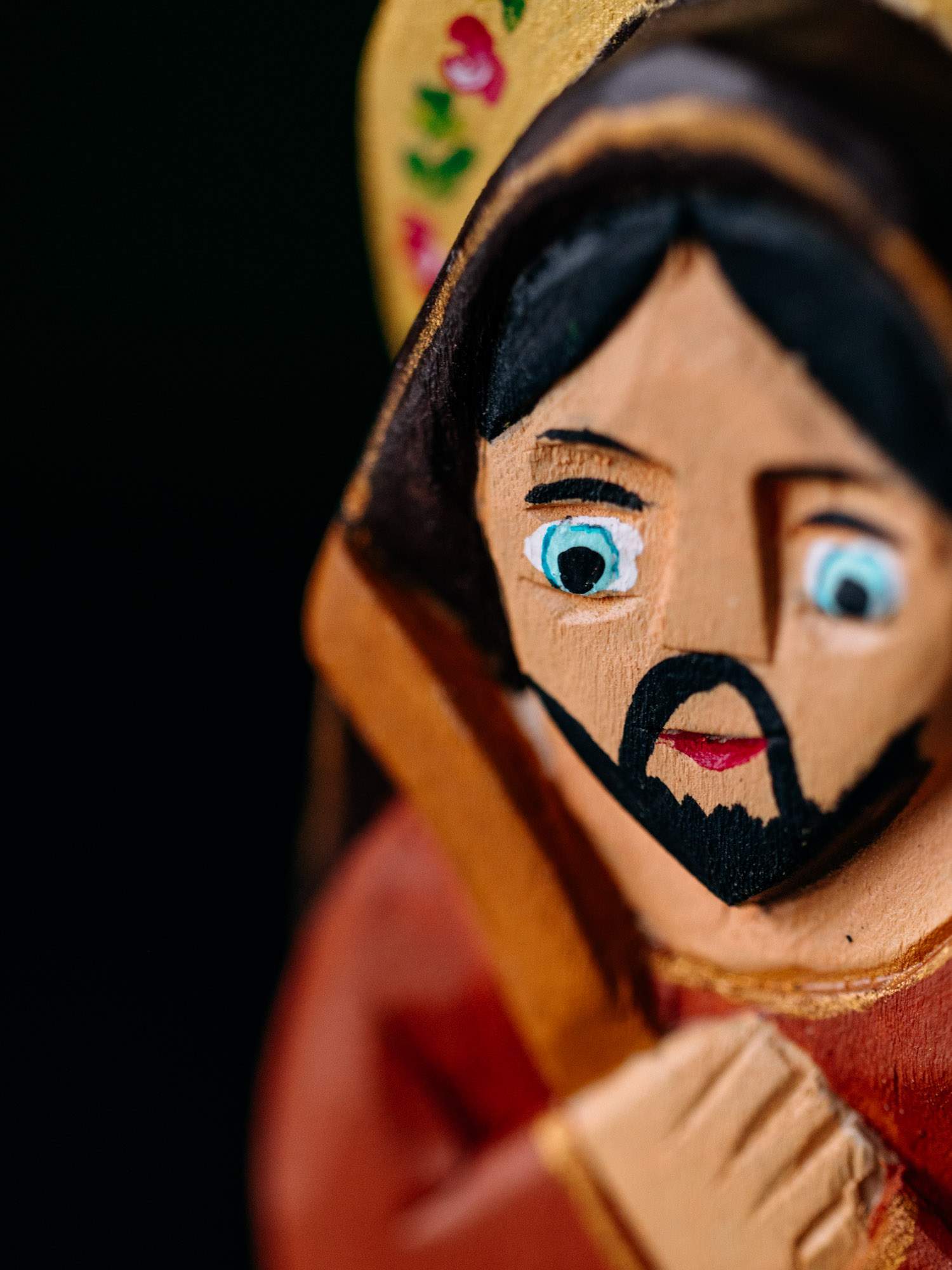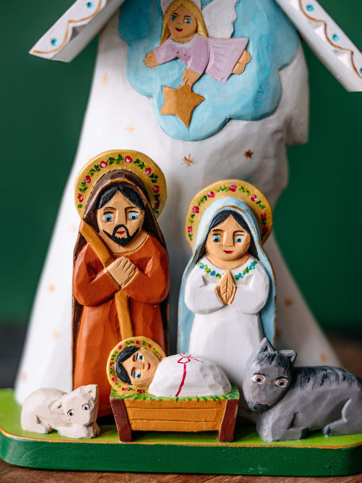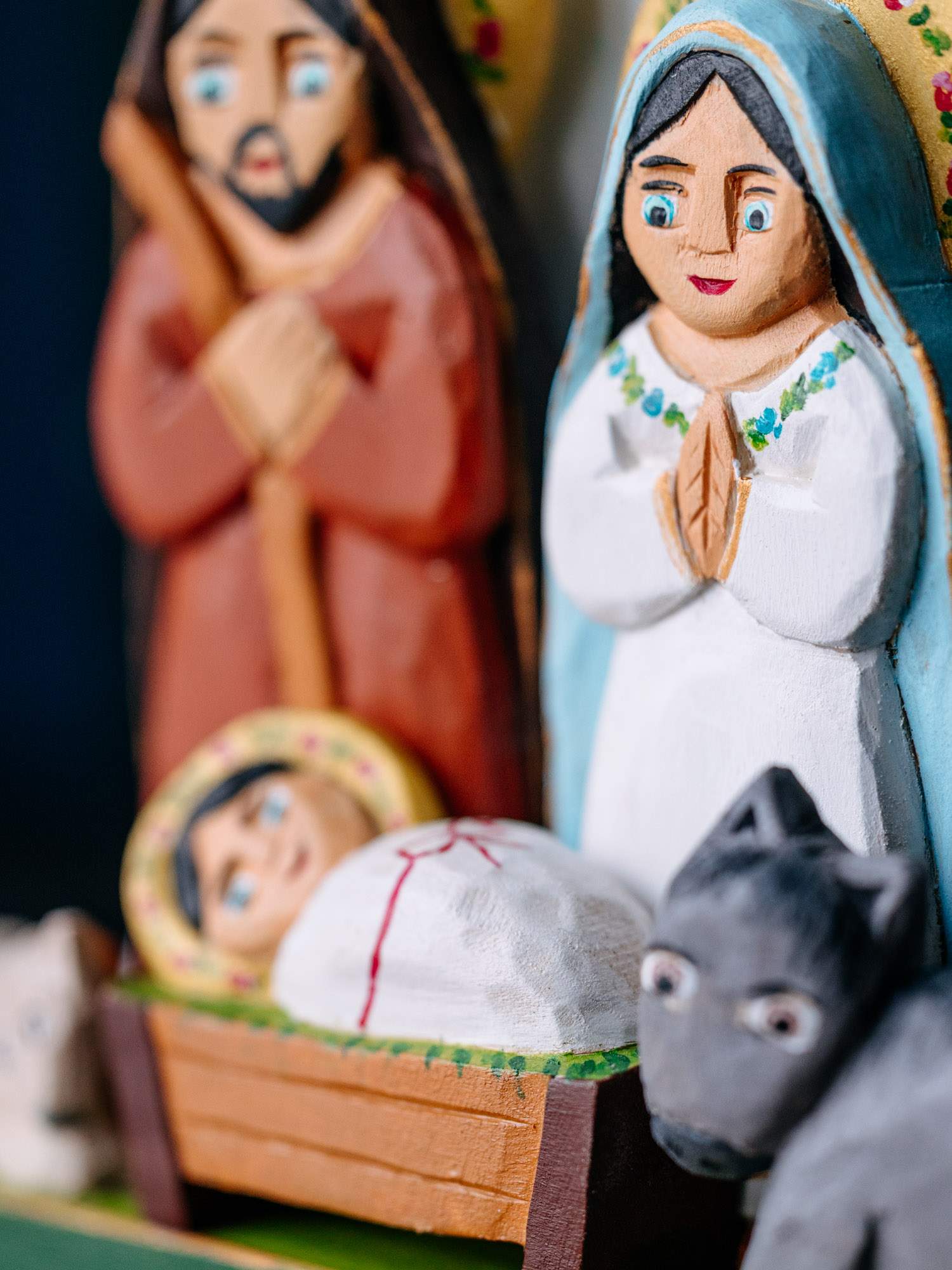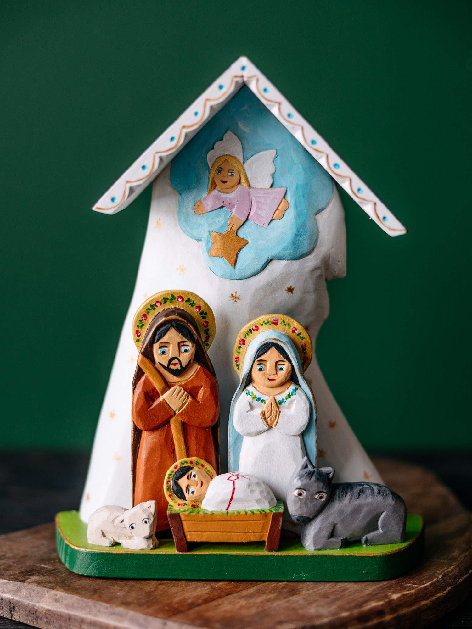 Drewniana szopka bożonarodzeniowa z postaciami Świętej Rodziny i zwierząt.