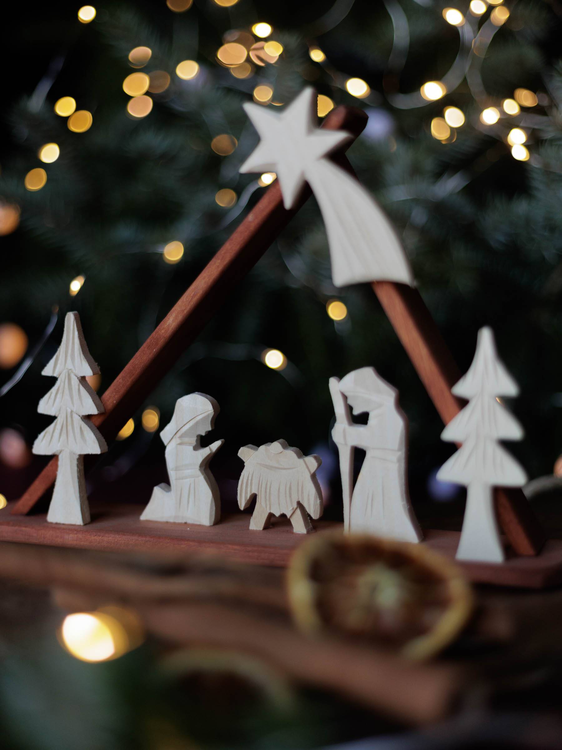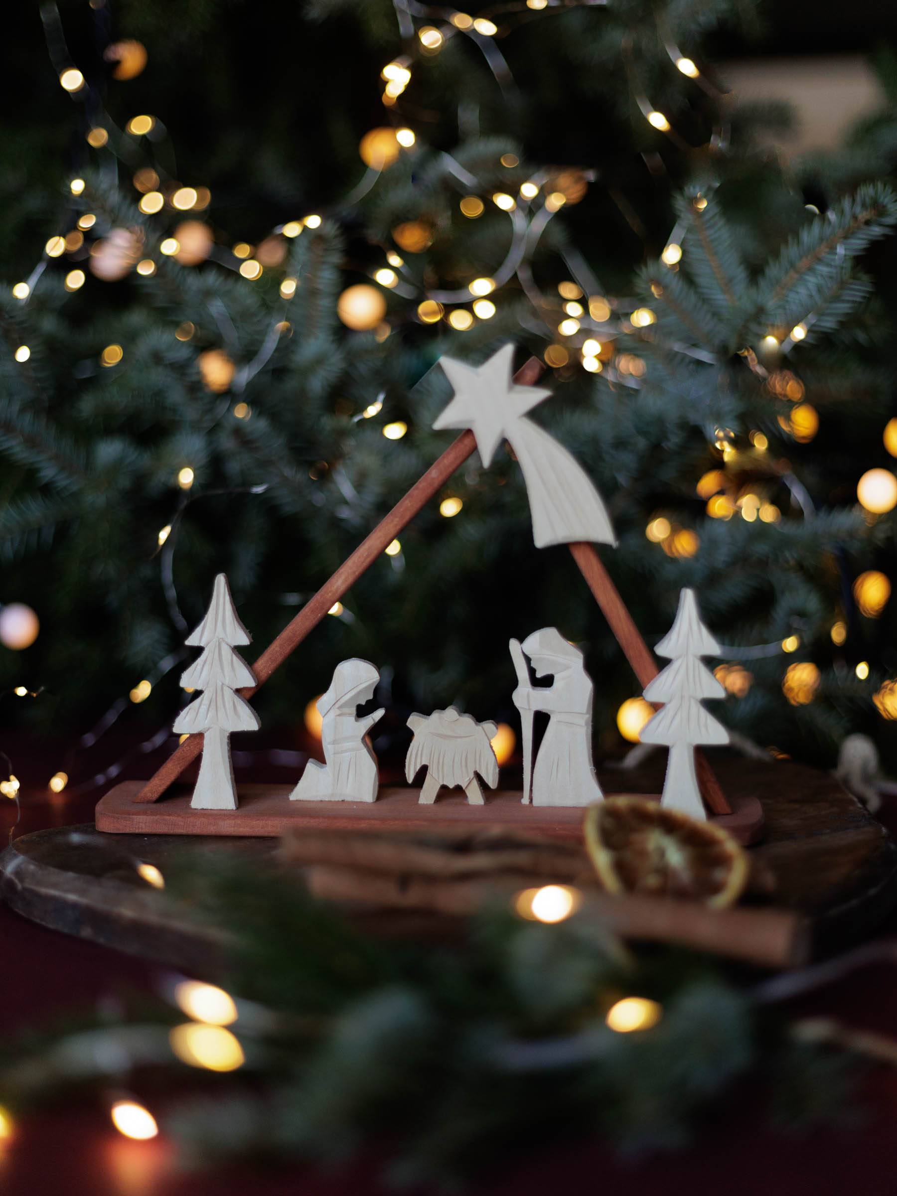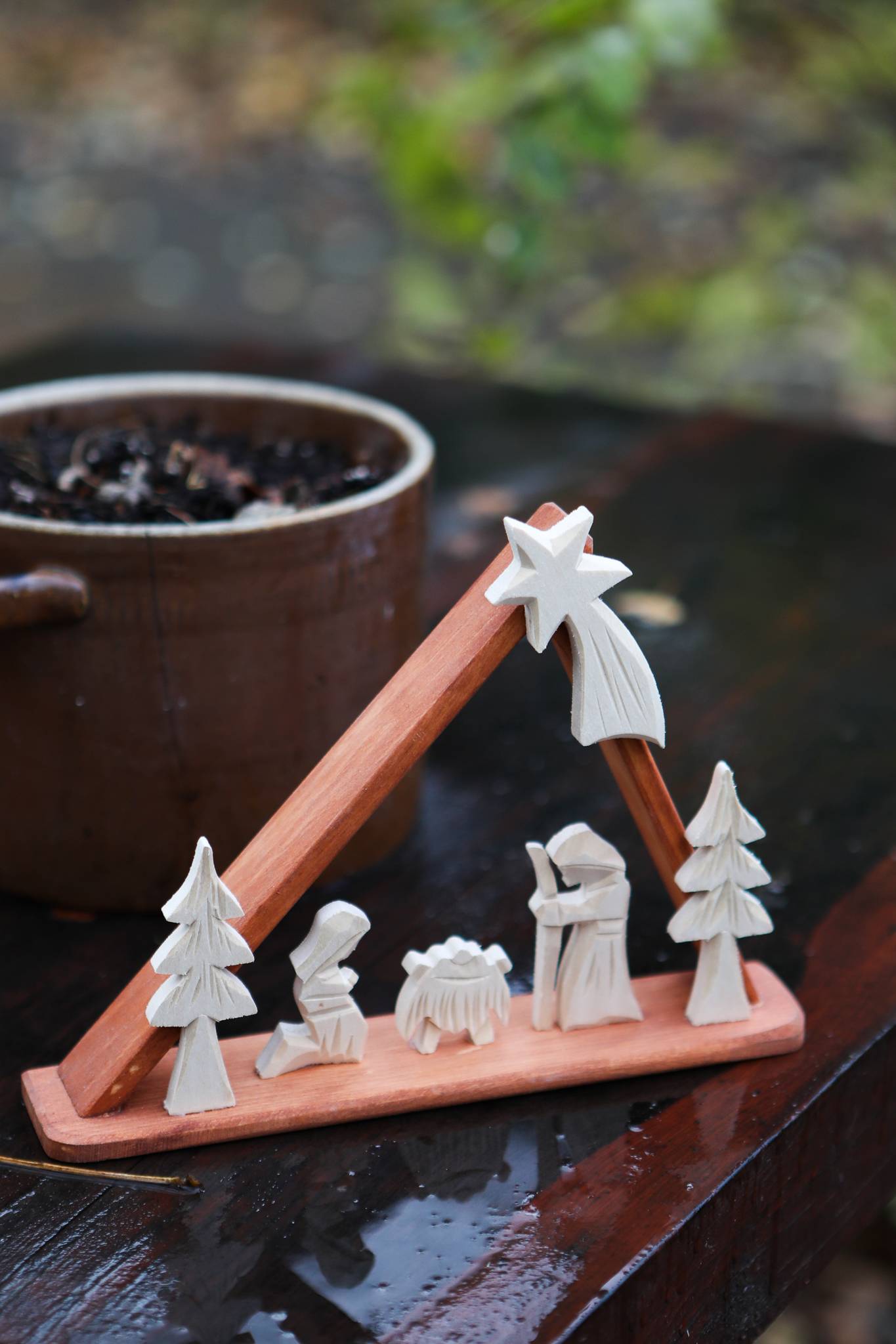 Ręcznie wykonana rzeźba sakralna w formie trójkątnej, bożonarodzeniowej szopki w mahoniowym kolorze. W surowym drewnie widnieje zarys postaci Maryi, Józefa oraz małego Jezusa w żłobku. Nad ich głowami można dostrzec Gwiazdę Betlejemską. Całość została wykonana przez rzeźbiarza z regionu beskidzkiego.