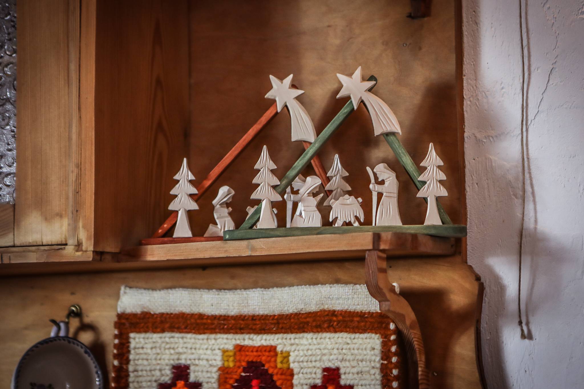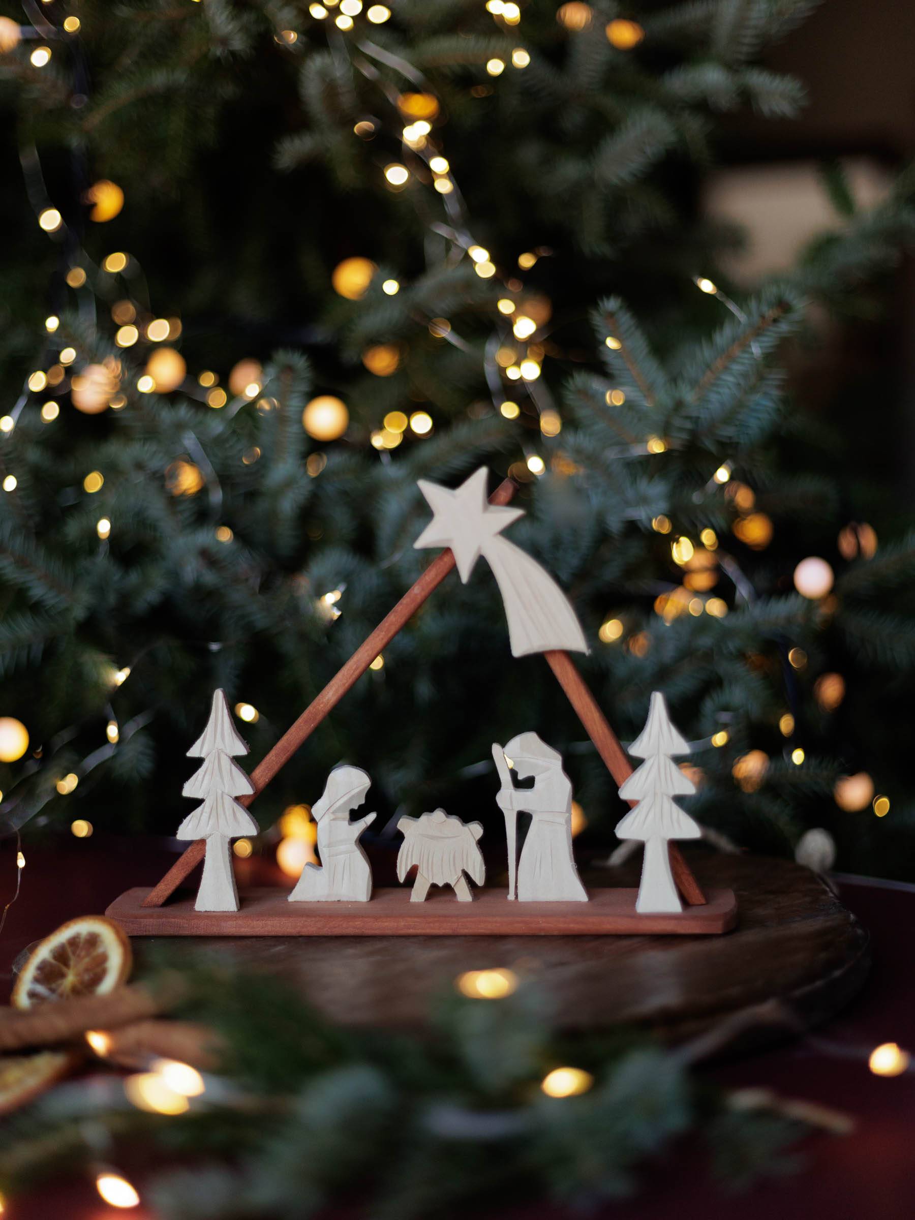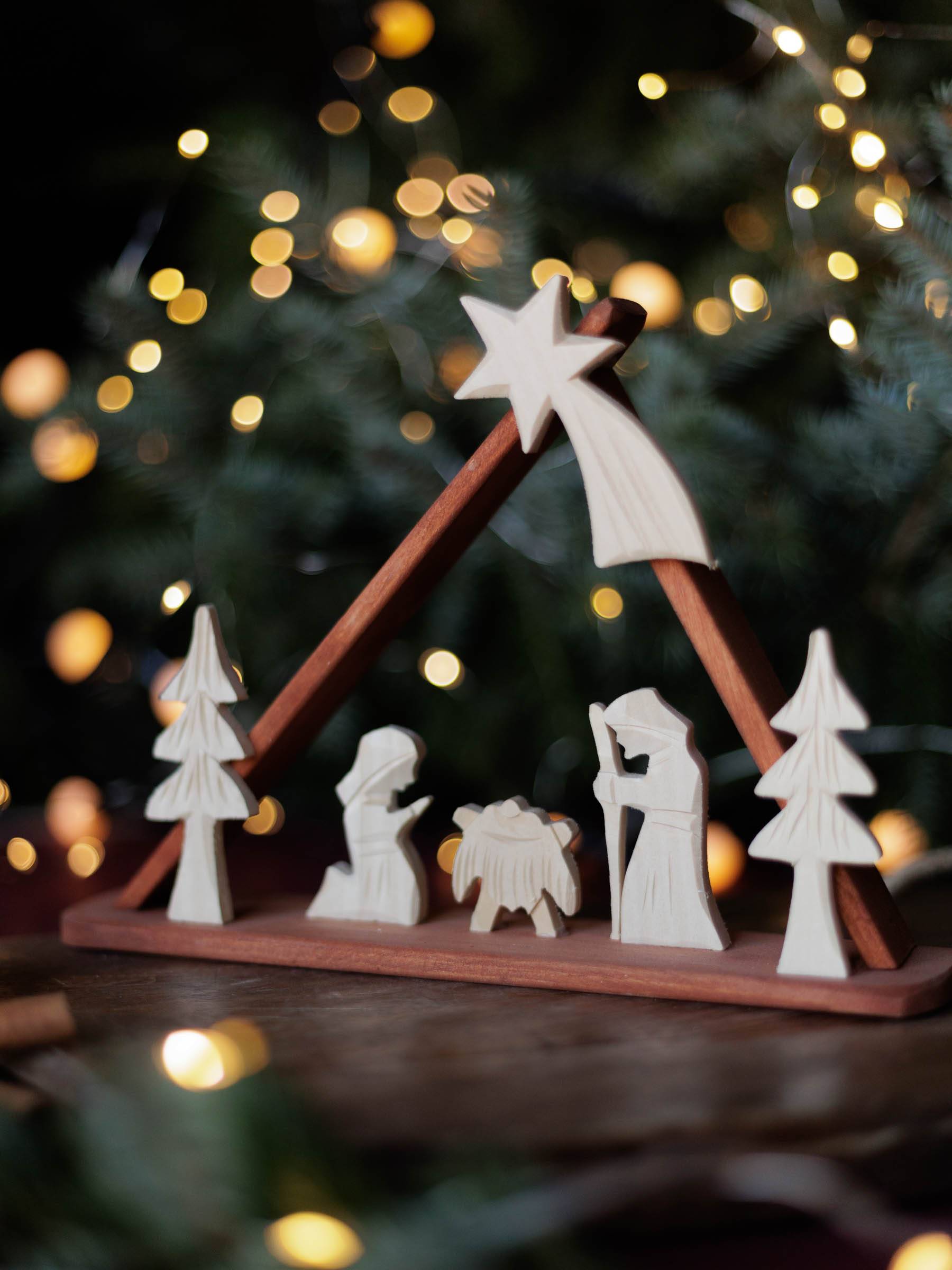 Ręcznie wykonana rzeźba sakralna w formie trójkątnej, bożonarodzeniowej szopki w mahoniowym kolorze. W surowym drewnie widnieje zarys postaci Maryi, Józefa oraz małego Jezusa w żłobku. Nad ich głowami można dostrzec Gwiazdę Betlejemską. Całość została wykonana przez rzeźbiarza z regionu beskidzkiego.