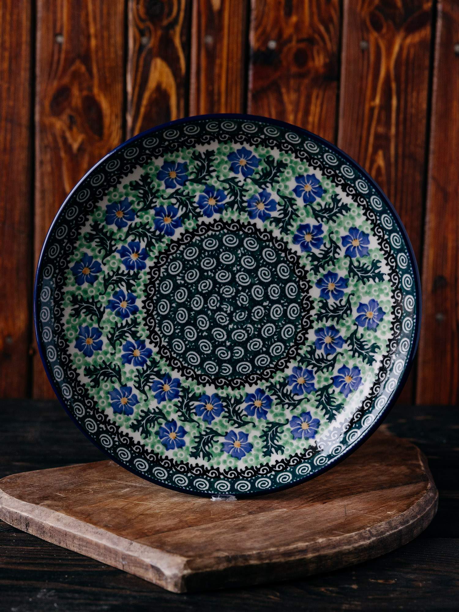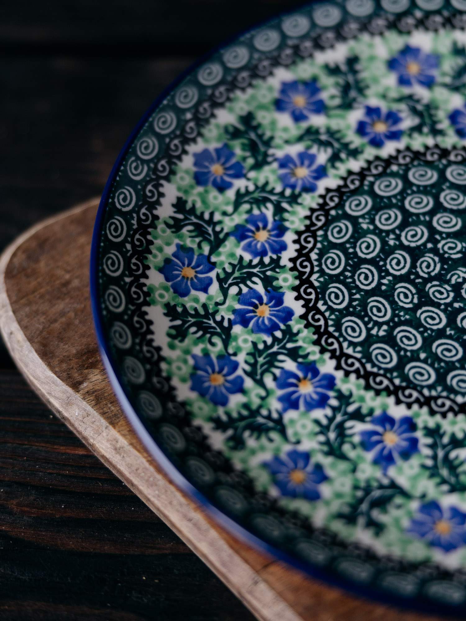 Duży, okrągły talerz obiadowy, ozdobiony kwiatowym, kobaltowo-zielonym wzorem chabrów.