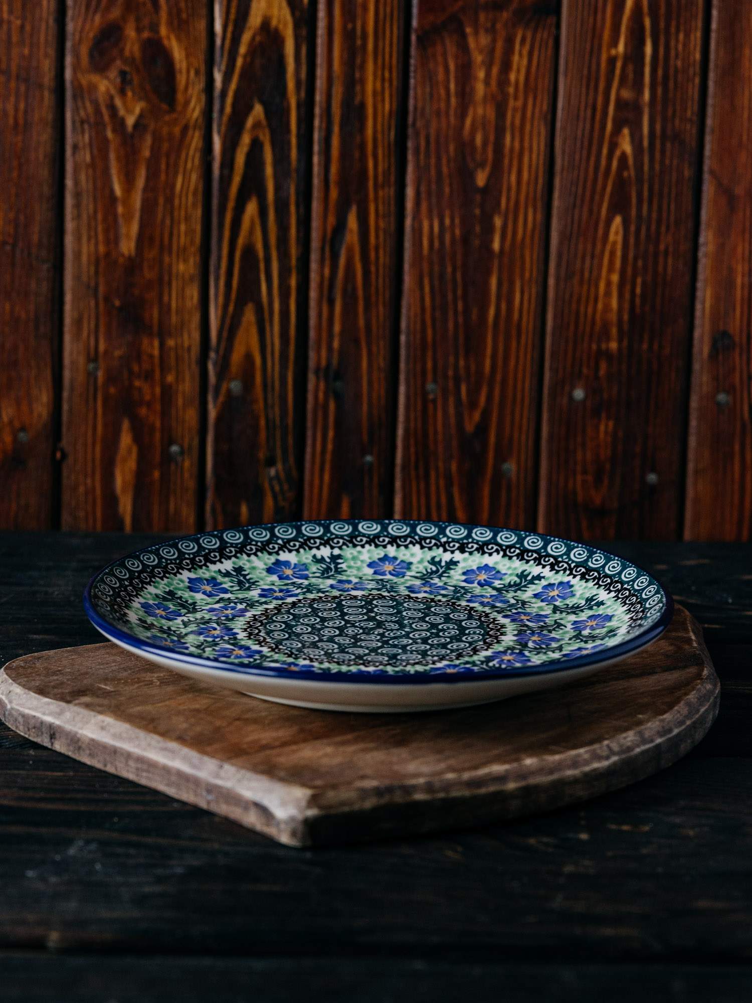 Duży, okrągły talerz obiadowy. Jasna ceramika została ozdobiona ręcznie, kobaltowo-zielonym wzorem chabrów. Naczynie posiada subtelnie wywinięte brzegi. Talerz został wykonany w „Ceramice Artystycznej” w Bolesławcu.