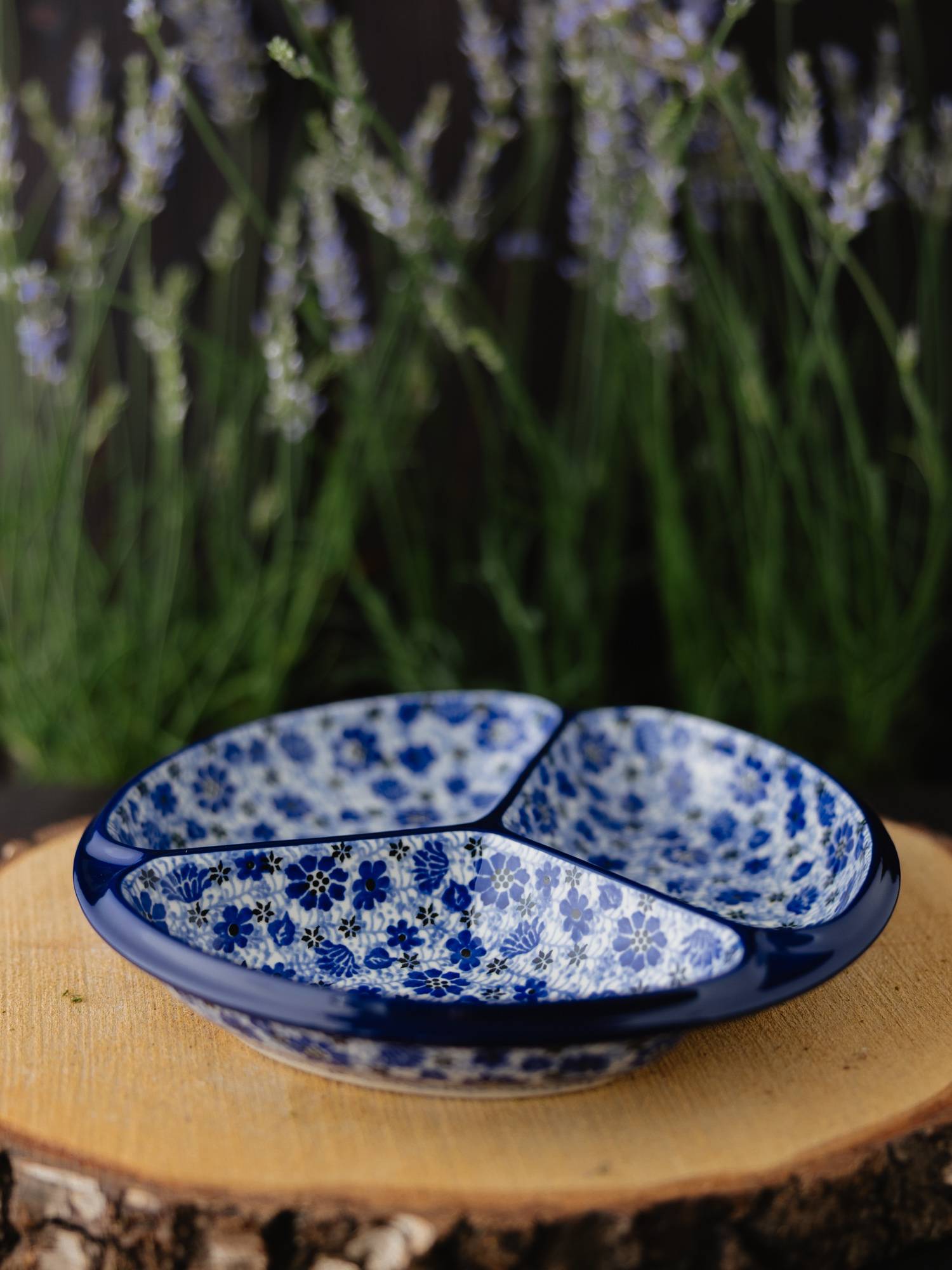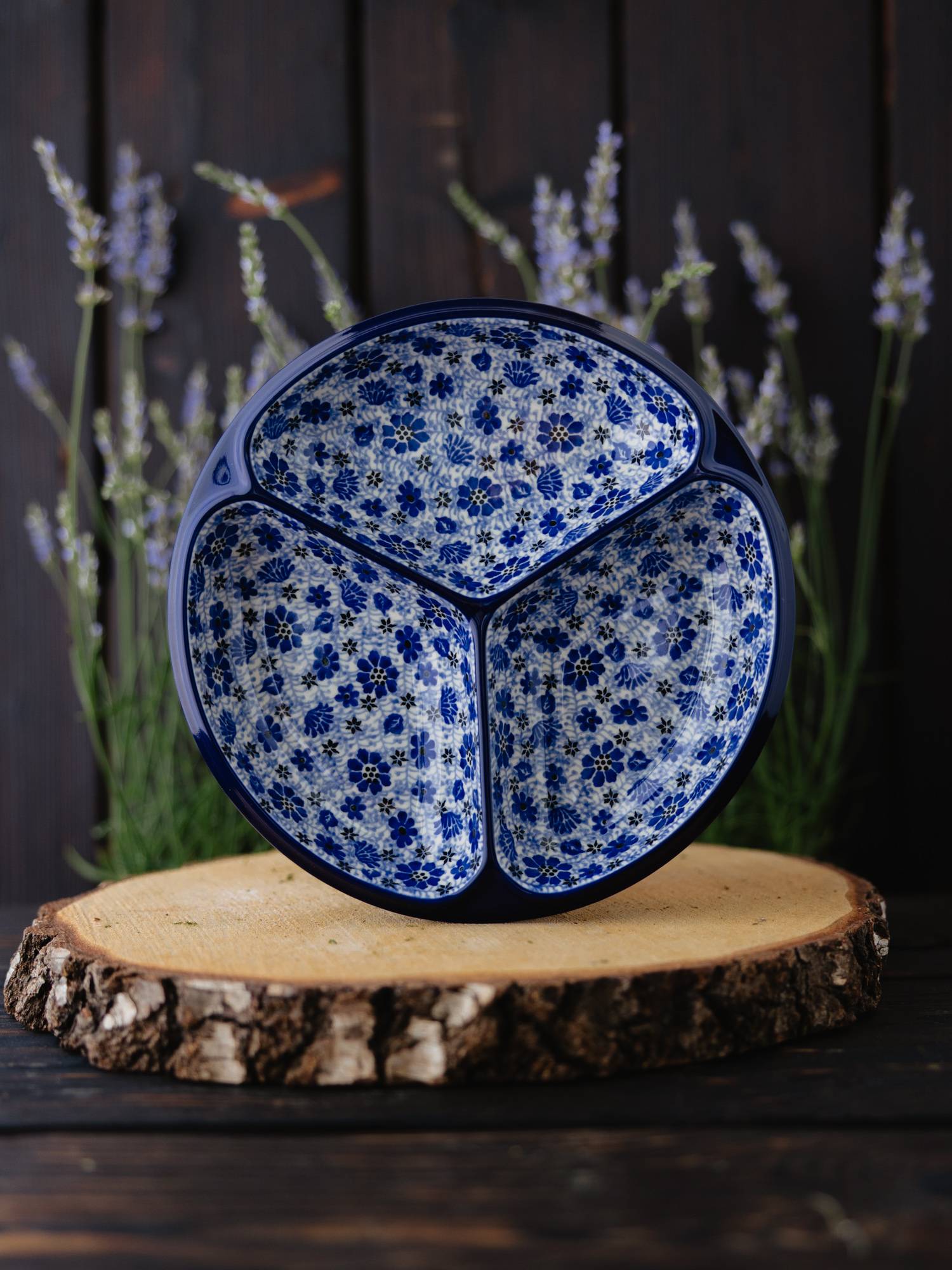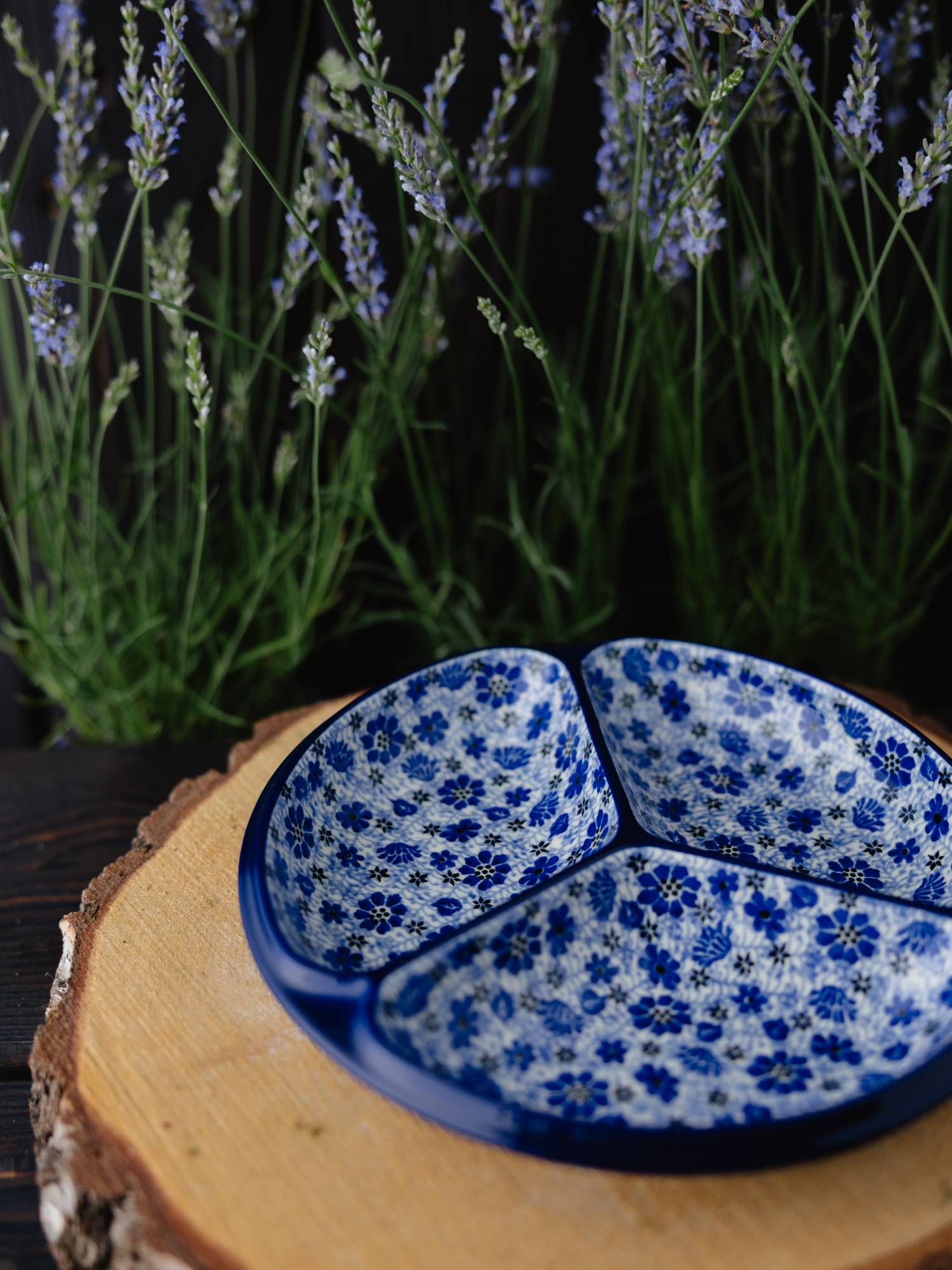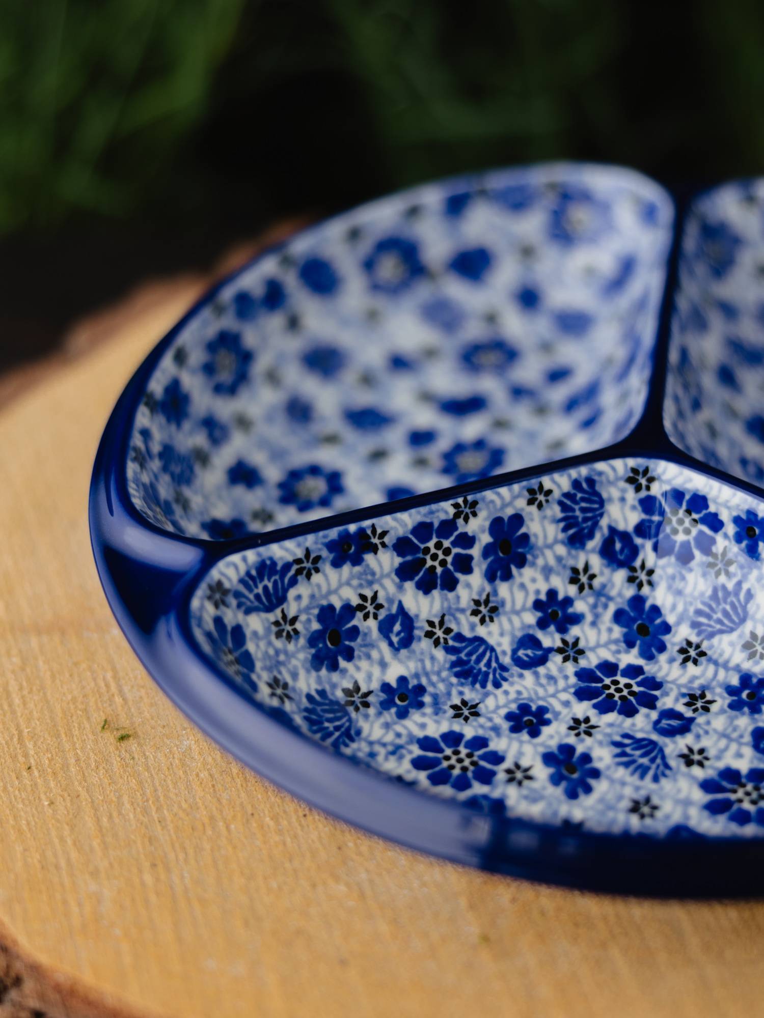Duży, okrągły talerz dzielony na trzy segmenty. Jasna ceramika została ozdobiona ręcznie, niebiesko-kobaltowym wzorem kwiatowej łąki. Naczynie podzielono na trzy równe przegródki, które zbiegają się do środka talerza tworząc kształt trójkąta z zaokrąglonymi brzegami. Naczynie posiada łagodne krawędzie, co pozwala stworzyć spójną całość. Talerz został wykonany w „Ceramice Artystycznej” w Bolesławcu.