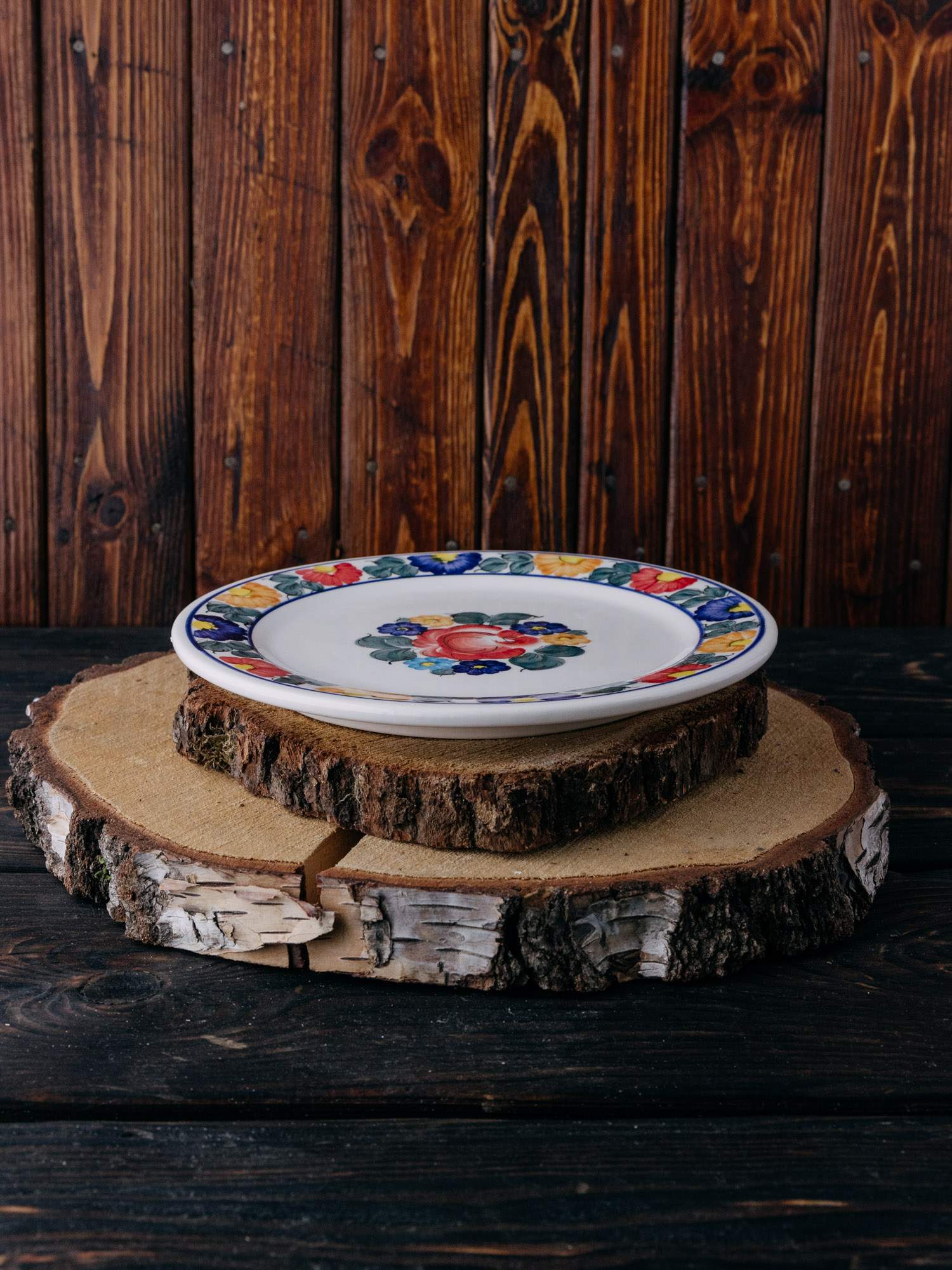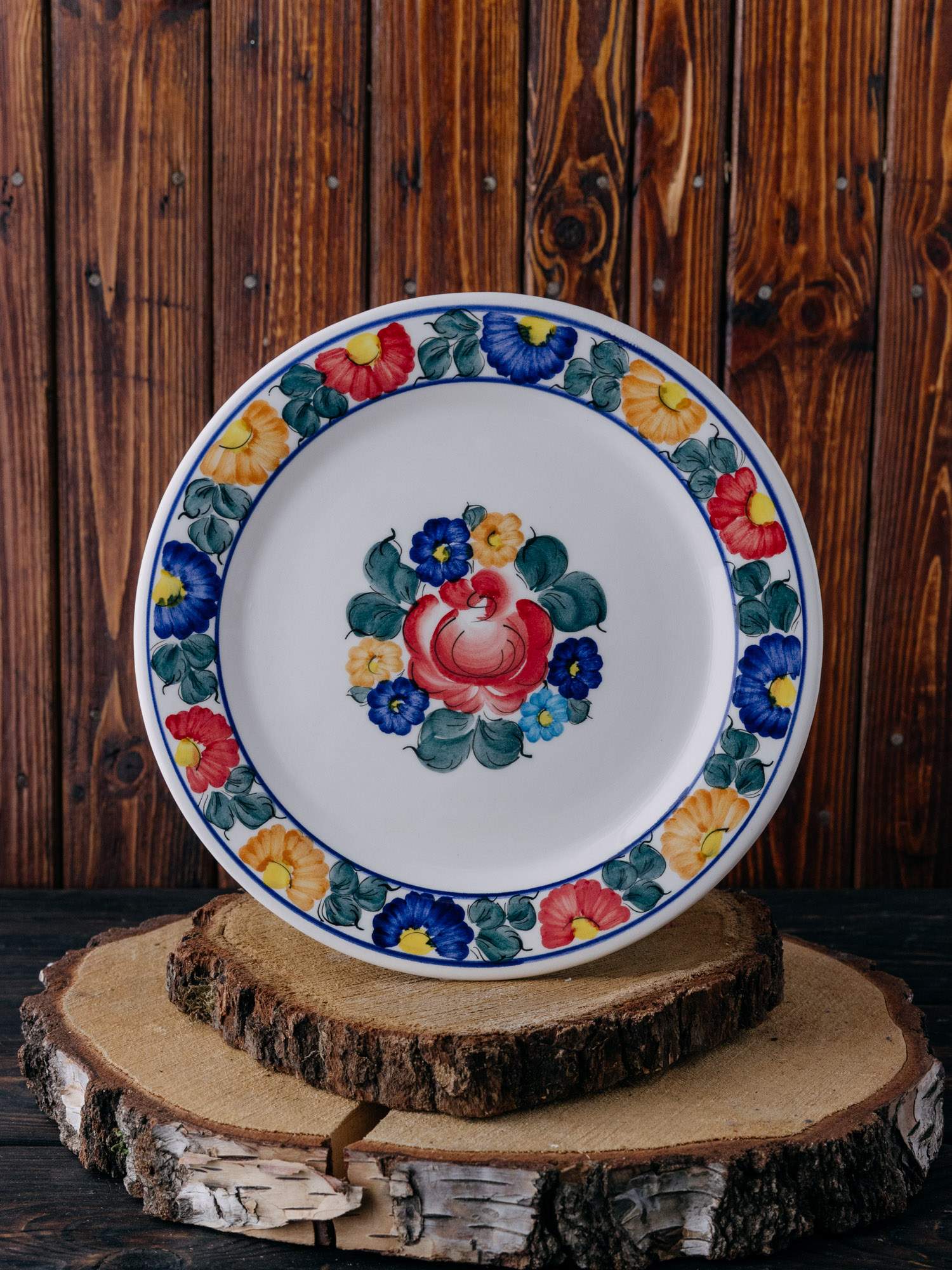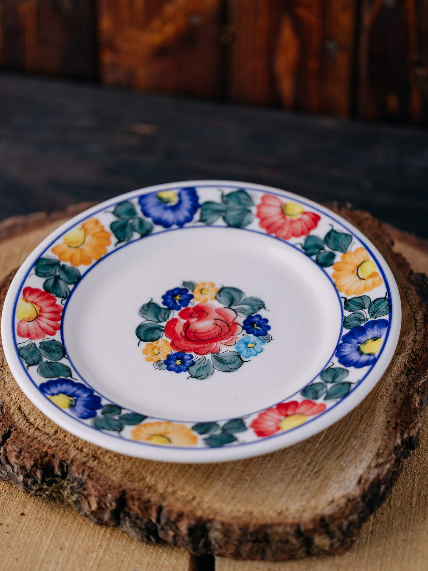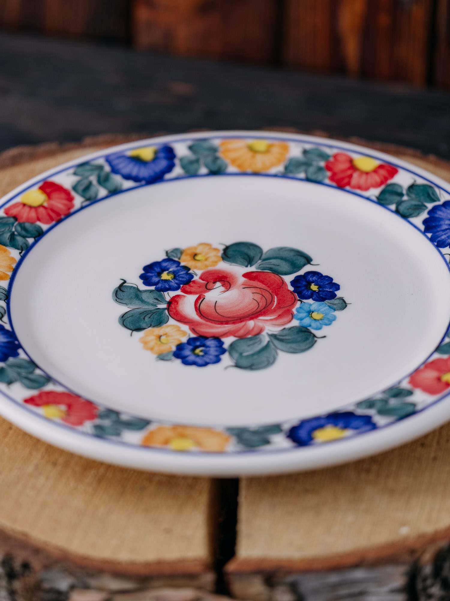Talerz okrągły z Fajansu Włocławek, ozdobiony kolorowym wzorem kwiatów. Jego klasyczna, płaska forma idealnie nadaje się do serwowania dań głównych, a ręcznie malowane kolorowe wzory dodają mu unikalnego uroku, łącząc funkcjonalność z estetyką.