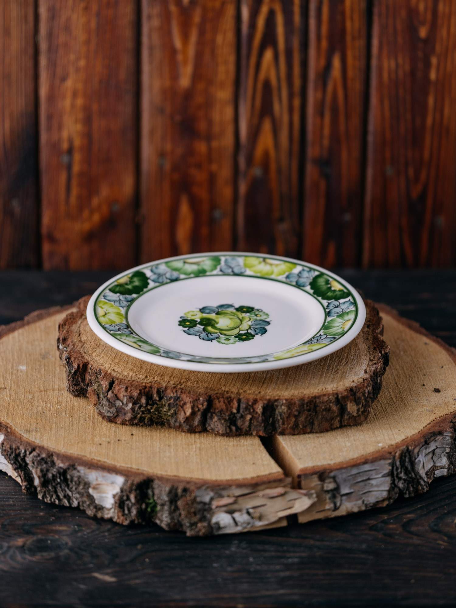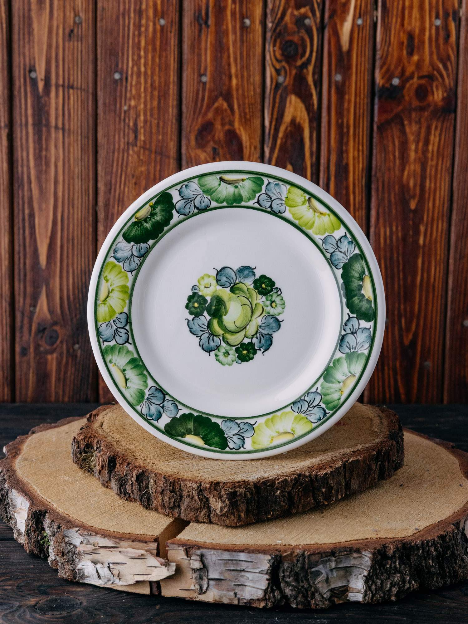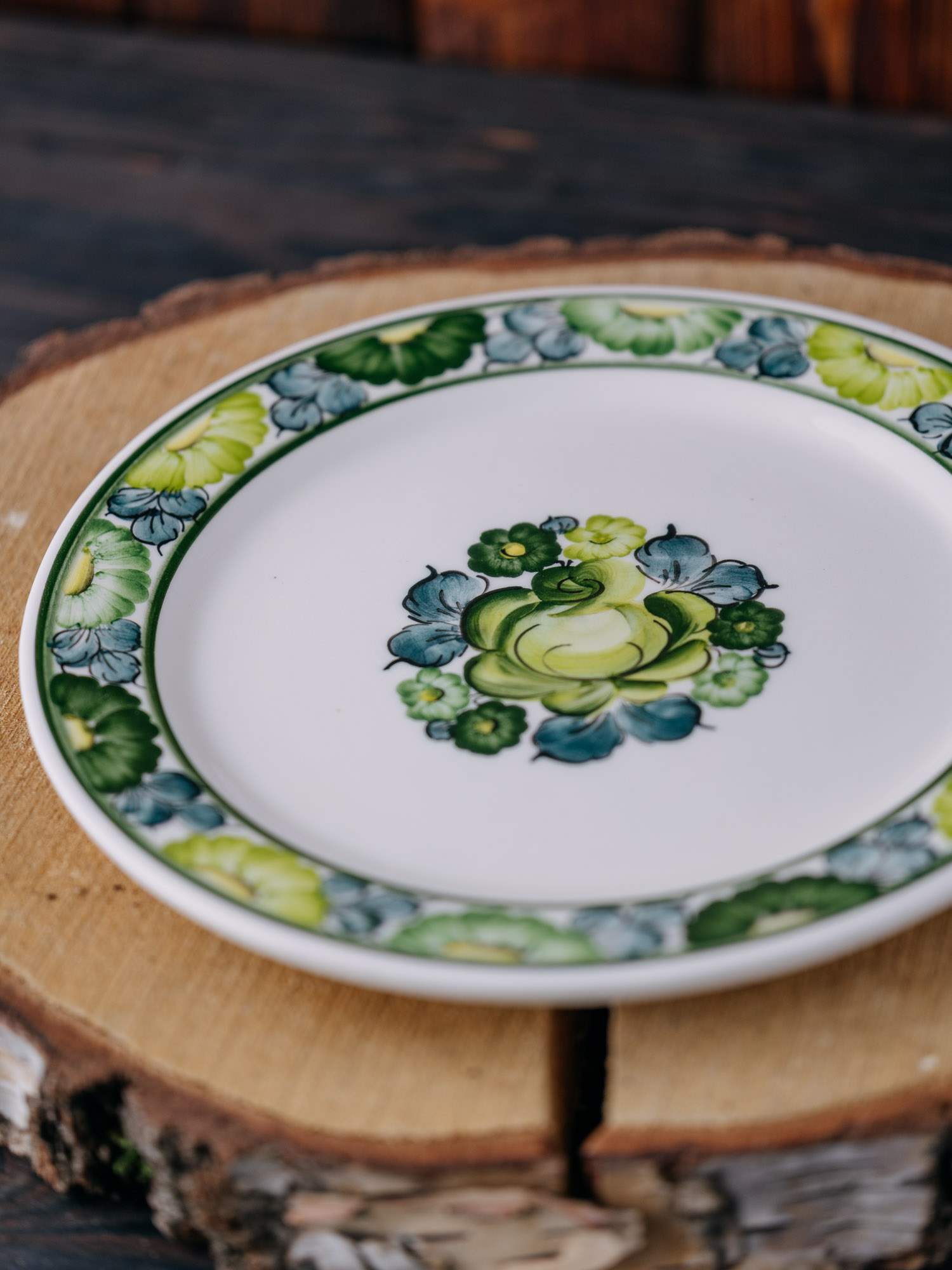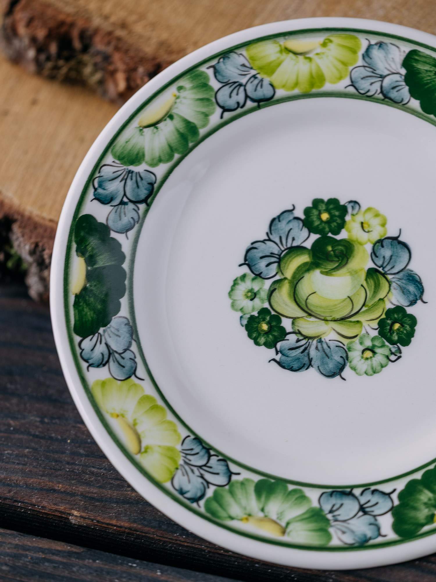 Mały płaski talerz z Fajansu Włocławek, z ręcznie malowanym zielonym wzorem kwiatów . Solidne wykonanie zapewnia trwałość, a subtelne zdobienia dodają mu uroku. Doskonały zarówno do codziennego użytku, jak i na specjalne okazje, wprowadzając odrobinę klasy do każdej zastawy.