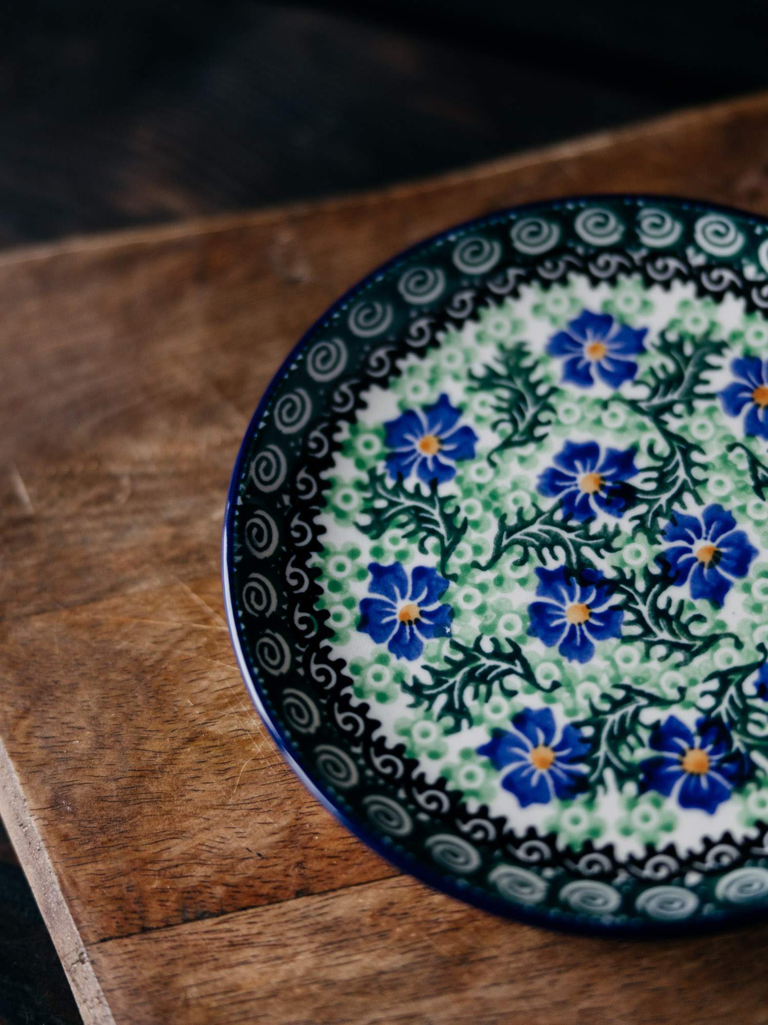 Płaski, okrągły talerz, idealny jako podstawek pod bulionówkę, ozdobiony kwiatowym, kobaltowo-zielonym wzorem chabrów.