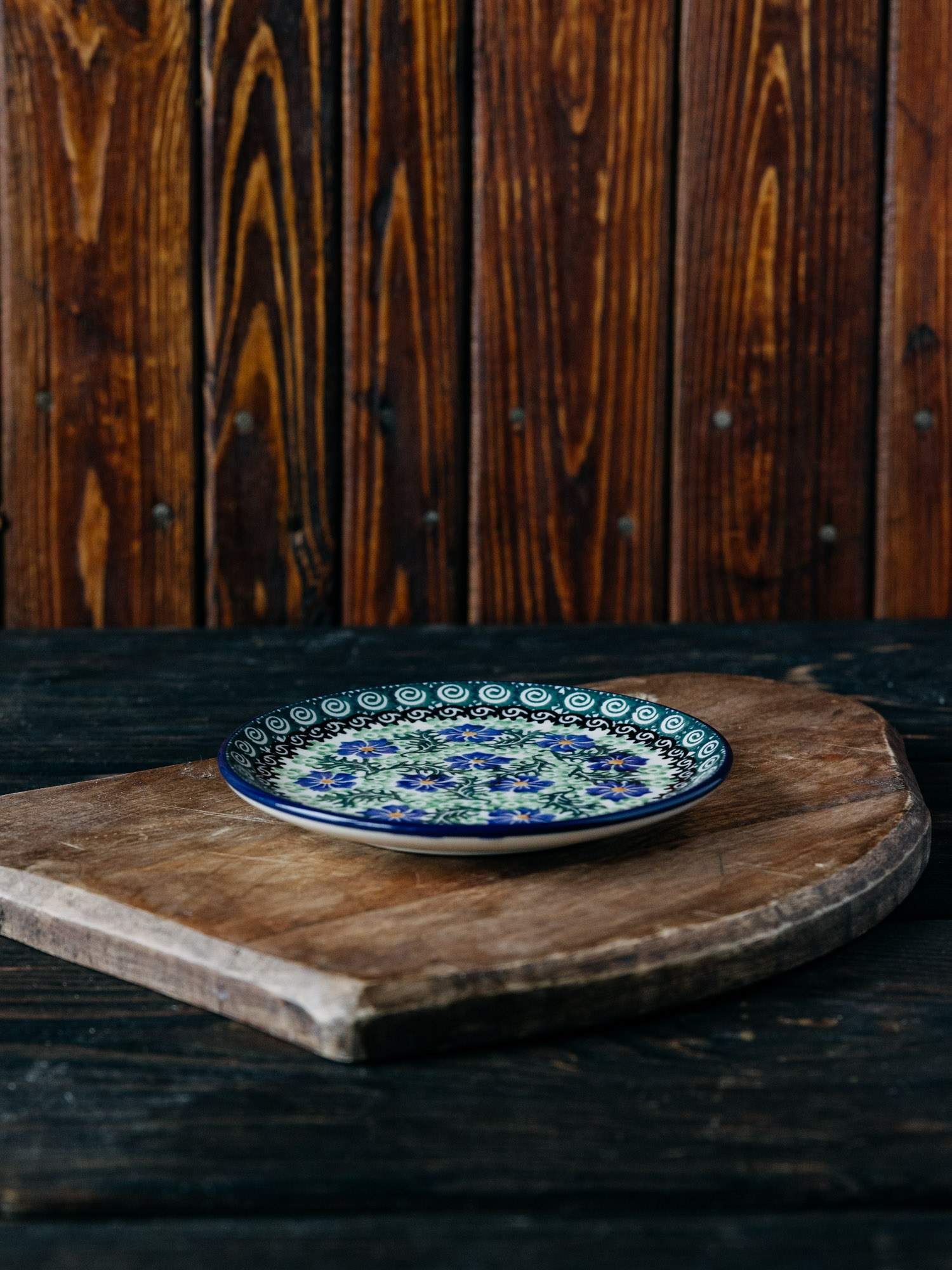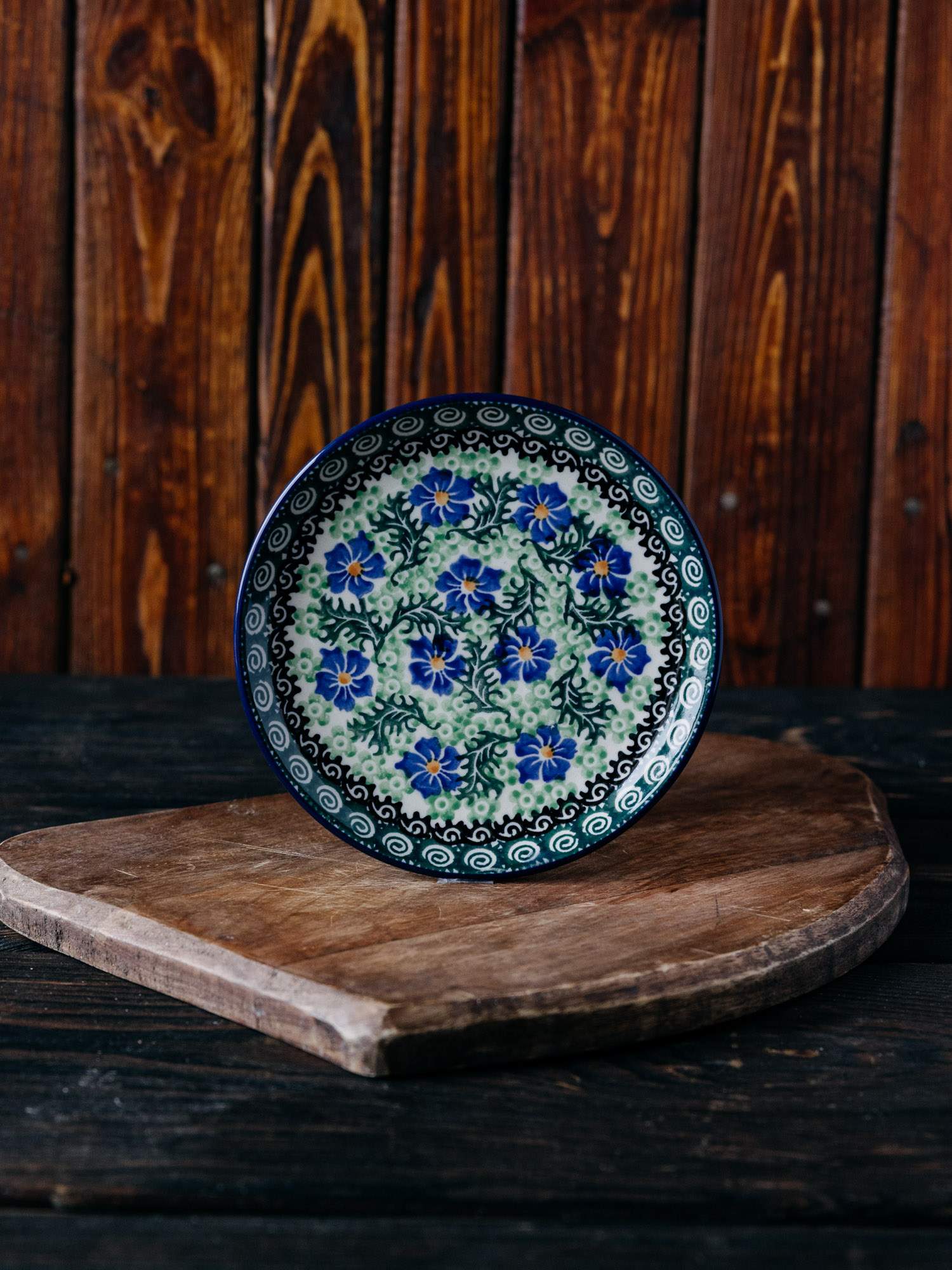 Płaski, okrągły talerz, idealny jako podstawek pod bulionówkę. Jasna ceramika została ozdobiona ręcznie,kobaltowo-zielonym wzorem chabrów. Talerz posiada subtelnie wywinięte brzegi. Naczynie zostało wykonane w „Ceramice Artystycznej” w Bolesławcu.