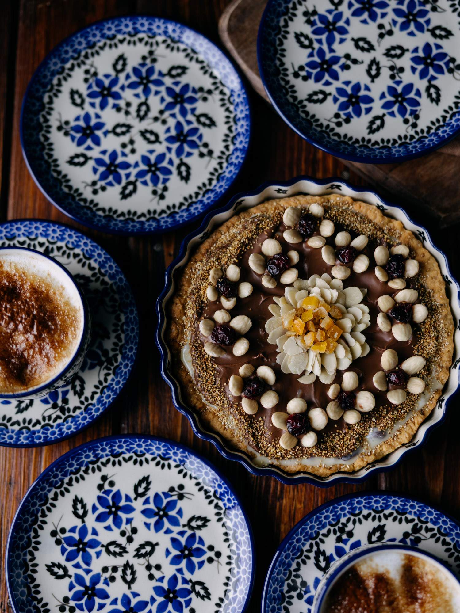 Płaski, okrągły talerz, idealny jako podstawek pod bulionówkę, ozdobiony kontrastowym, kobaltowo-czarnym wzorem polnych kwiatów.