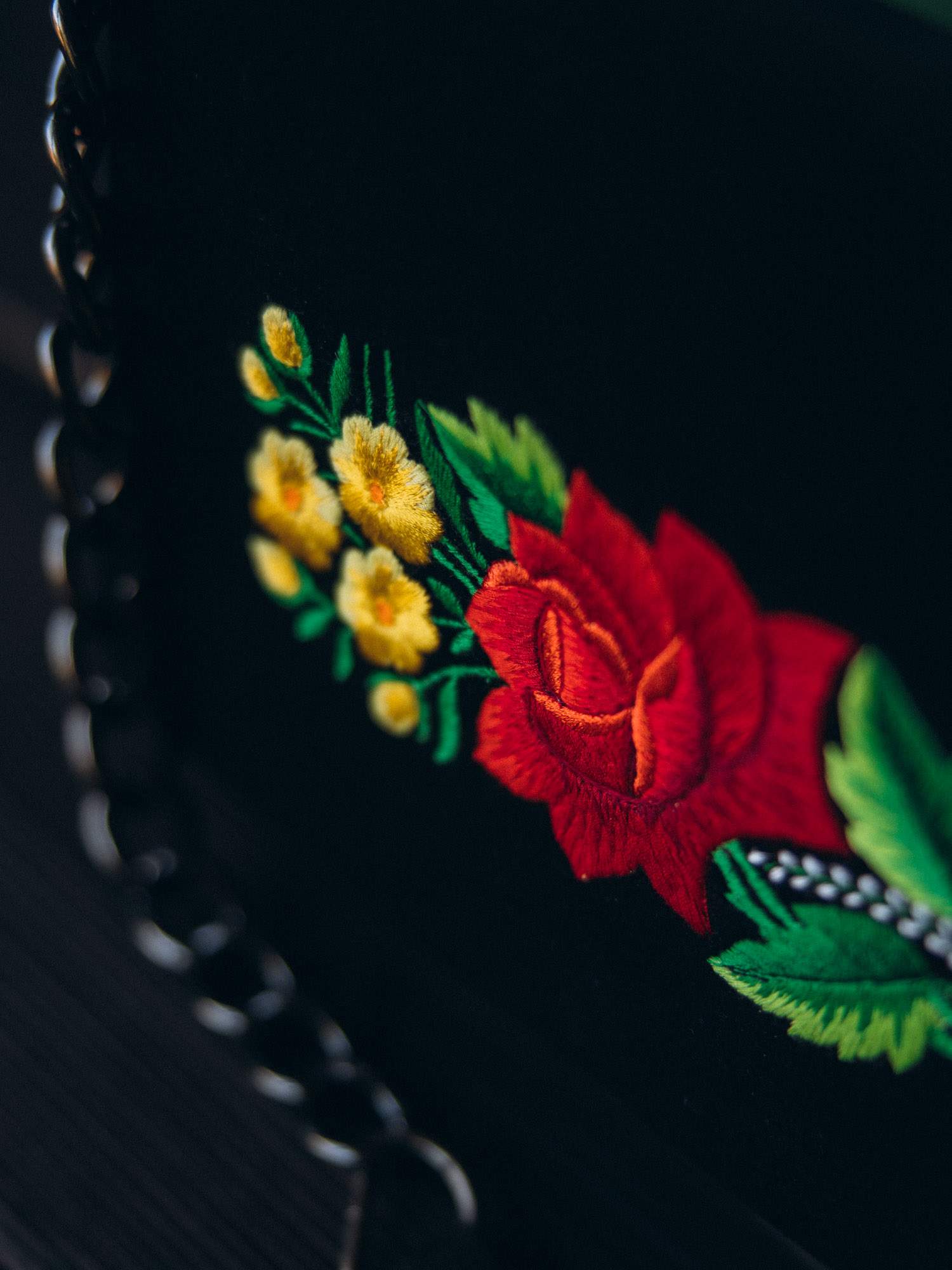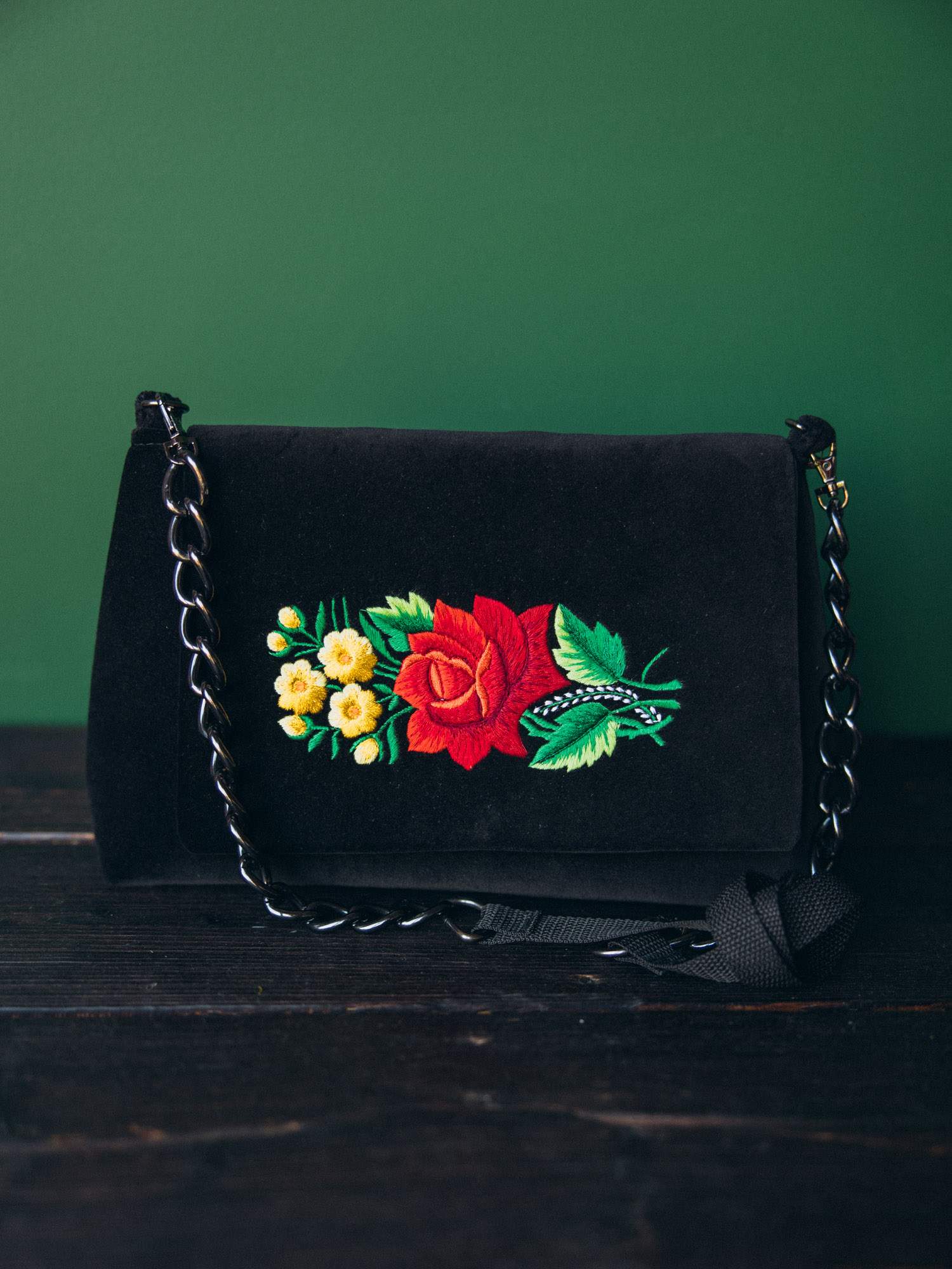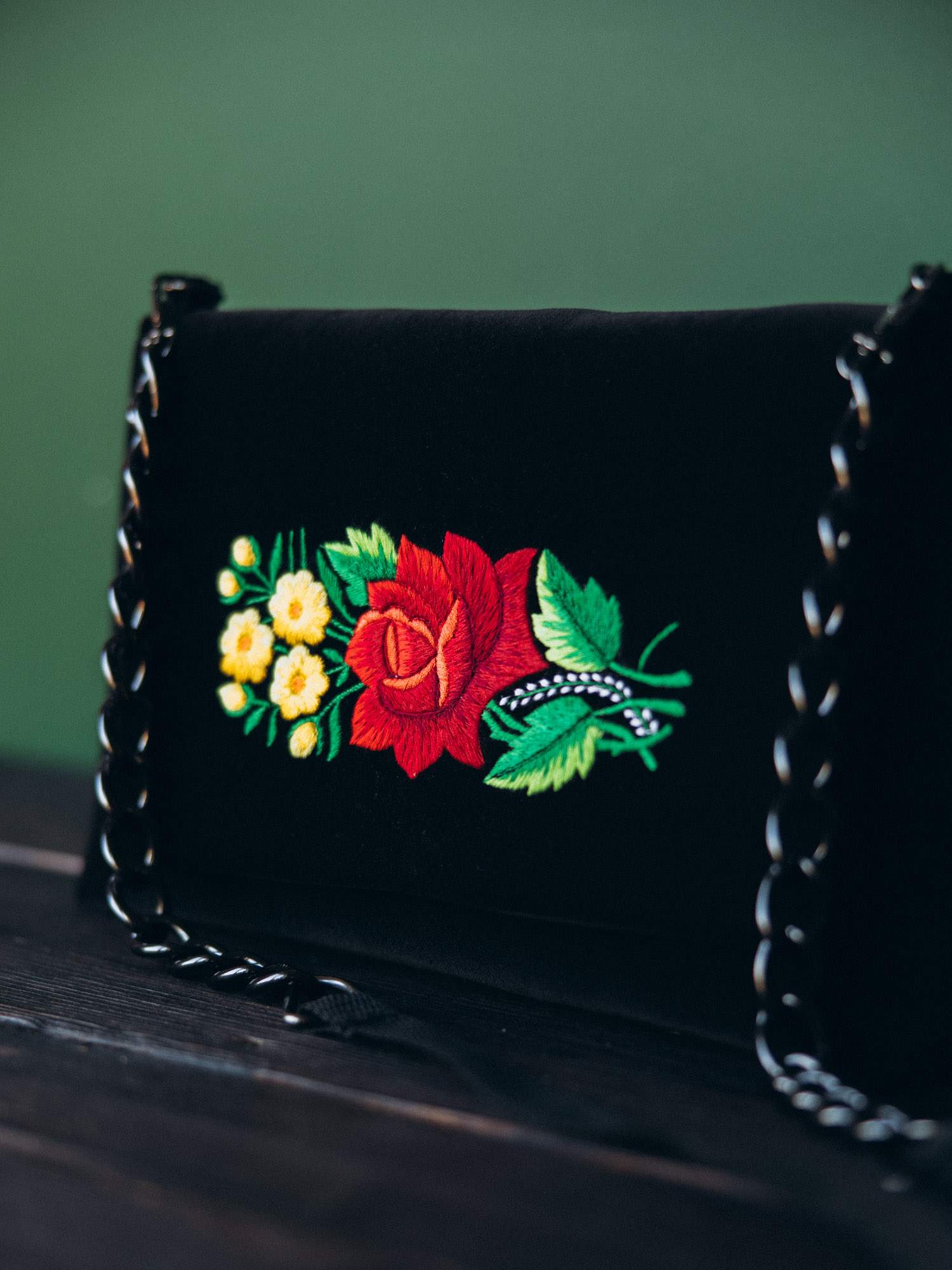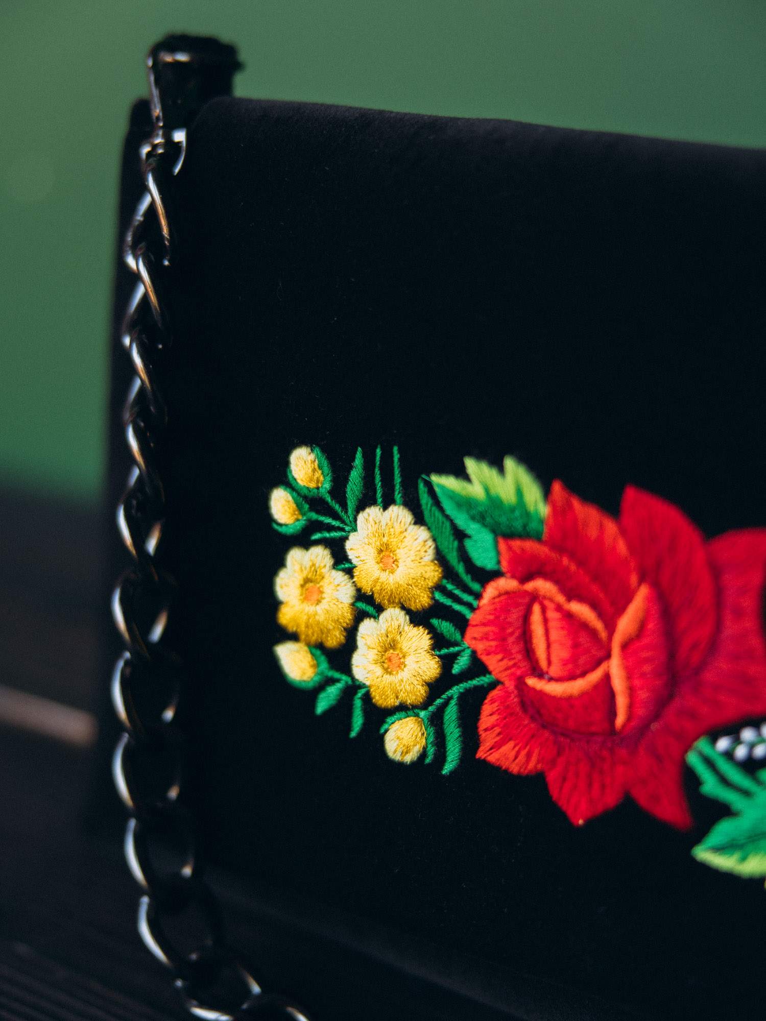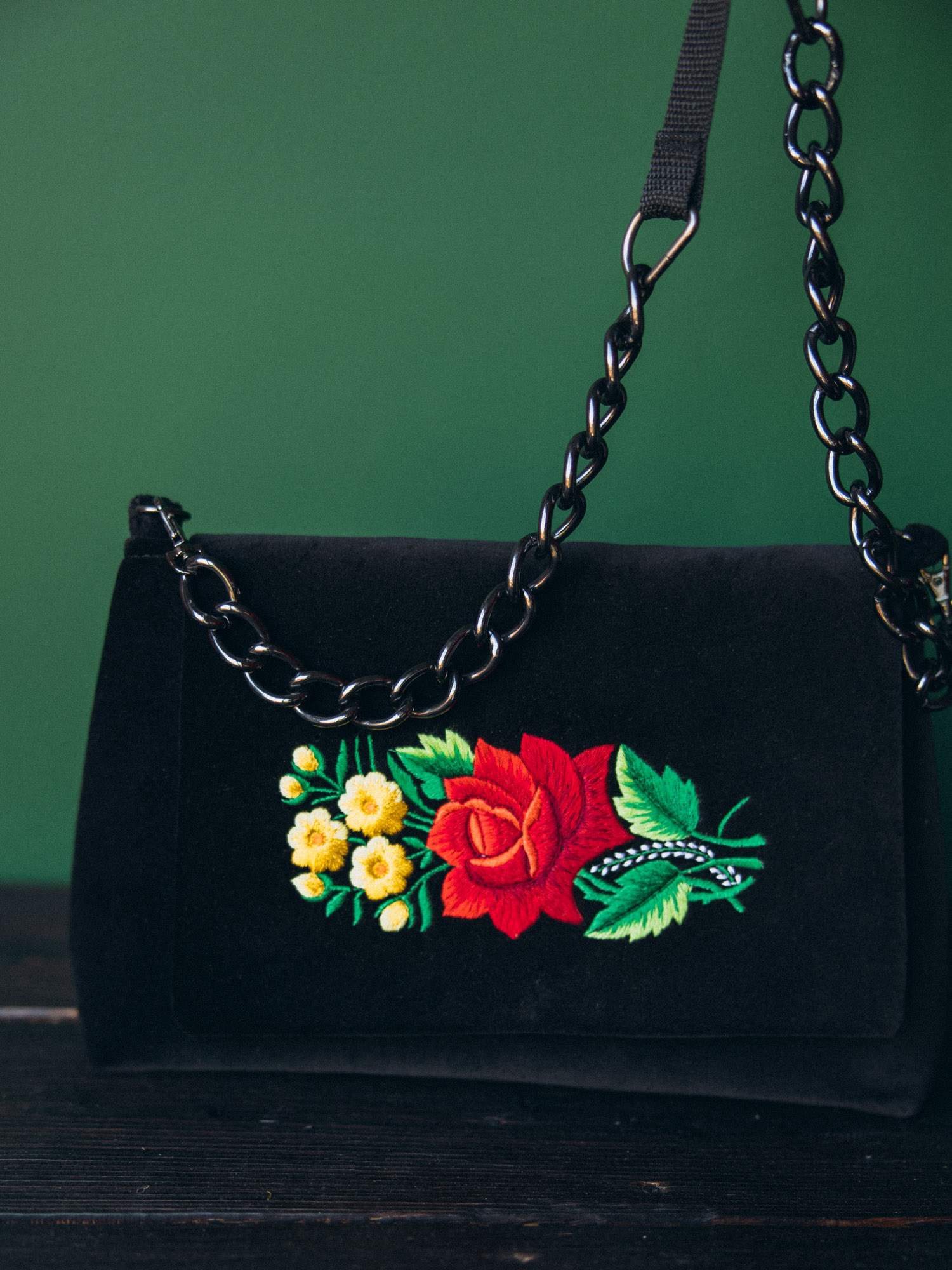 Elegancka torba wykonana z aksamitu w czarnym kolorze. Na torebce znajduję się czerwona róża, otoczona kilkoma mniejszymi żółtymi kwiatkami i liśćmi. Łańcuszek jest w czarnym kolorze. Torba posiada zapięcie na zatrzask. Wyszywane detale zostały wykonane przez hafciarkę z okolic Łowicza.