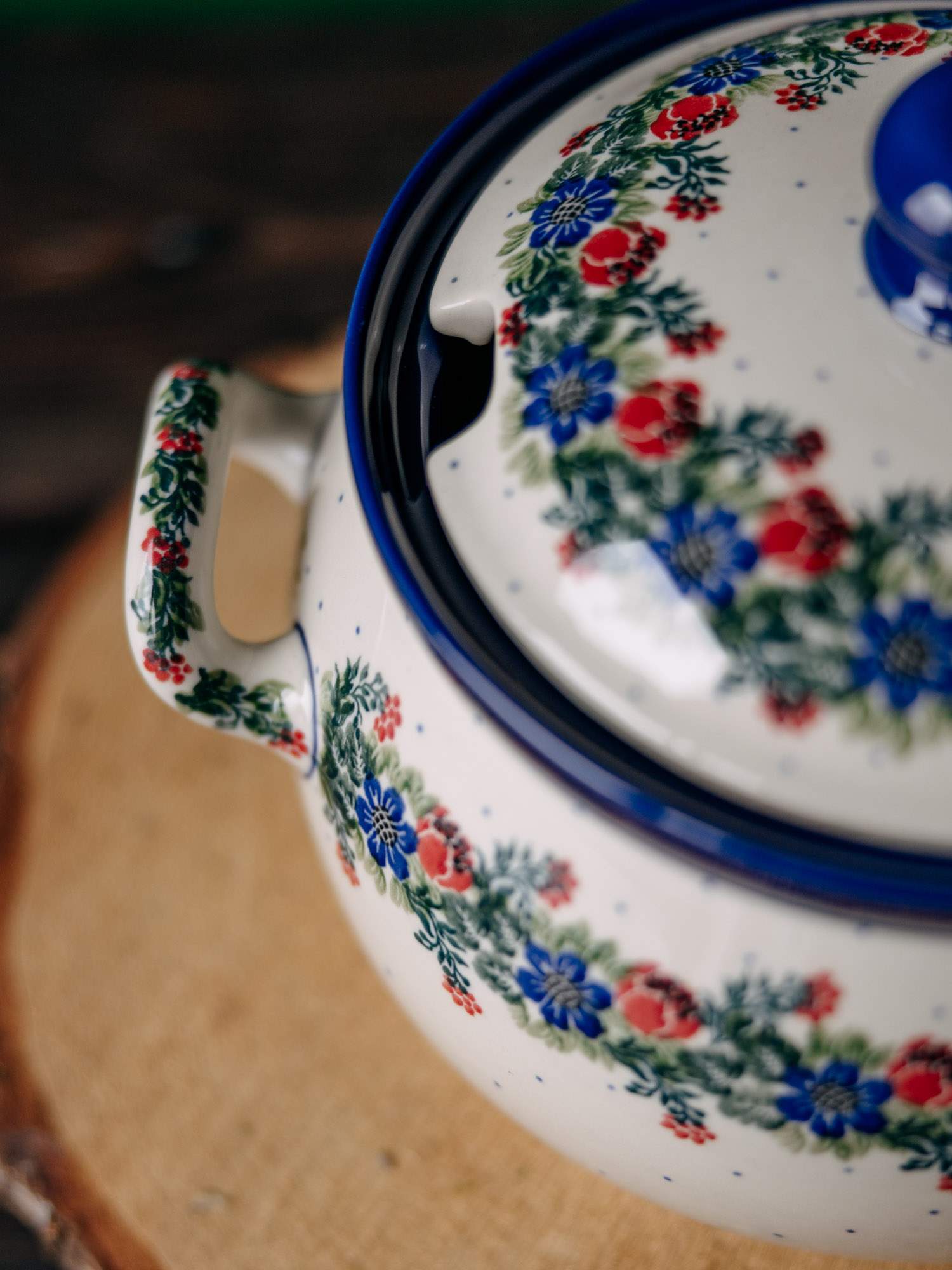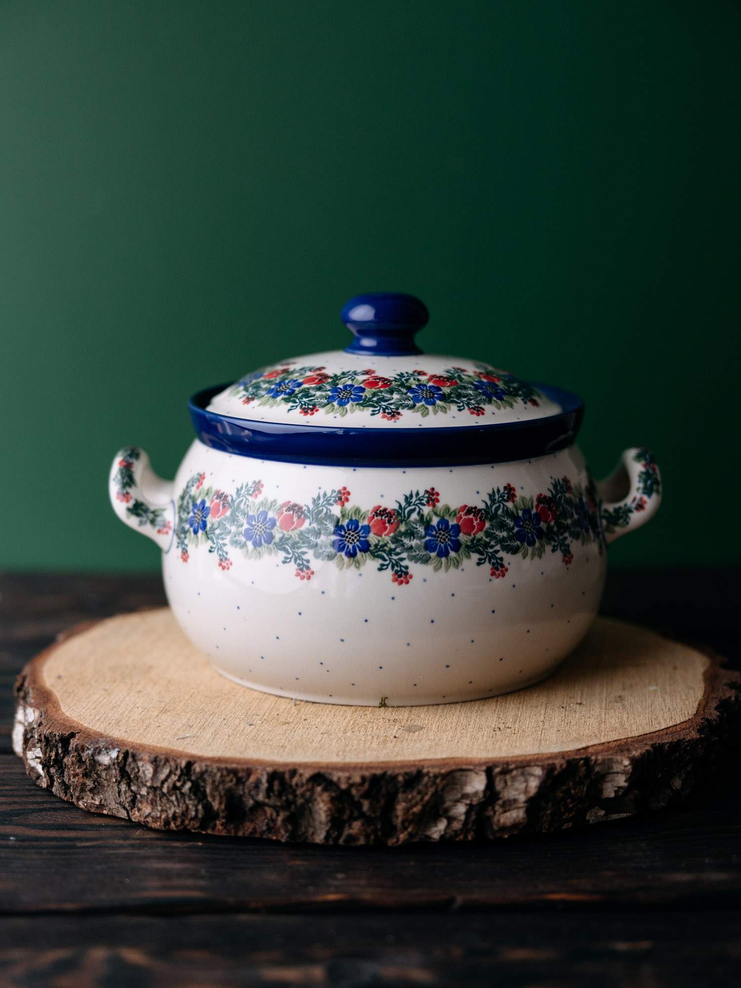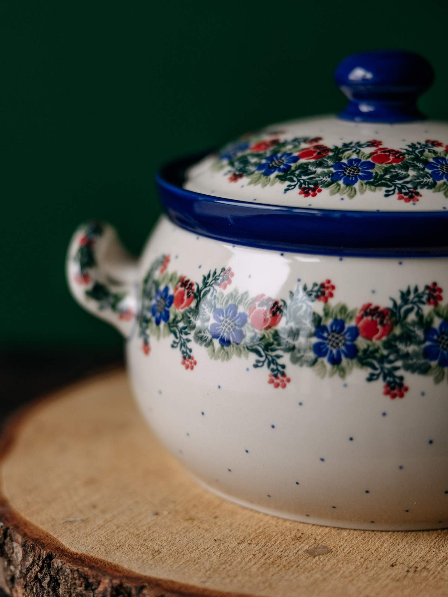 Duża waza z pokrywką. Jasna ceramika została ozdobiona ręcznie, kobaltowo-zielonym wzorem wianka z makami. Naczynie posiada dwa wygodne uchwyty oraz pokrywkę z okrągłym uchwytem i miejscem na chochlę. Waza została wykonana w tradycyjnej Manufakturze Ceramiki Bolesławiec.