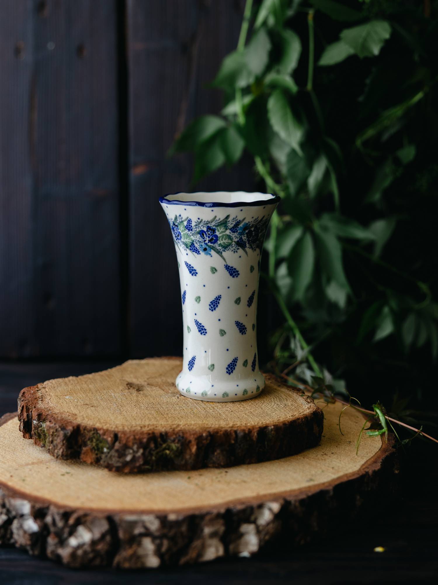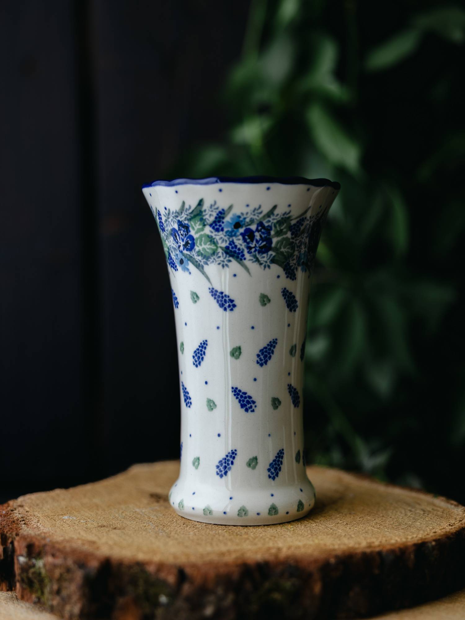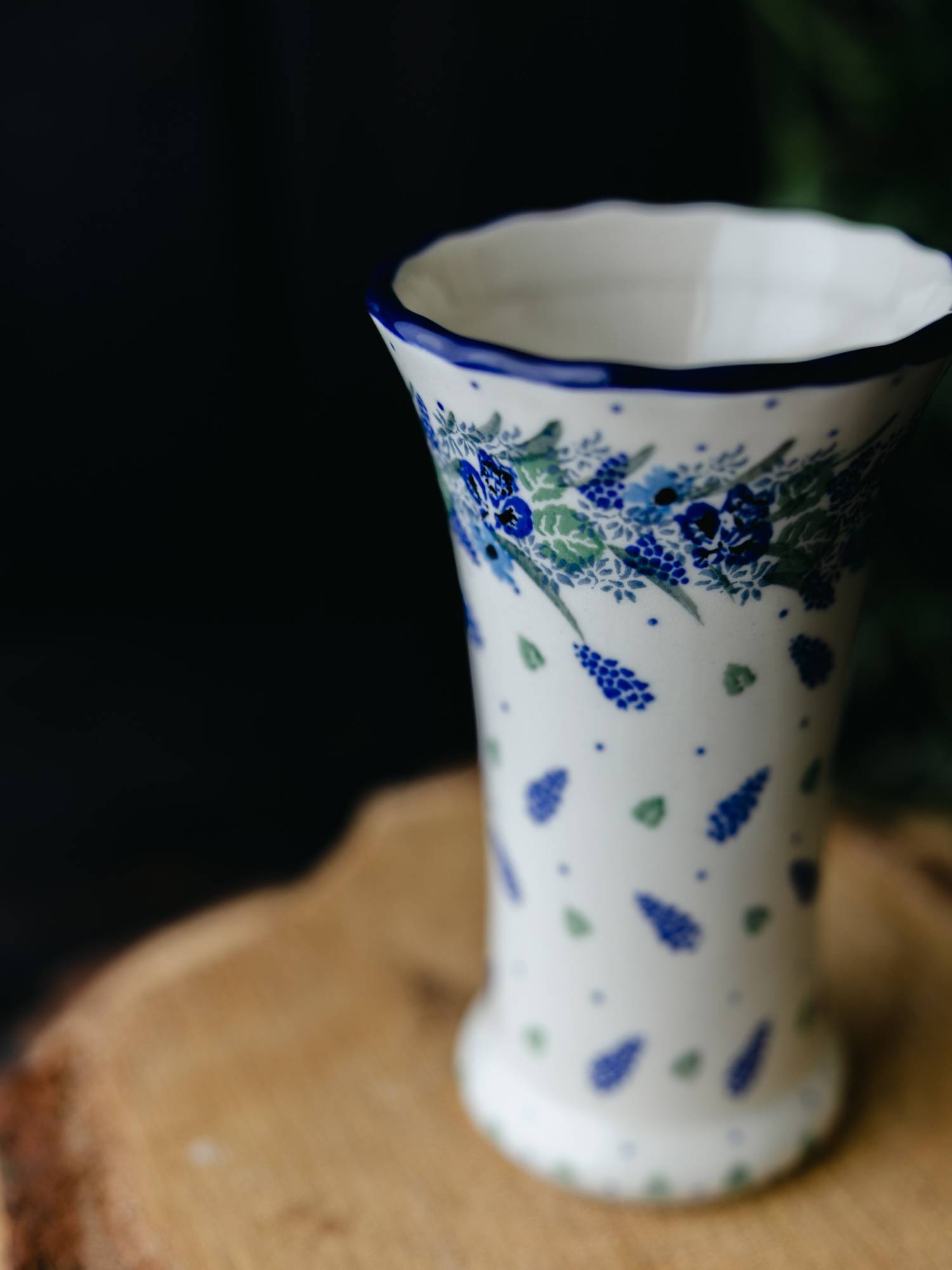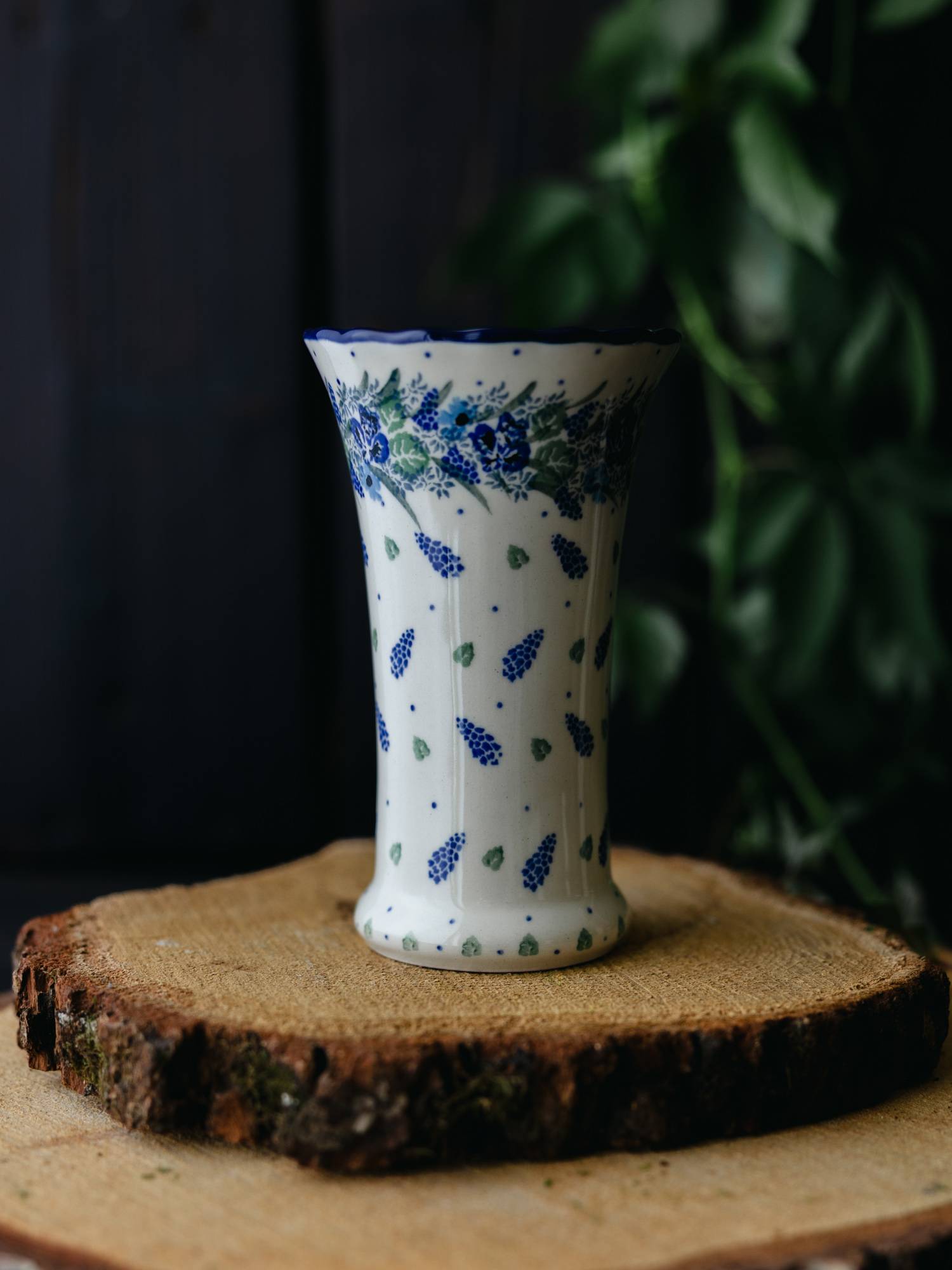 Smukły wazon rozszerzany ku górze. Jasna ceramika została ozdobiona ręcznie, kobaltowo-zielonym wzorem wianka. Prosty wazon ozdobiono delikatnie falowanym brzegiem w kobaltowym kolorze. Naczynie posiada nieco szerszy spód, co pozwala zachować większą stabilność dużych bukietów. Wazon został wykonany w „Ceramice Artystycznej” w Bolesławcu.