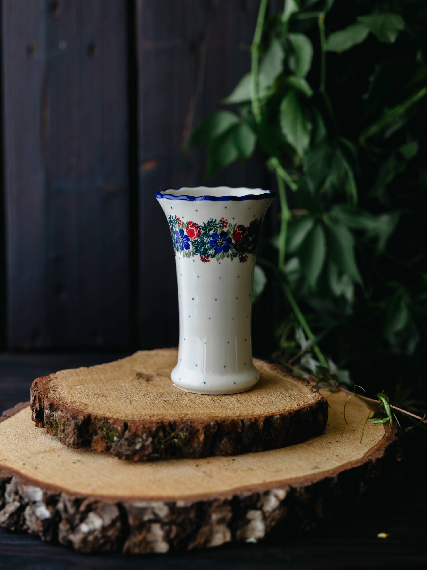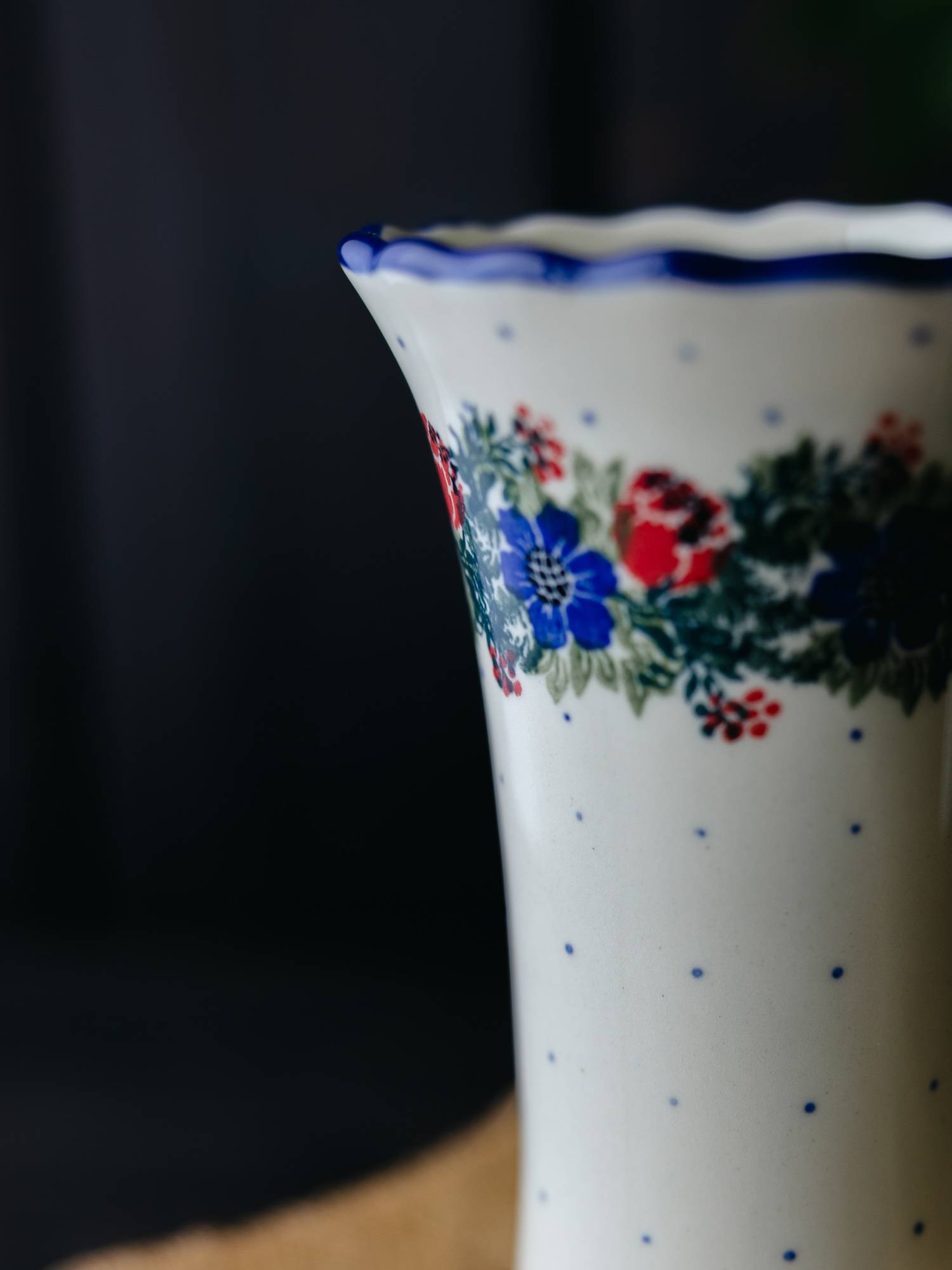 Smukły wazon rozszerzany ku górze. Jasna ceramika została ozdobiona ręcznie, kobaltowo-zielonym wzorem wianka z czerwonymi makami. Prosty wazon ozdobiono delikatnie falowanym brzegiem w kobaltowym kolorze. Naczynie posiada nieco szerszy spód, co pozwala zachować większą stabilność dużych bukietów. Wazon został wykonany w „Ceramice Artystycznej” w Bolesławcu.