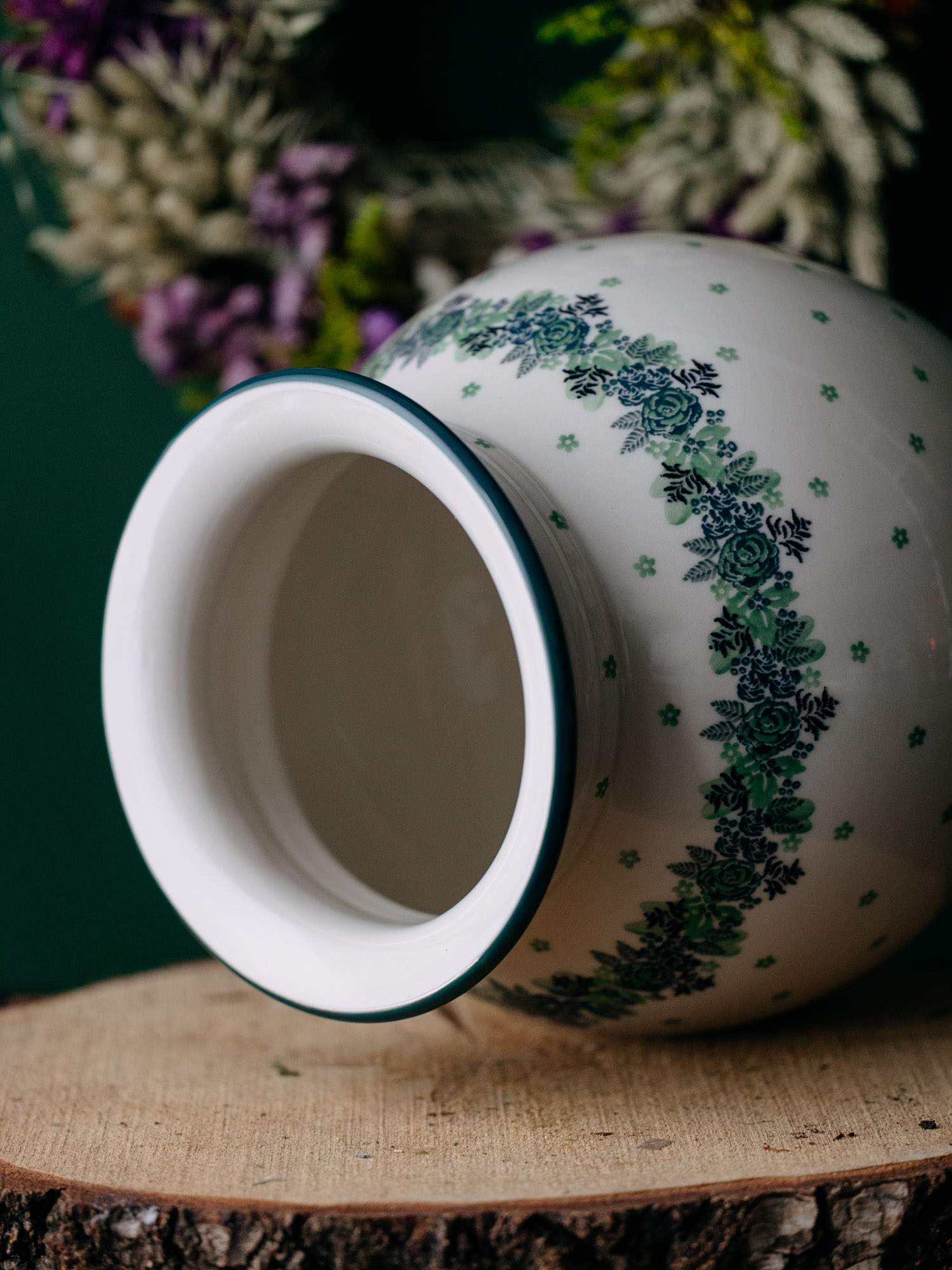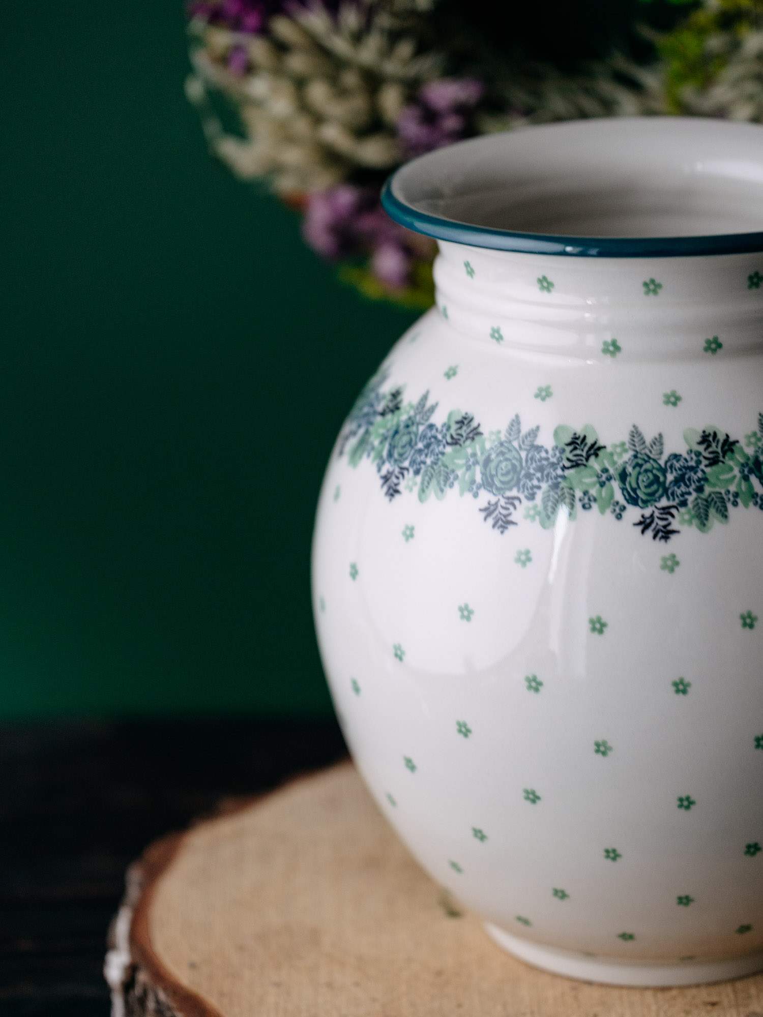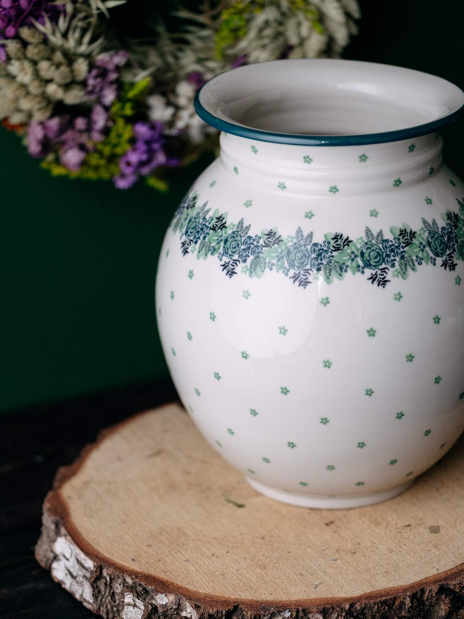 Wielki, ceramiczny wazon o klasycznej, pękatej formie z wyraźnym zaokrągleniem, ozdobiony kwiatowym wzorem zielonego wianka.