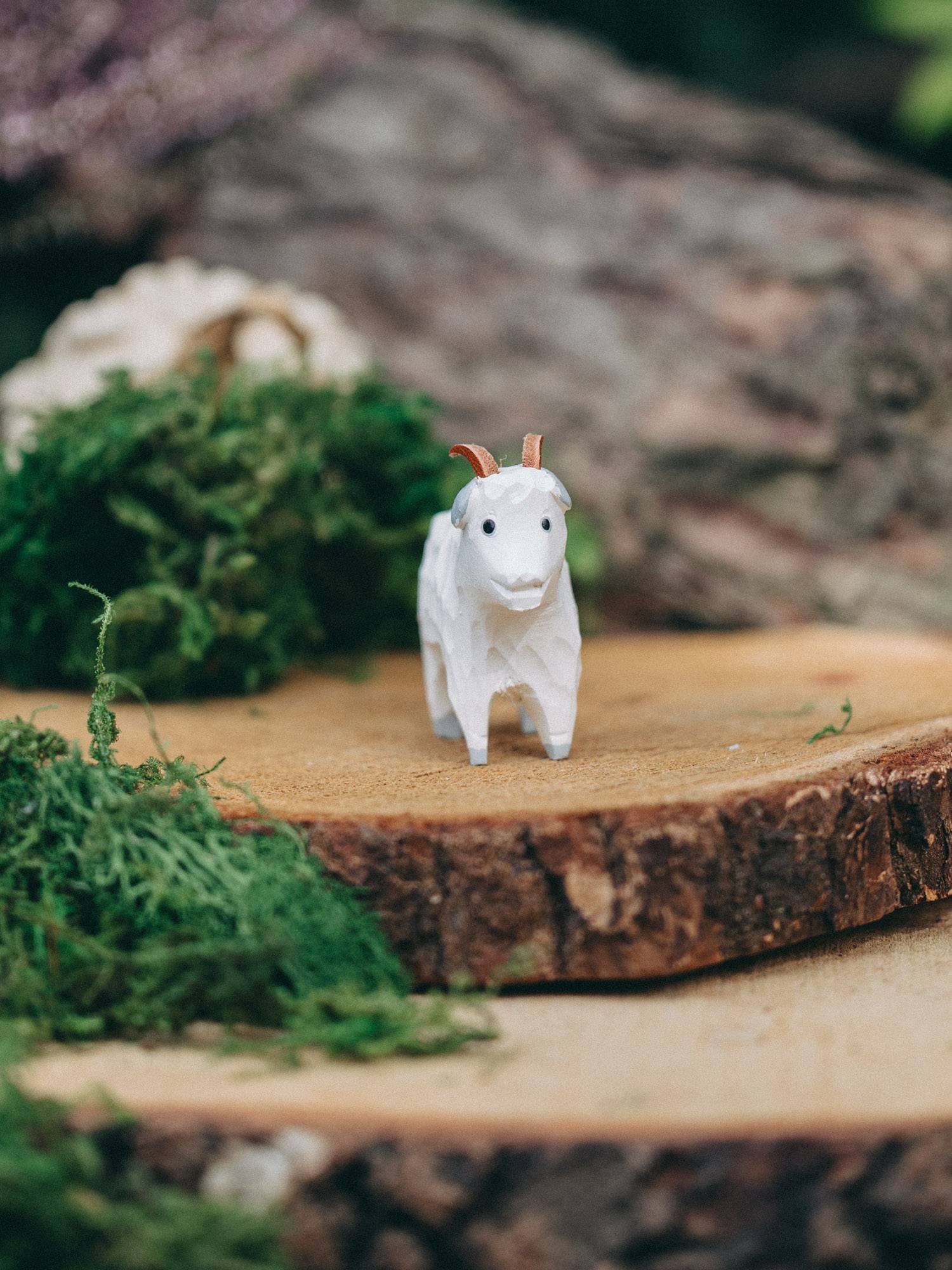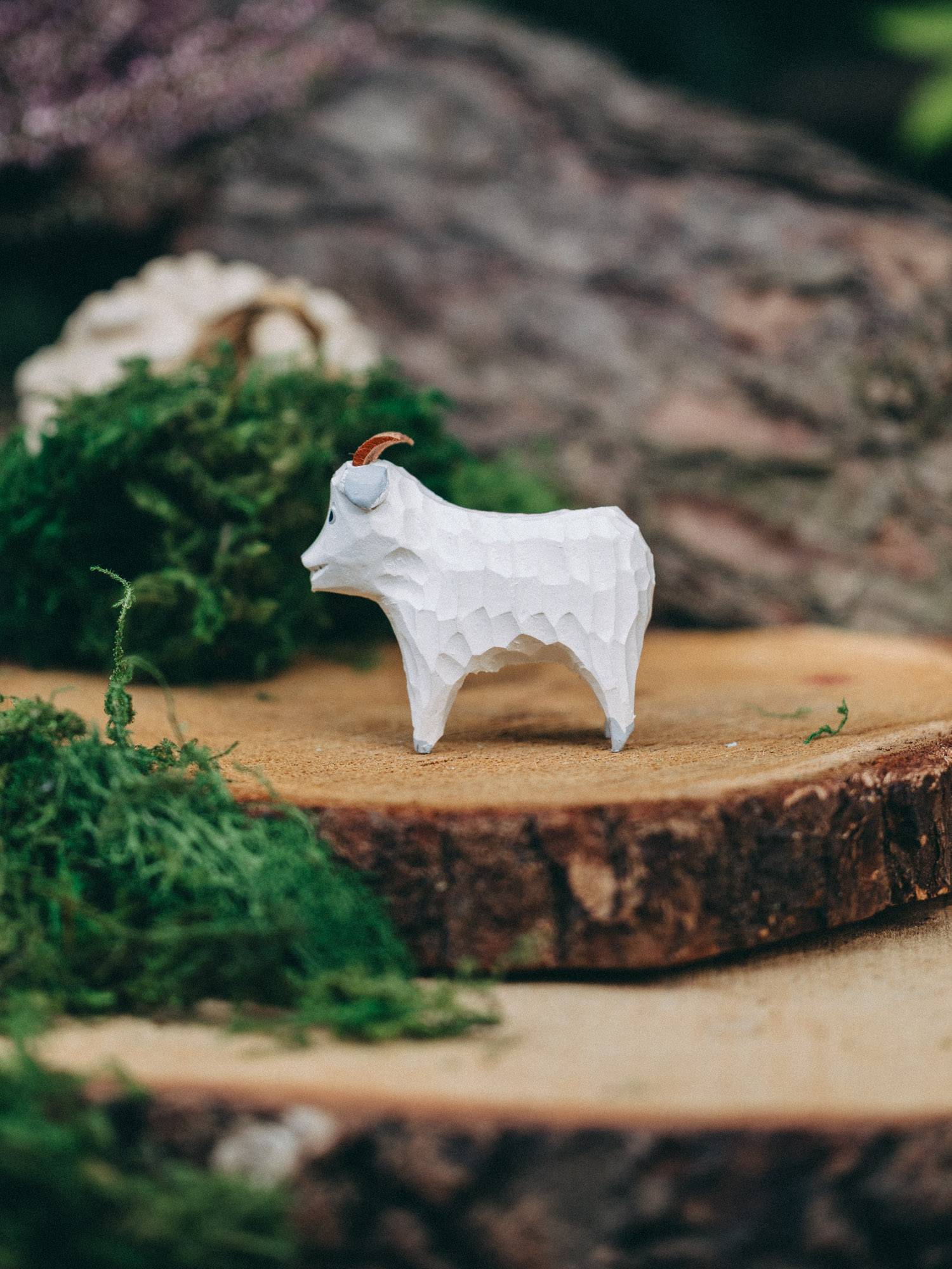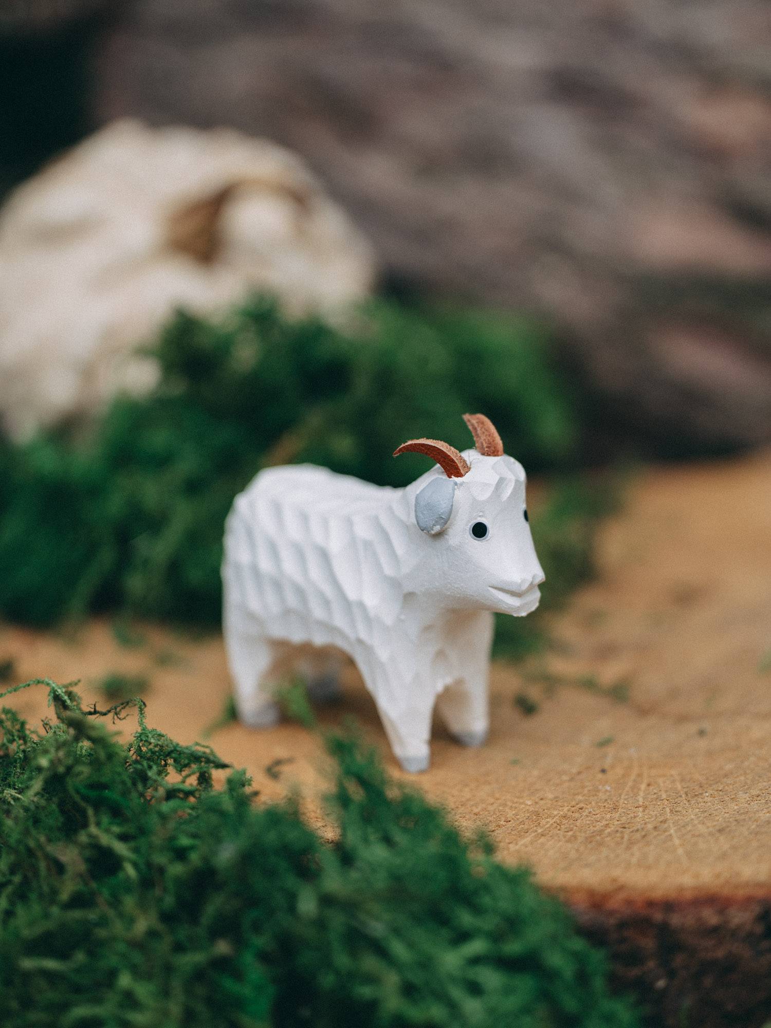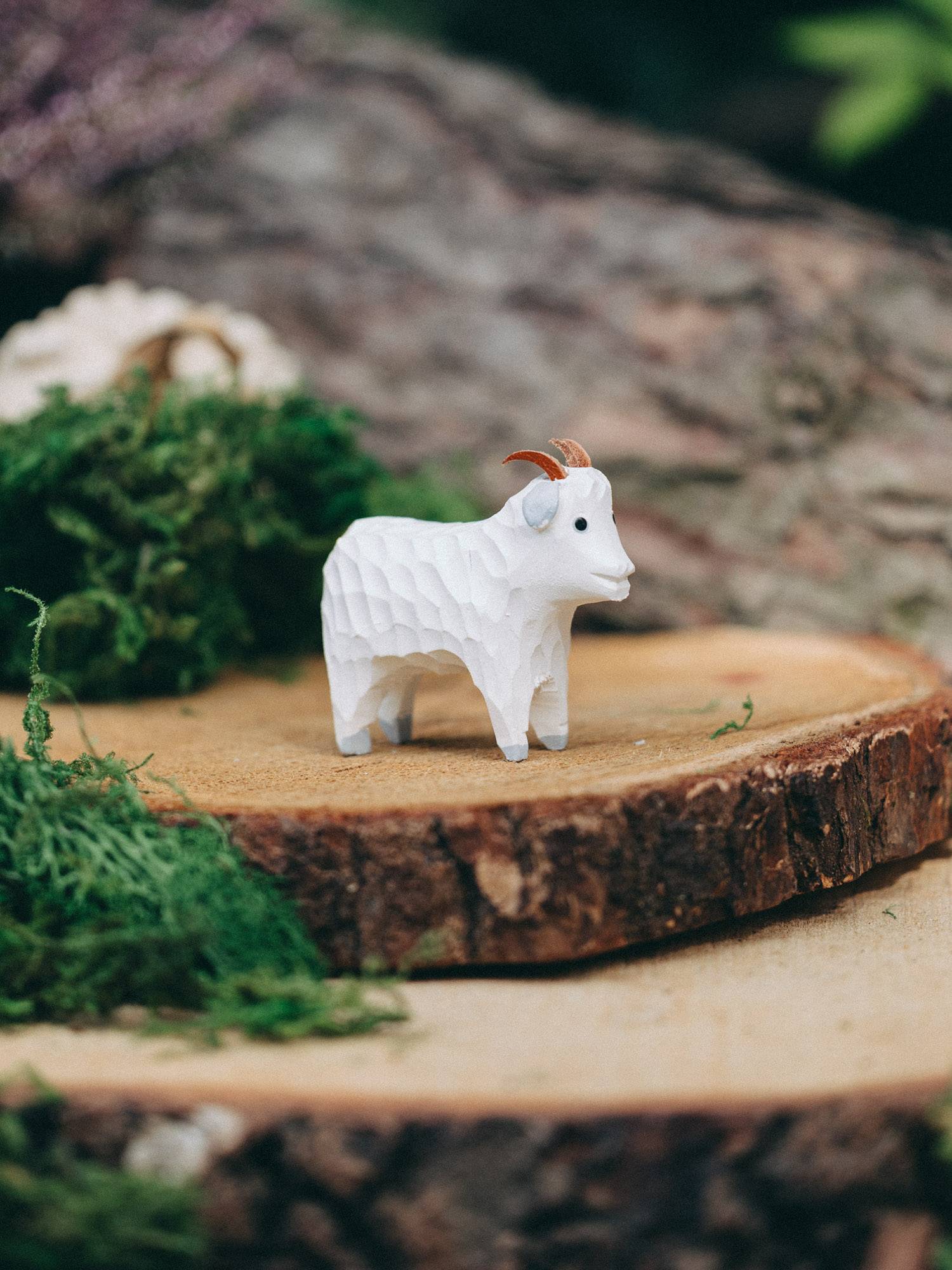 Drewniany baran biały wykonany ręcznie przez ludowego rzeźbiarza z regionu beskidzkiego. Jego powierzchnia jest chropowata. Baran stoi stabilnie na czterech nogach, z delikatnie uniesioną głową. Zwierzątko posiada szare uszka i brązowe rogi wycięte z naturalnej skóry.
