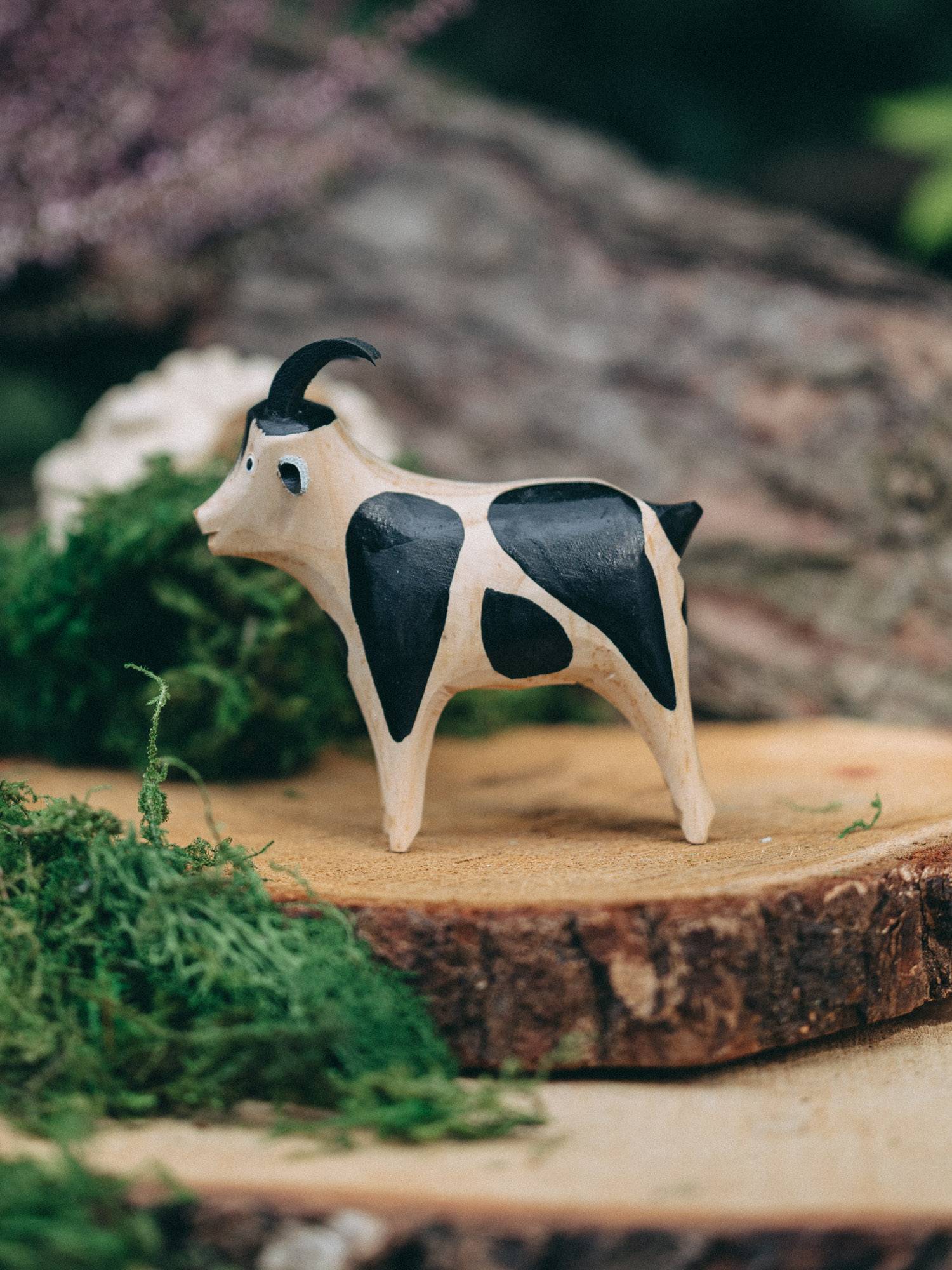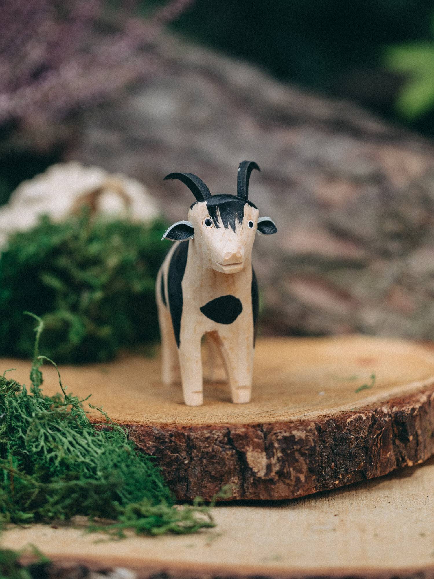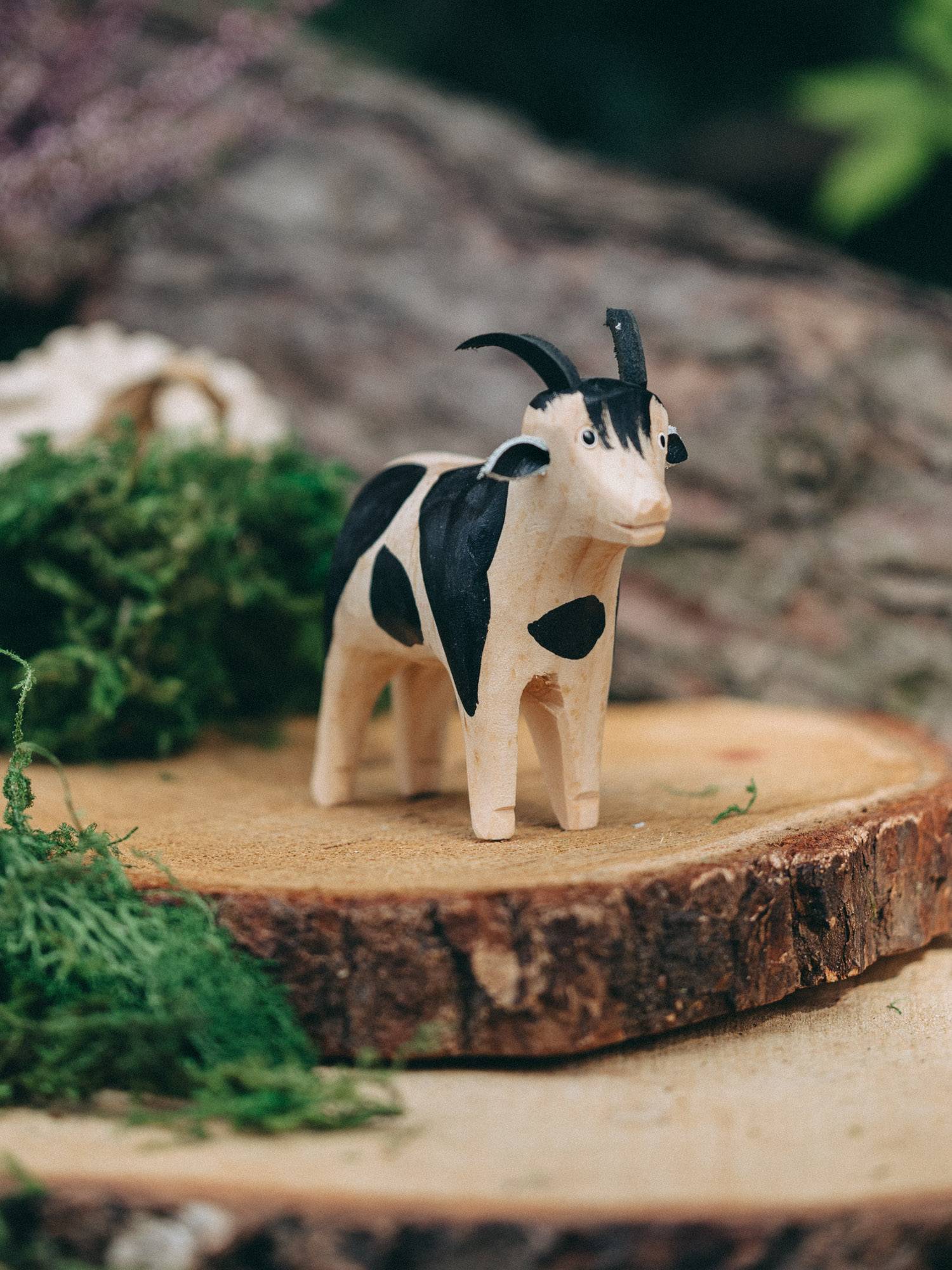 Ręcznie rzeźbiona koza z naturalnego drewna, zdobiona czarnymi łatami.