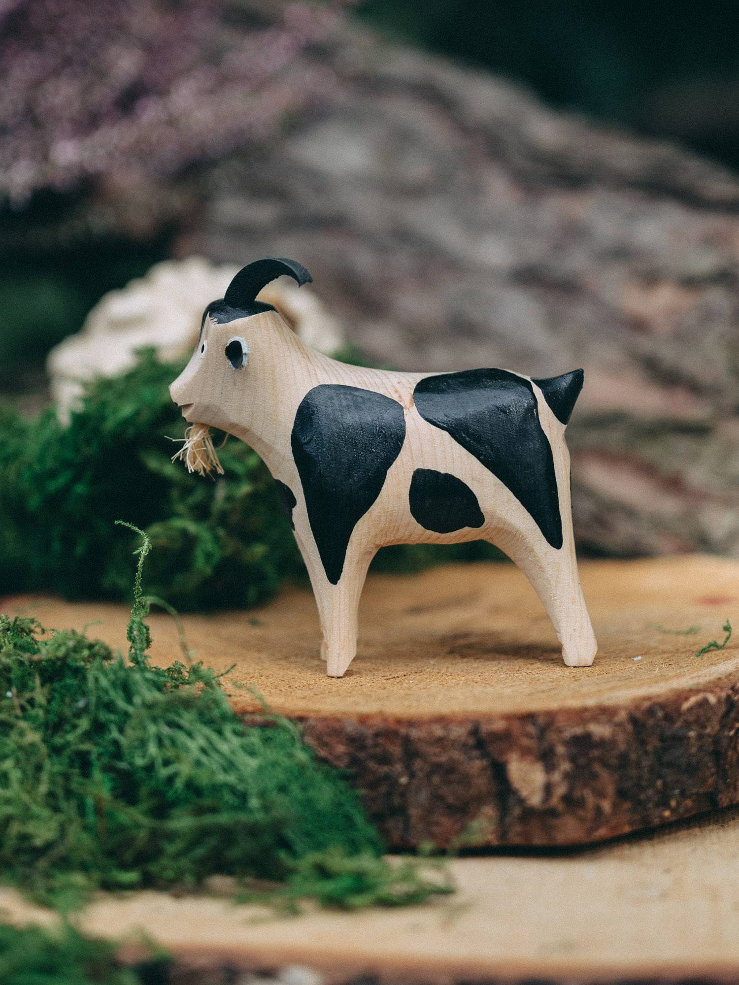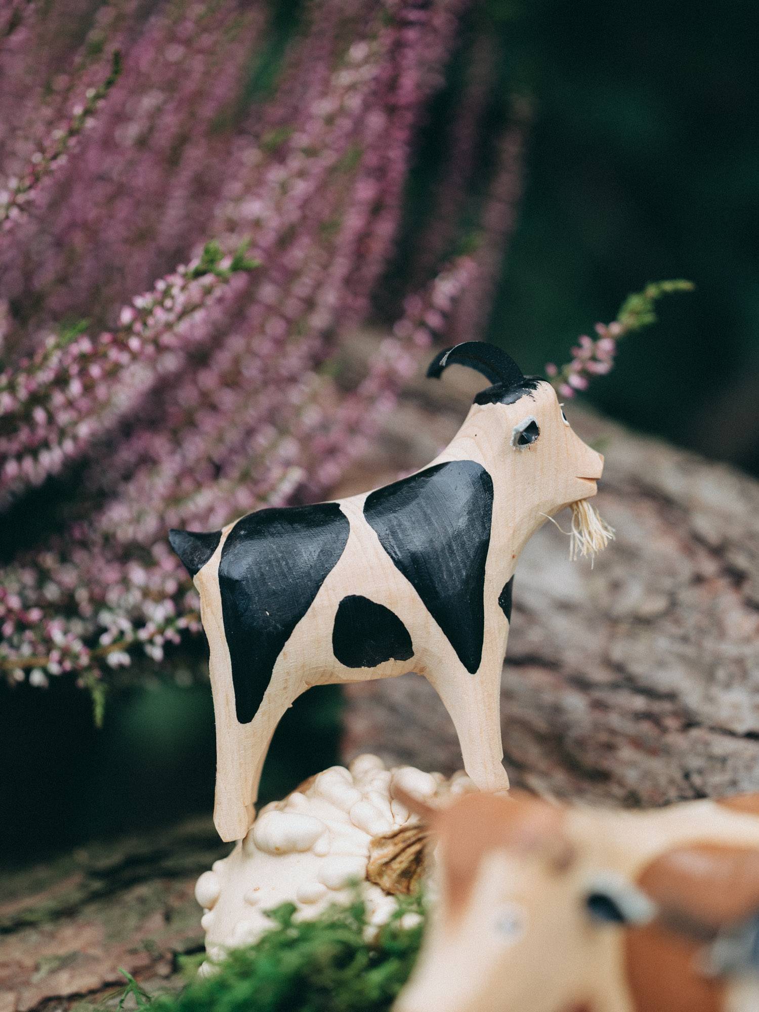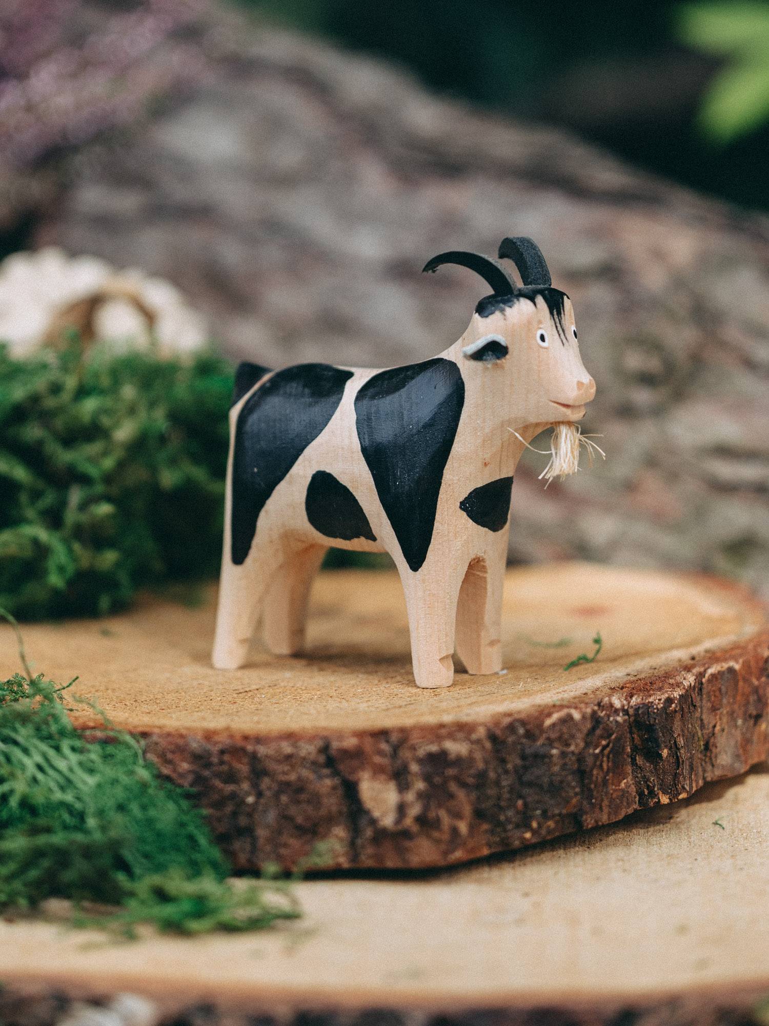 Zabawka rzeźbiona - koziołek w czarne łatki
