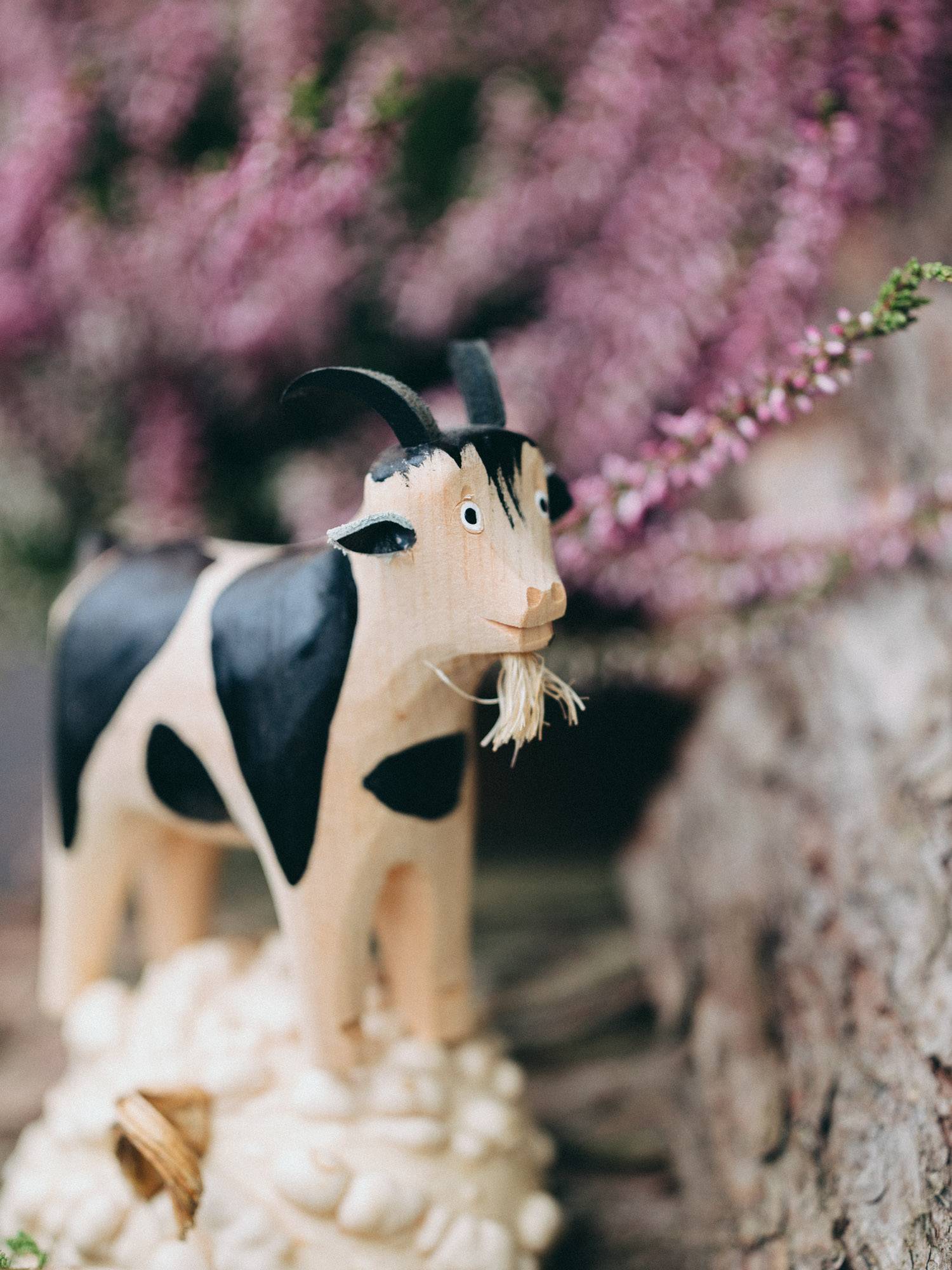 Ręcznie wykonany i malowany koziołek z czarnymi łatami i naturalną bródką, dzięki której wygląda bardzo realistycznie. Zwierzątko posiada czarne różki oraz uszka wycięte z naturalnej skóry. Koziołek został wykonany przez rzeźbiarza z regionu beskidzkiego.