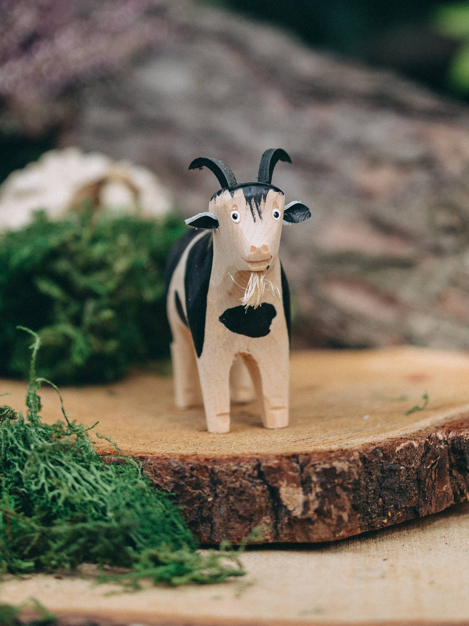 Ręcznie wykonany koziołek w jasnym kolorze drewna, zdobiony czarnymi łatkami i bródką.