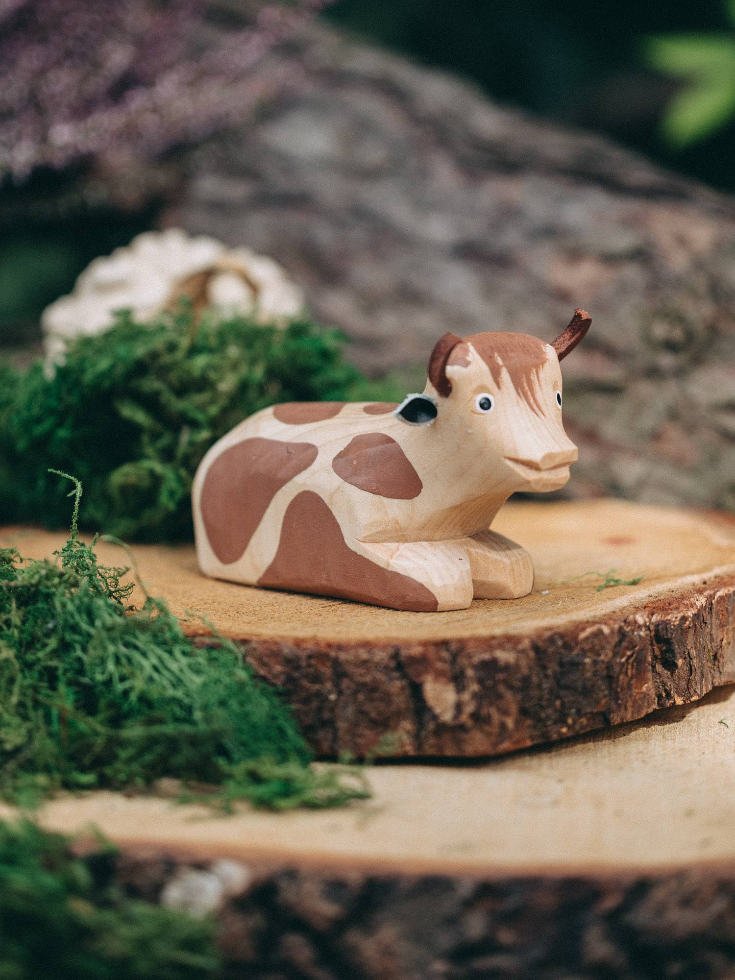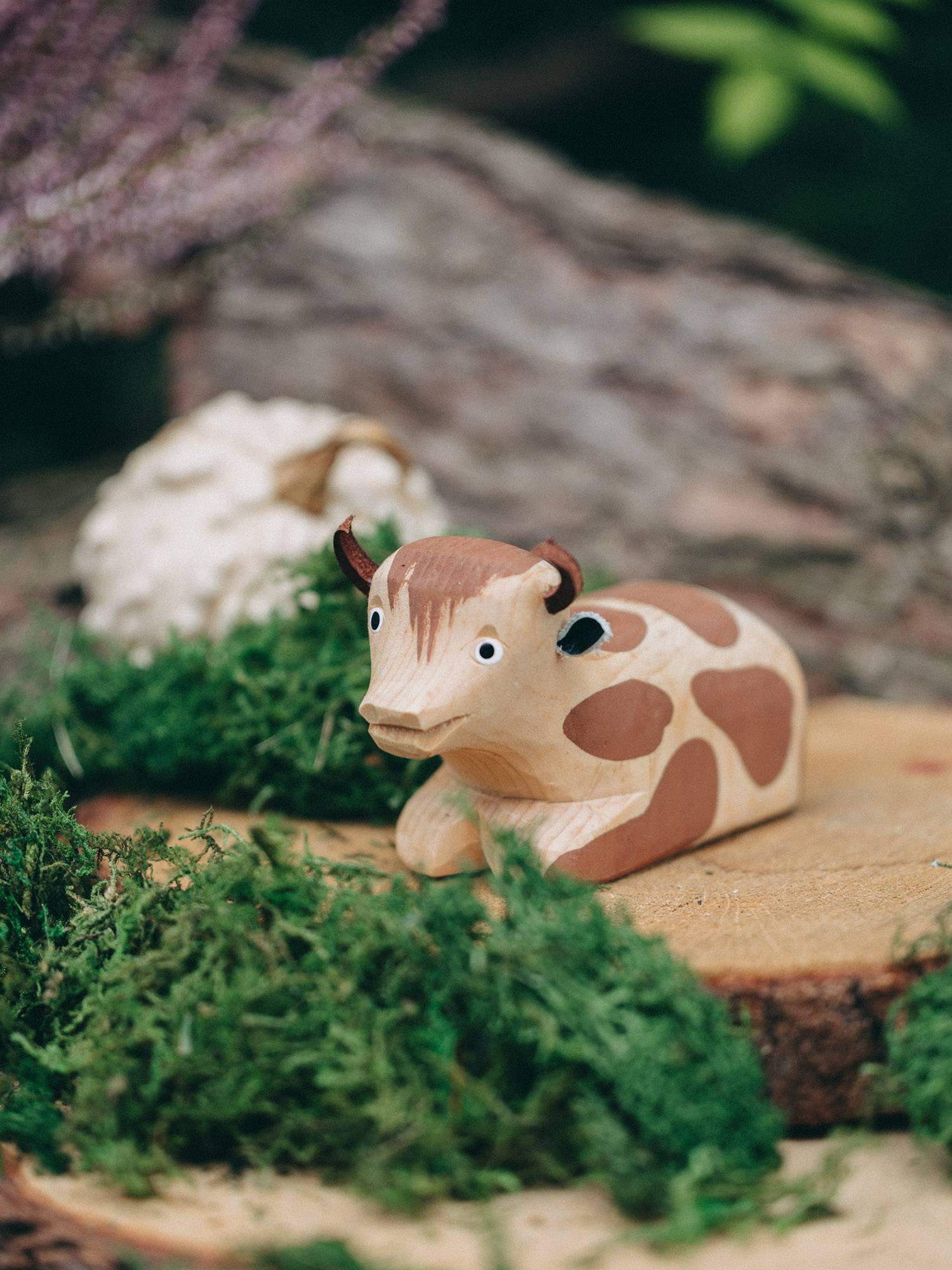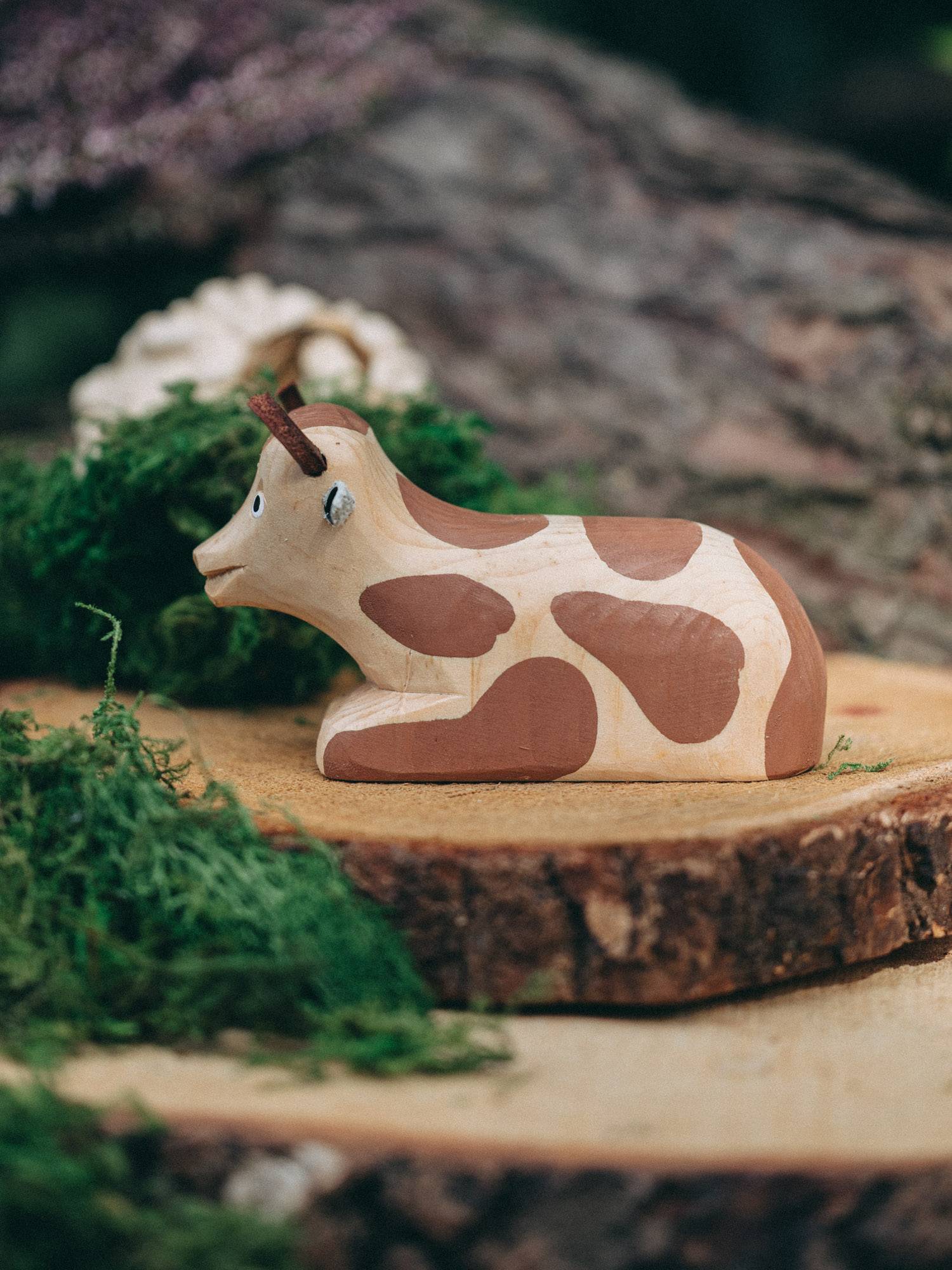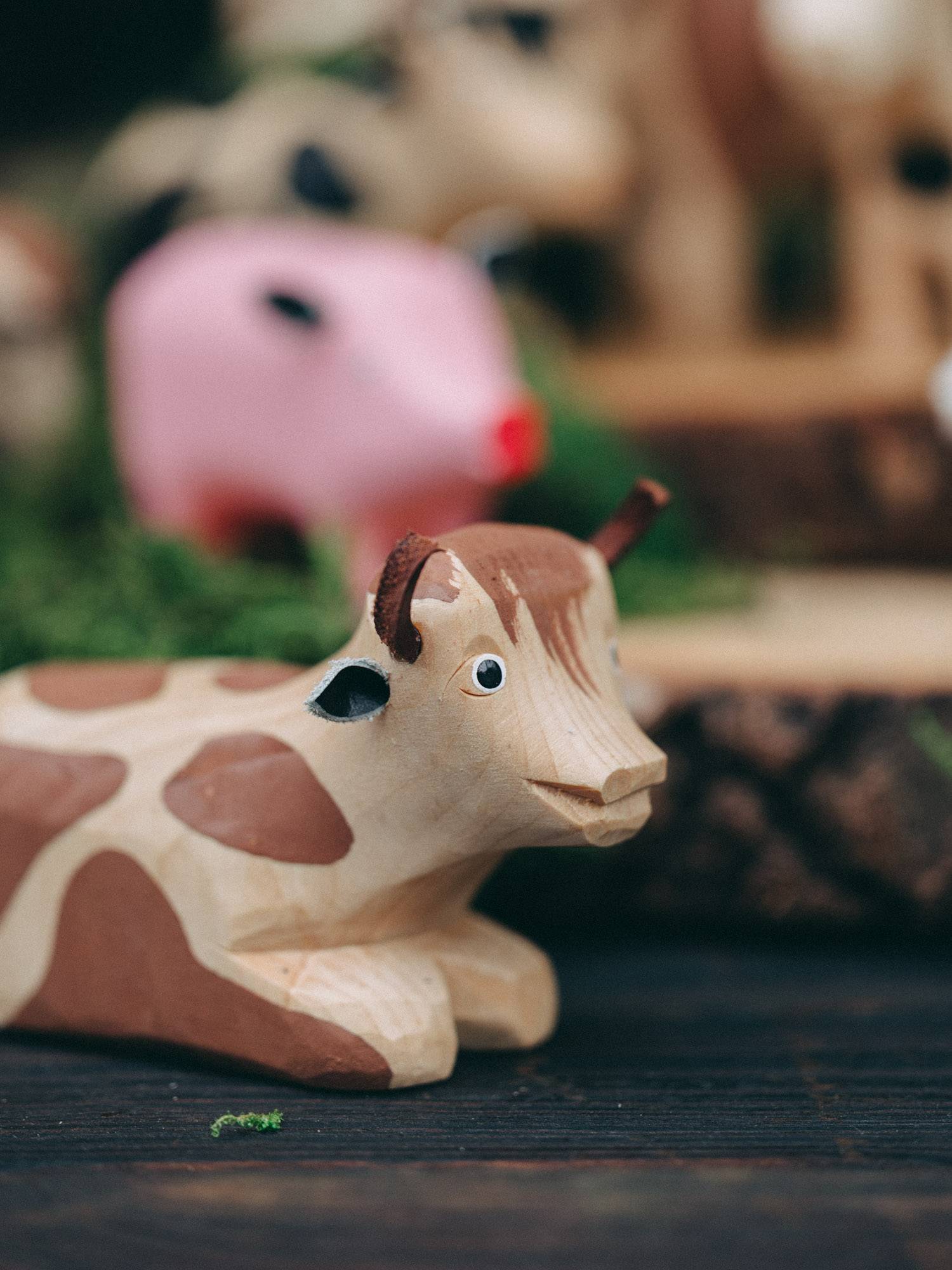 Rzeźbiona zabawka krowy leżącej w jasnym kolorze drewna, ozdobiona brązowymi łatkami.