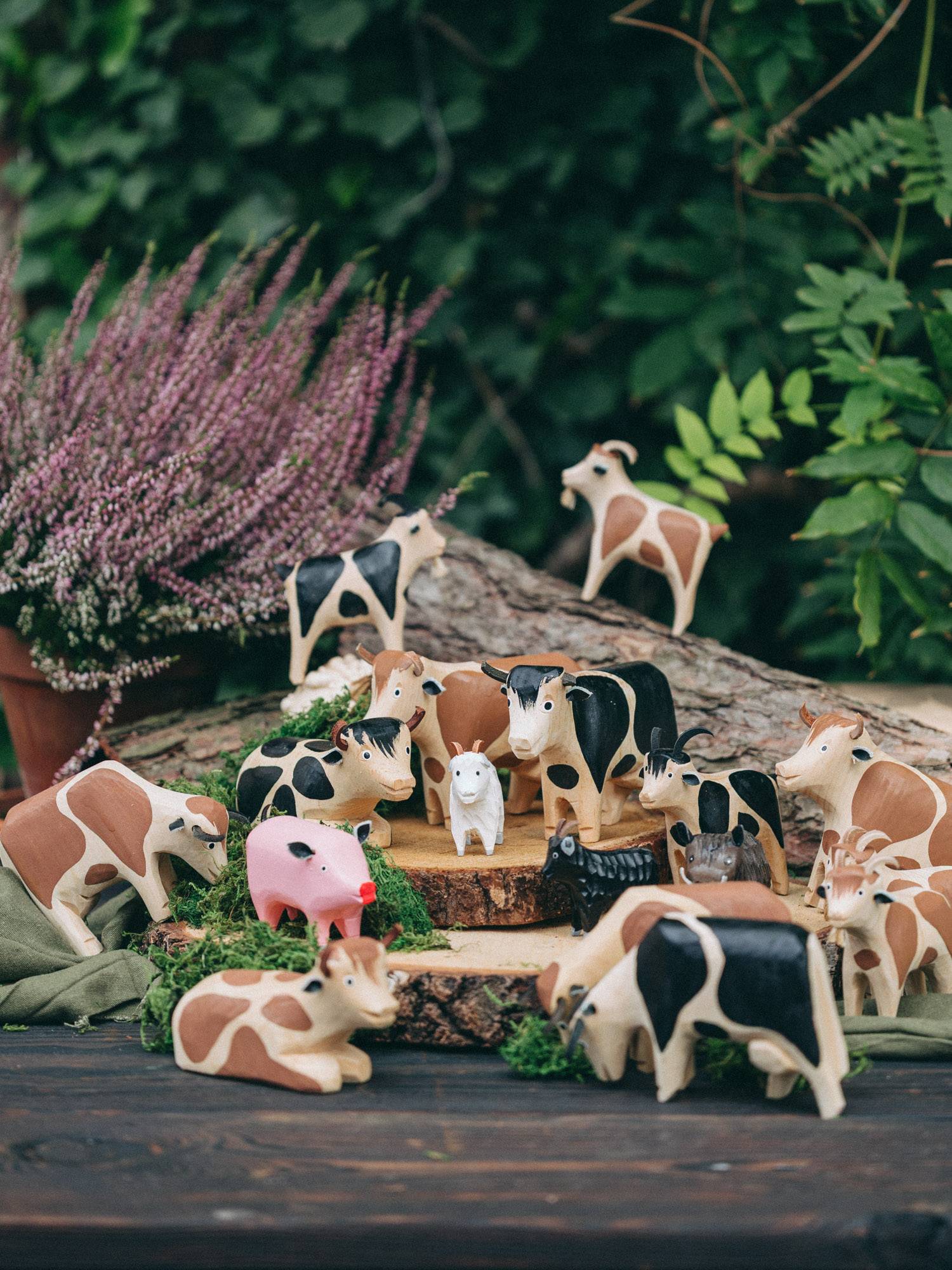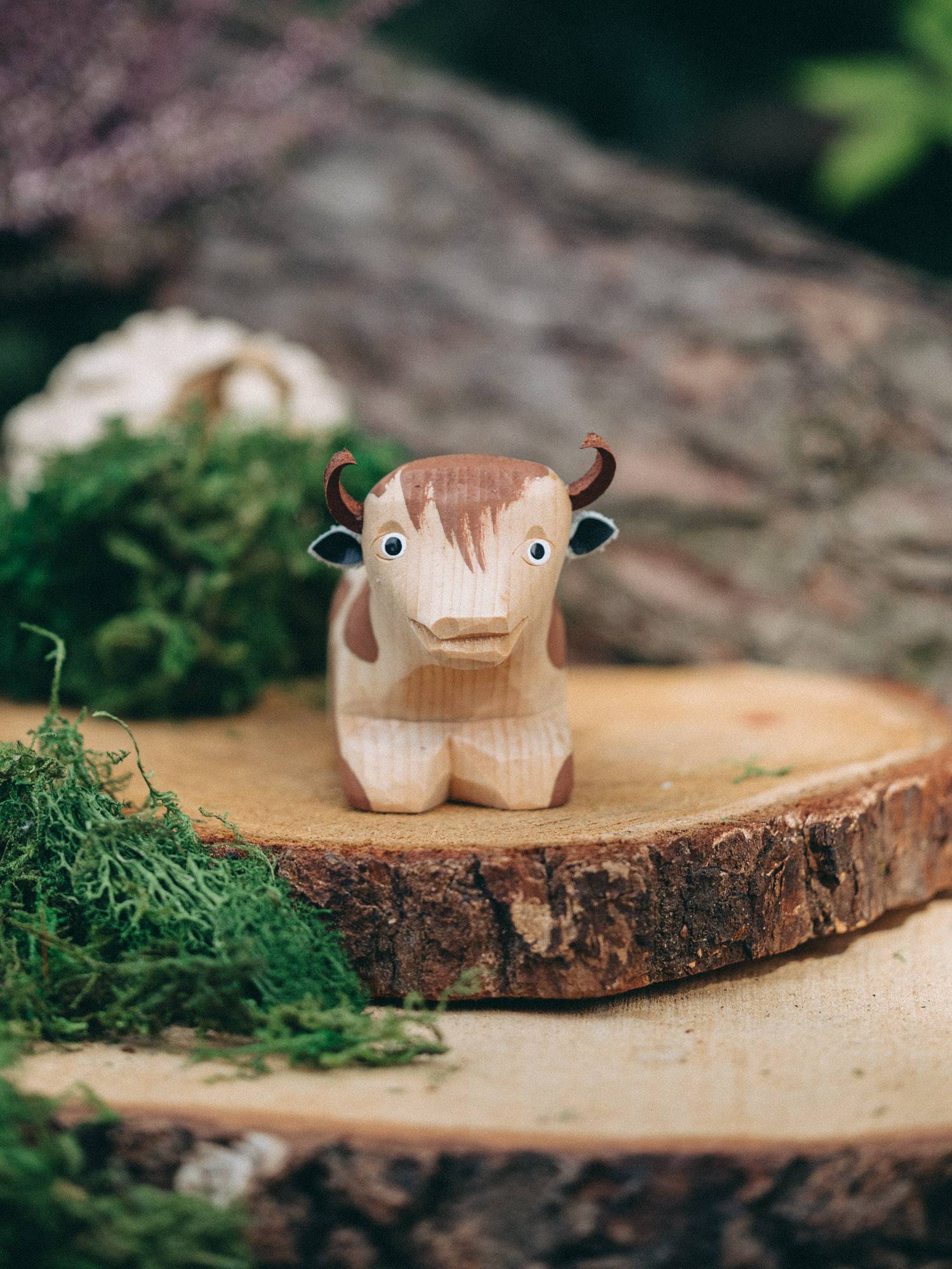 Drewniana krowa, pomalowana w charakterystyczne brązowe łatki na naturalnym tle drewna. Zabawka przedstawiona jest w pozycji leżącej, z głową lekko uniesioną do przodu. Zwierzątko posiada czarne różki oraz uszka wycięte z naturalnej skóry. Krowa została wykonana przez rzeźbiarza z regionu beskidzkiego.