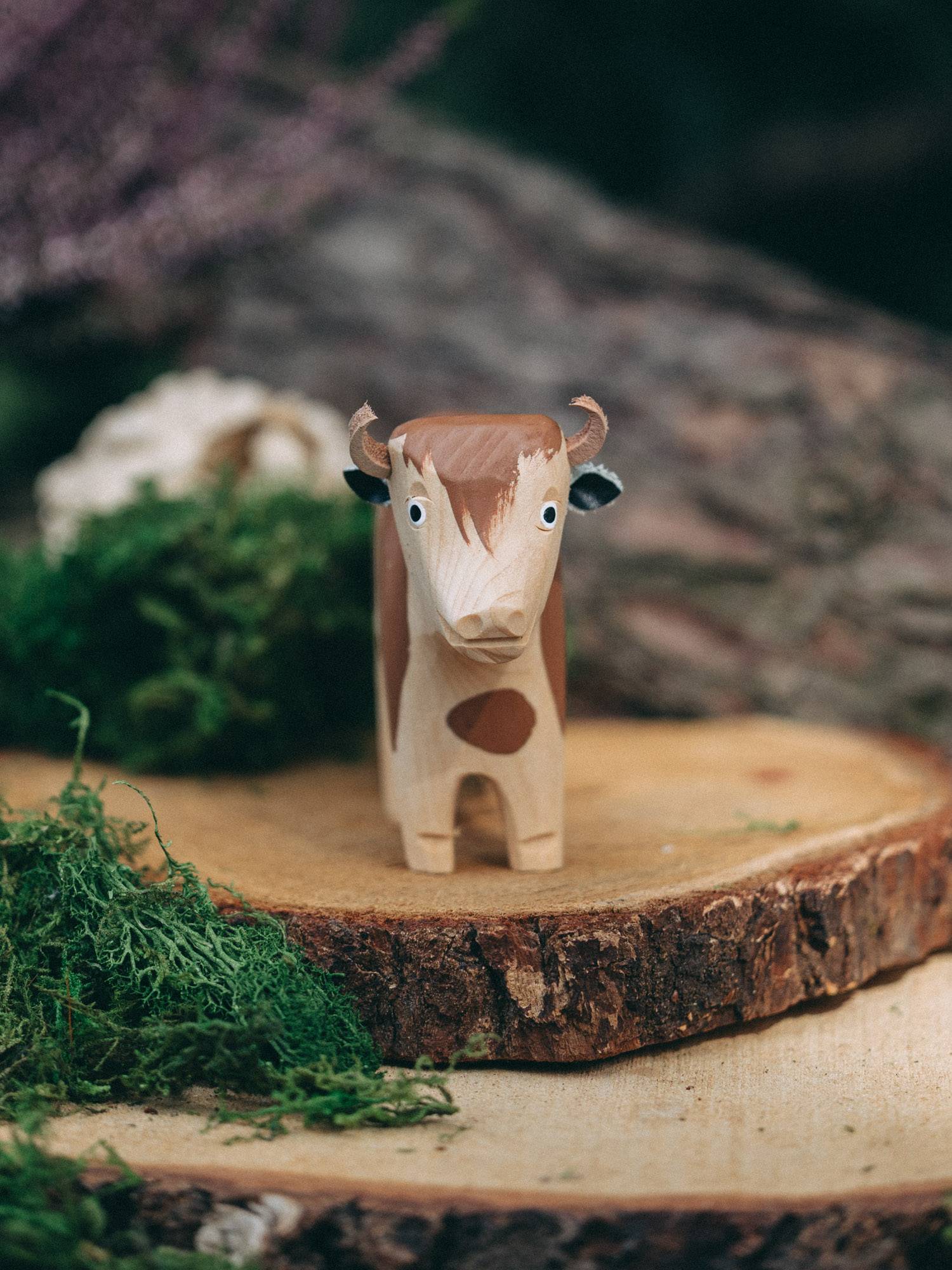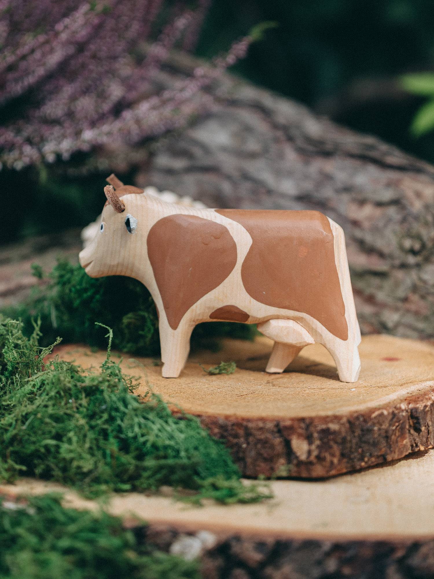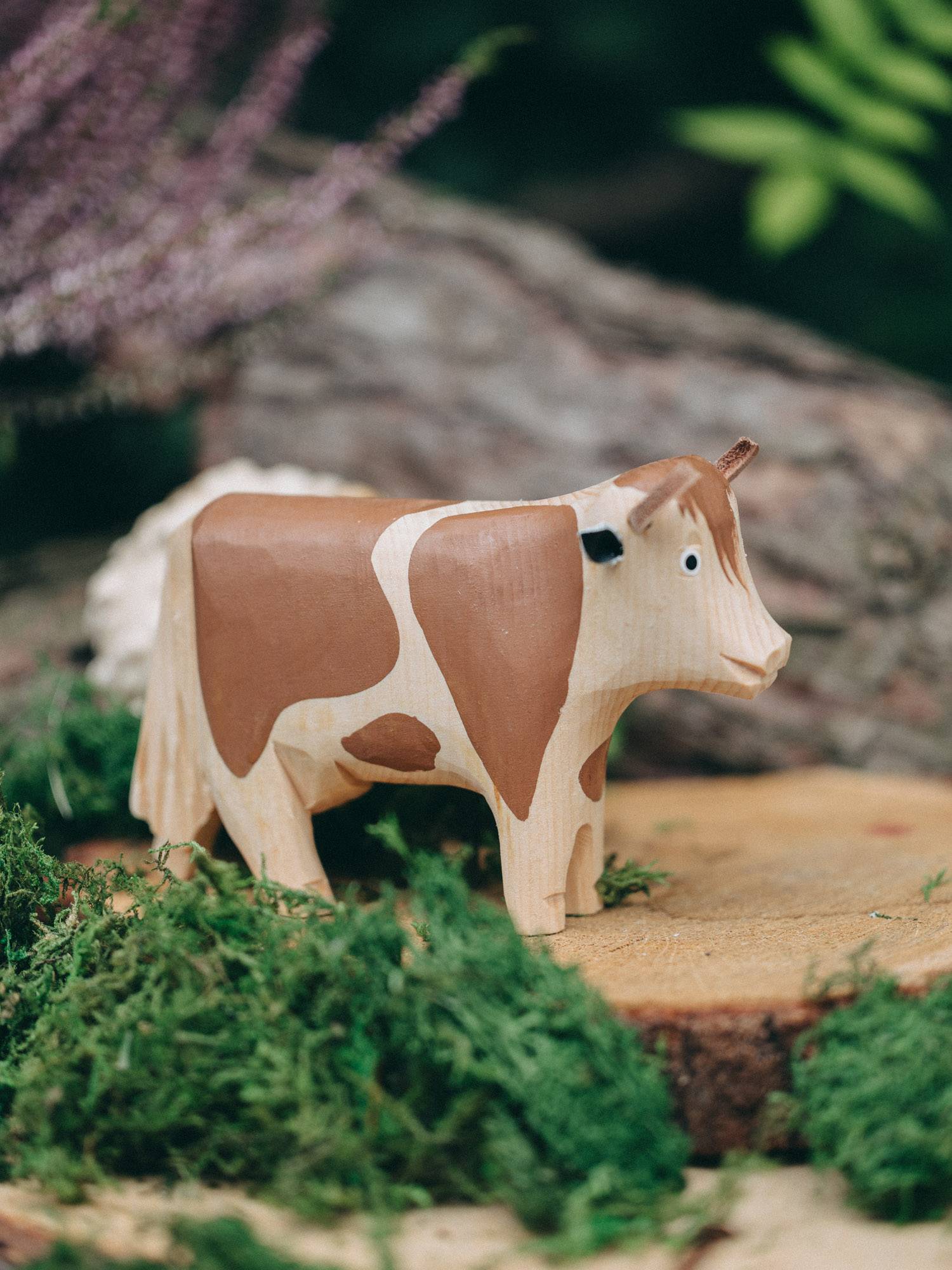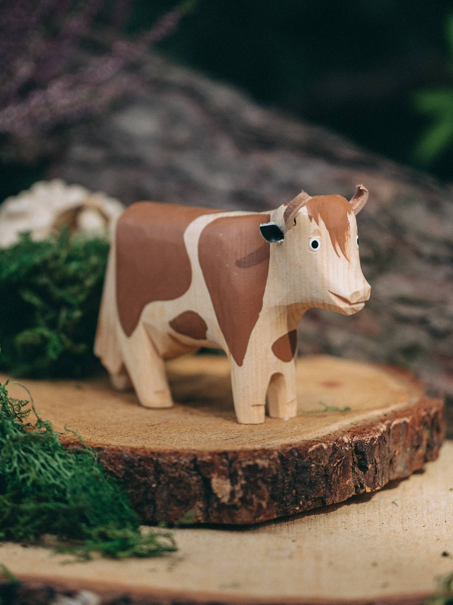 Drewniana krowa wykonana ręcznie przez ludowego rzeźbiarza z regionu beskidzkiego. Jej powierzchnia jest gładka, przyjemna w dotyku, a brązowe łatki idealnie pasują do jasnego drewna. Krowa stoi stabilnie na czterech nogach, z delikatnie uniesioną głową. Zwierzątko posiada bródkę, czarne różki i uszka wycięte z naturalnej skóry.