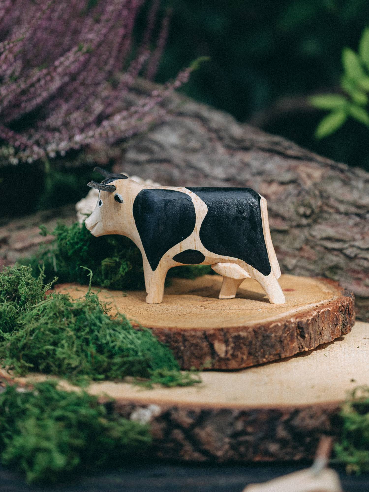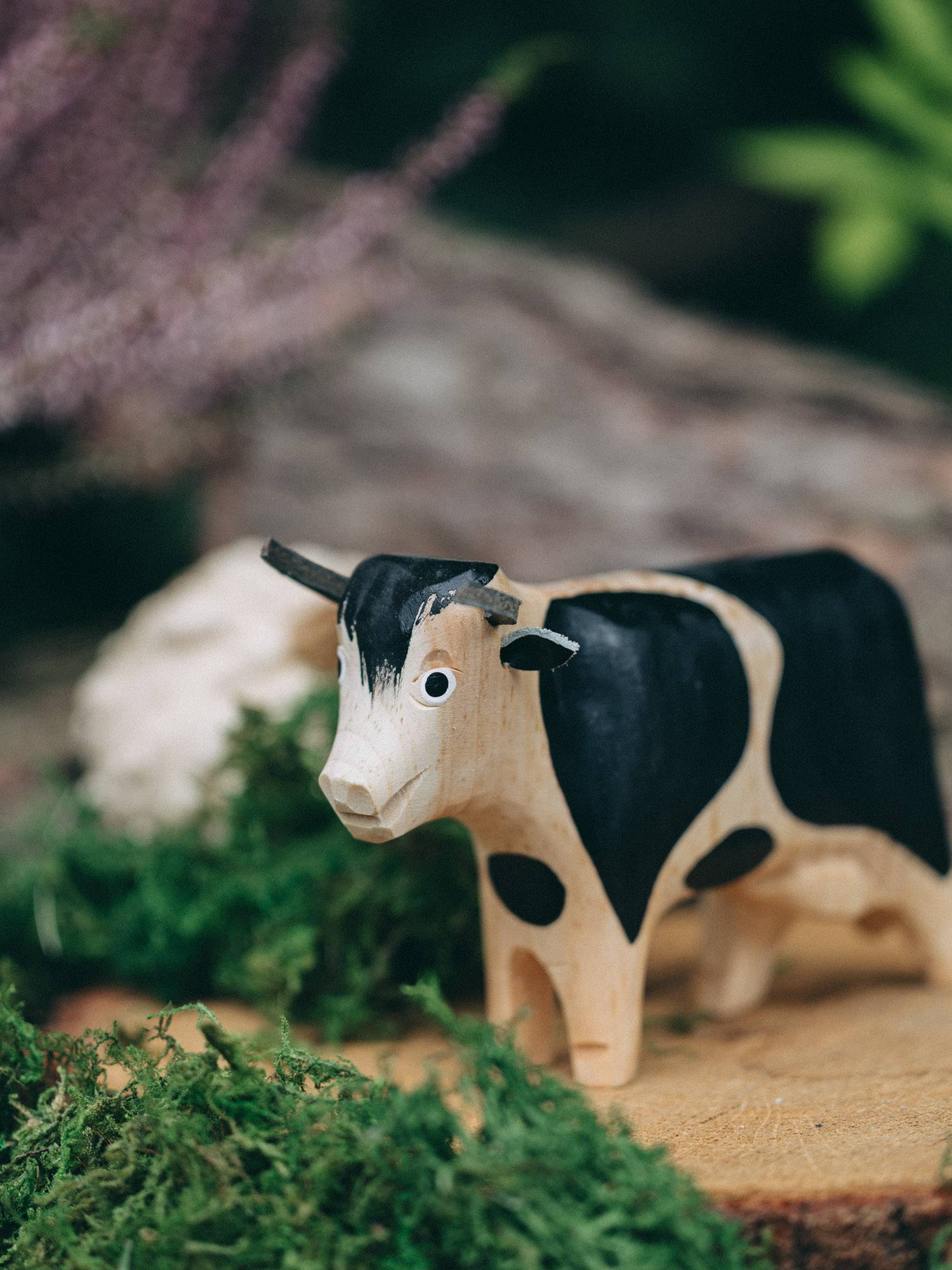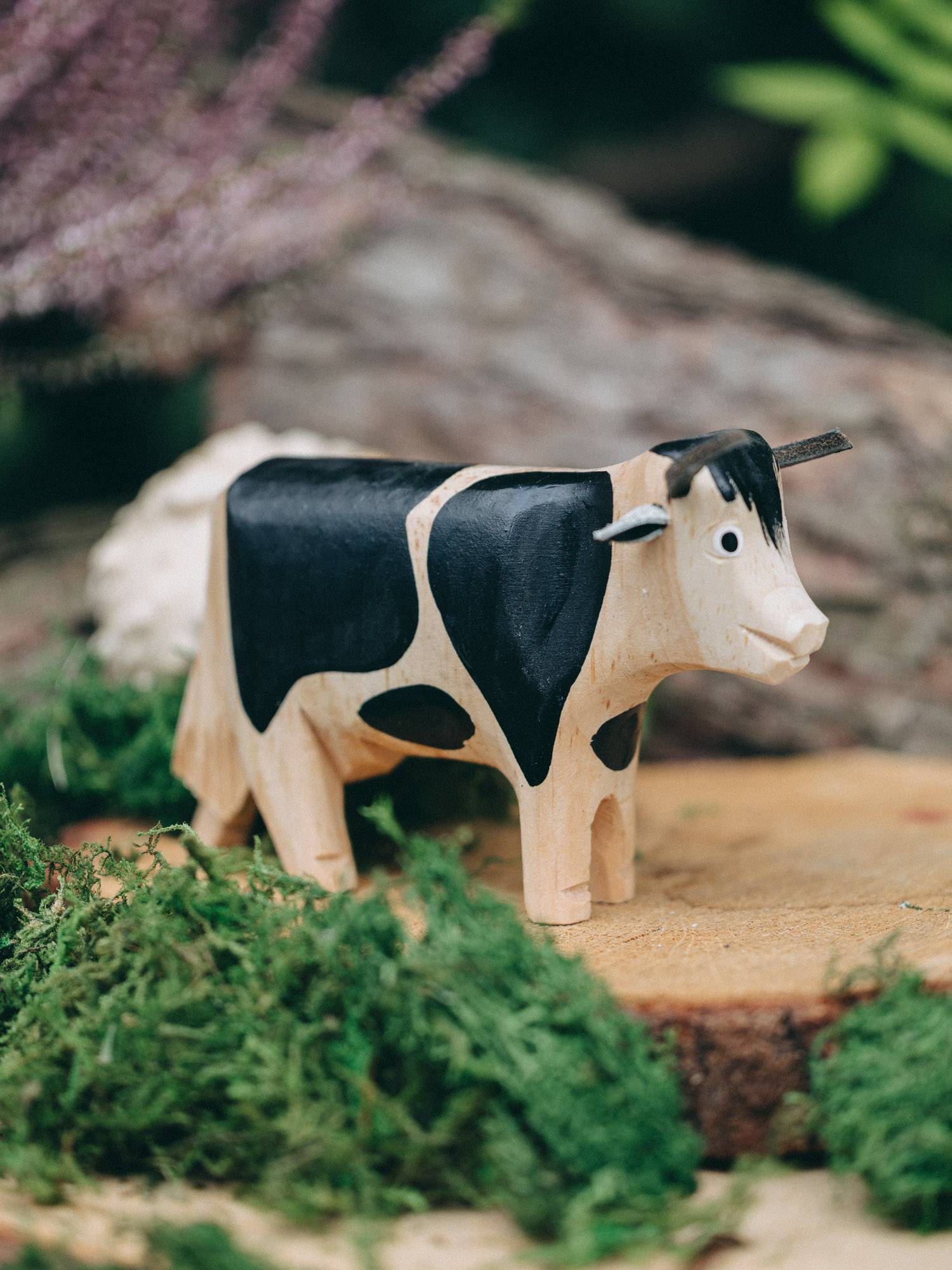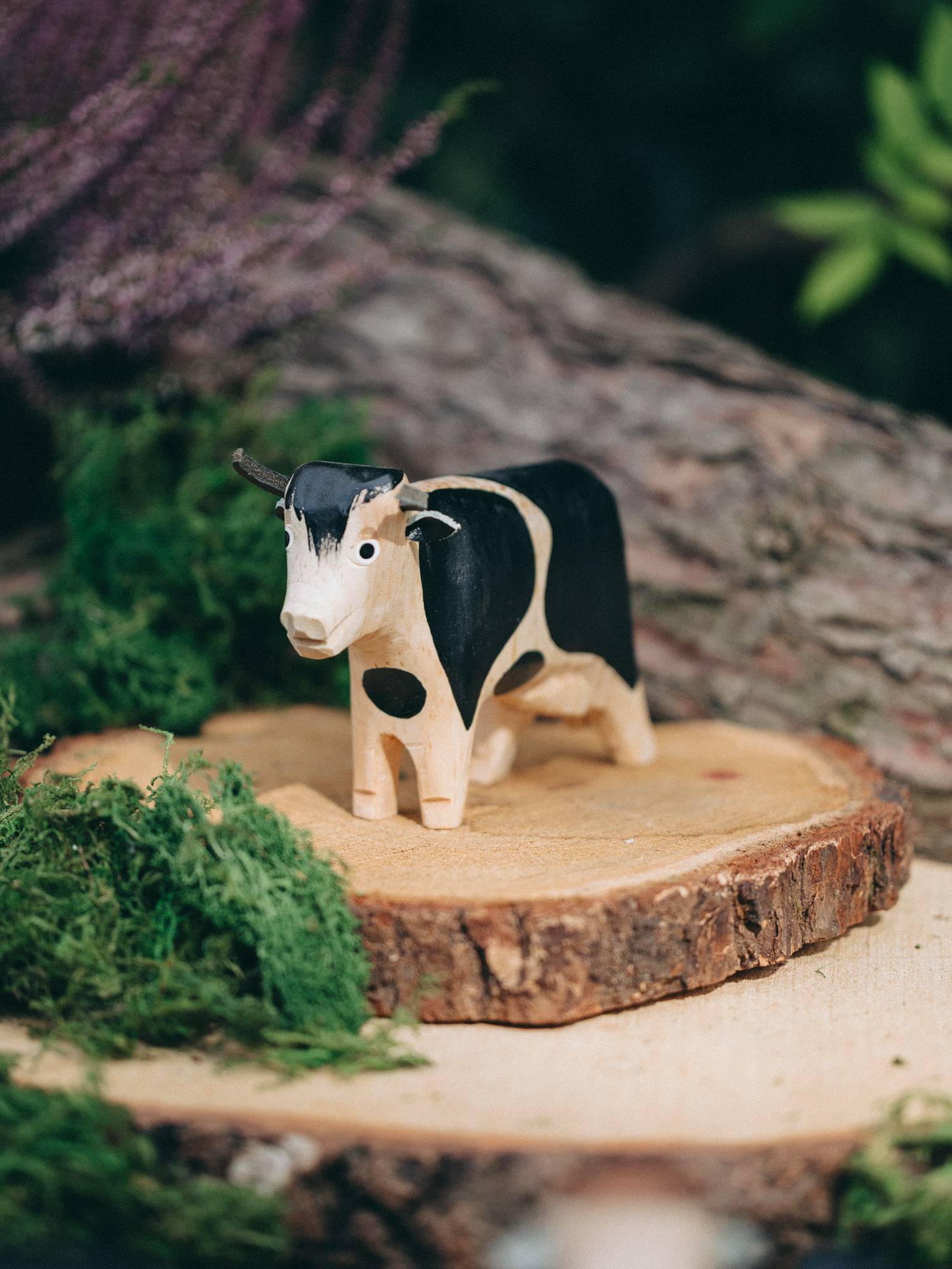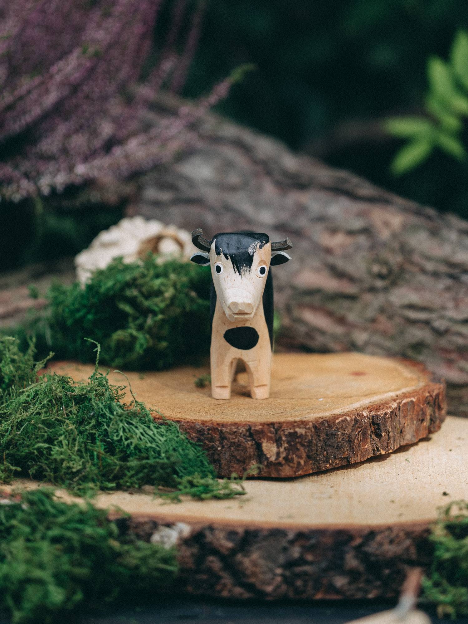 Rzeźbiona krowa stojąca w jasnym kolorze drewna, ozdobiona czarnymi łatkami. Zwierzątko posiada czarne różki oraz uszka wycięte z naturalnej skóry. Krowa została wykonana przez rzeźbiarza z regionu beskidzkiego.