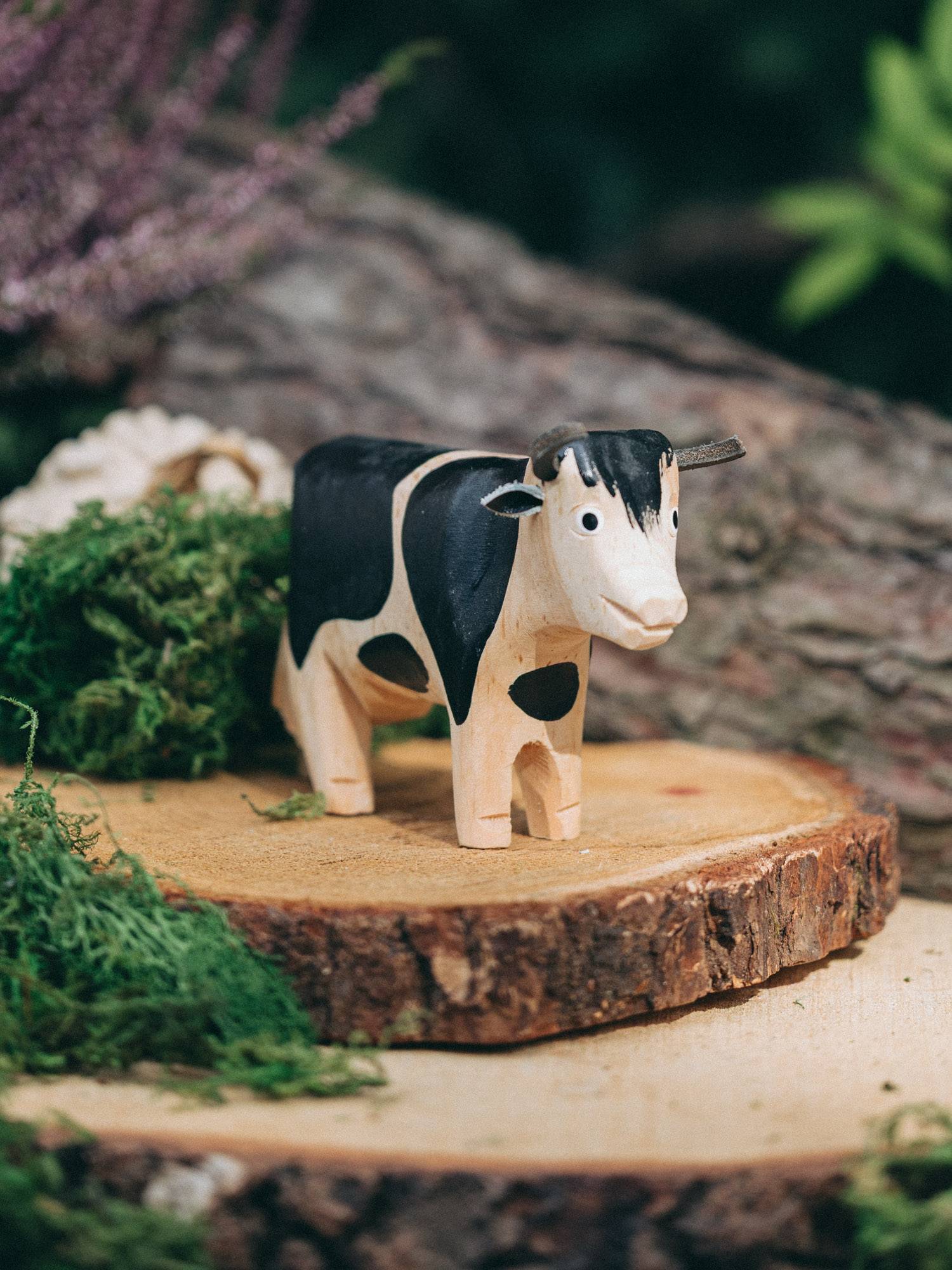 Rzeźbiona krowa stojąca w jasnym kolorze drewna, ozdobiona czarnymi łatkami.