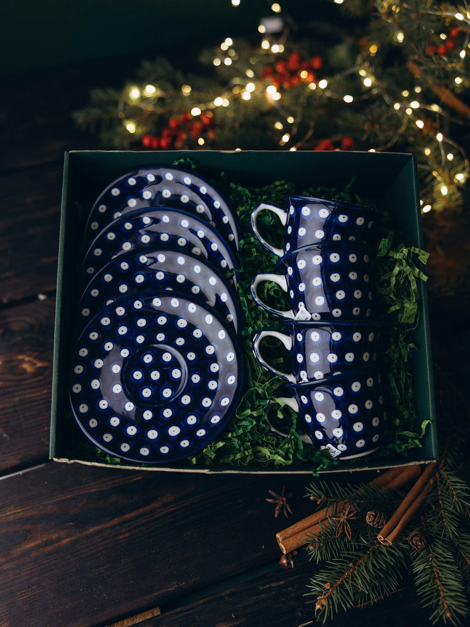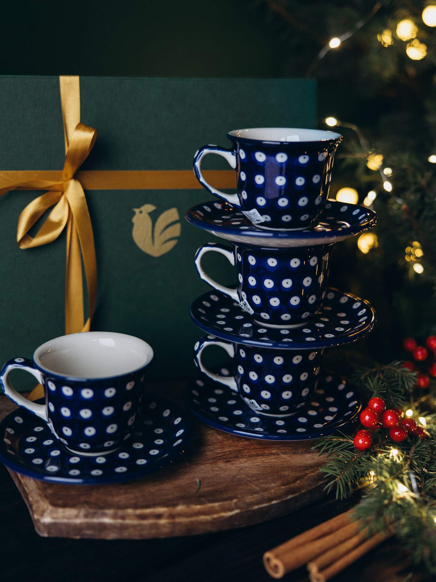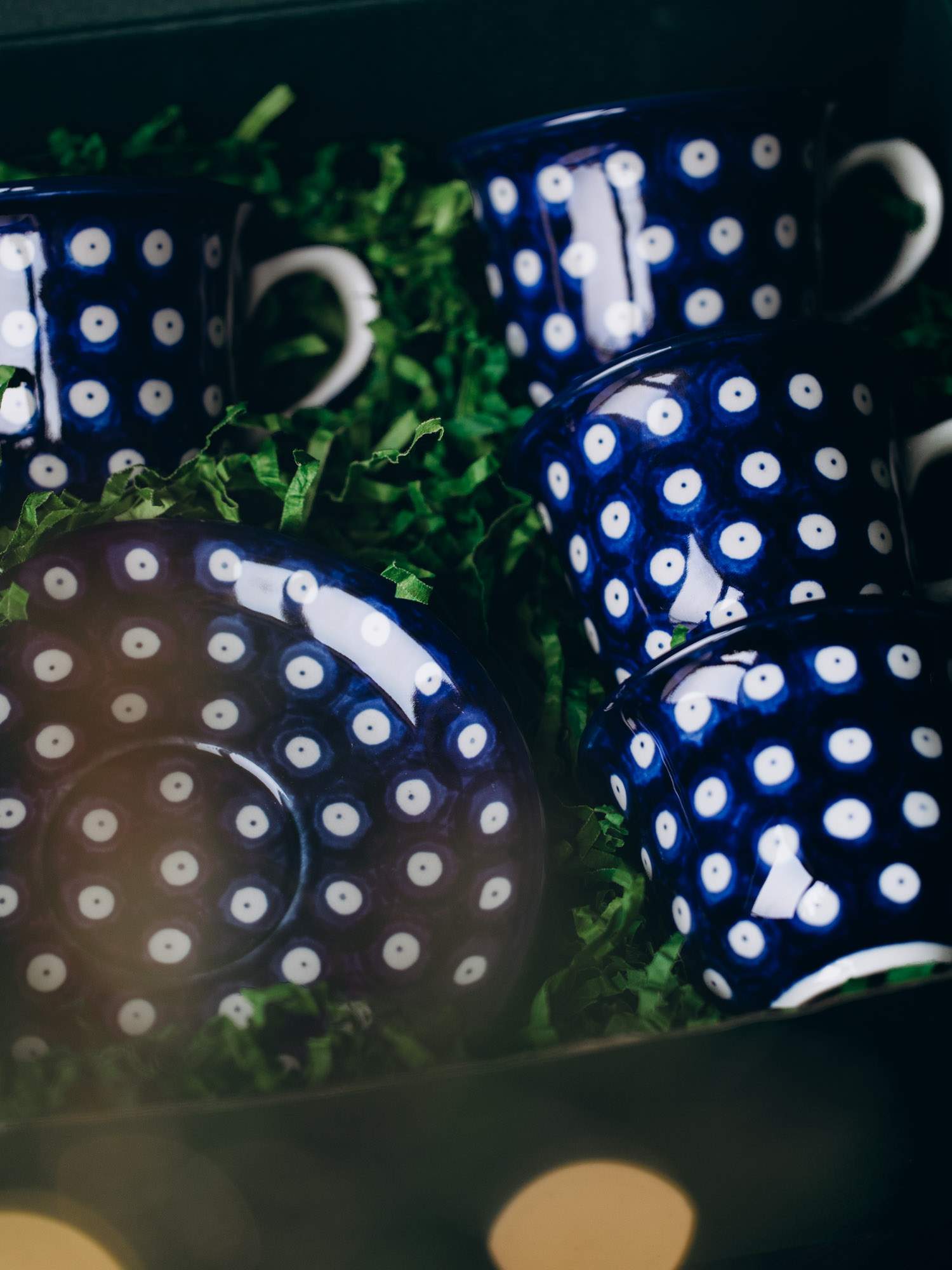 Elegancki zestaw czterech filiżanek kawowych z wywiniętym brzegiem, w komplecie ze spodkami. Jasna ceramika została ozdobiona ręcznie, kobaltowym wzorem groszków. Spodki posiadają delikatne wgłębienie, które pozwala utrzymać filiżankę w odpowiednim miejscu. Filiżanki zapakowane są w zielone pudełko, wypełnione dekoracyjnymi wiórkami oraz ozdobione wstążką i złotym kogucikiem. Idealny zestaw na prezent.