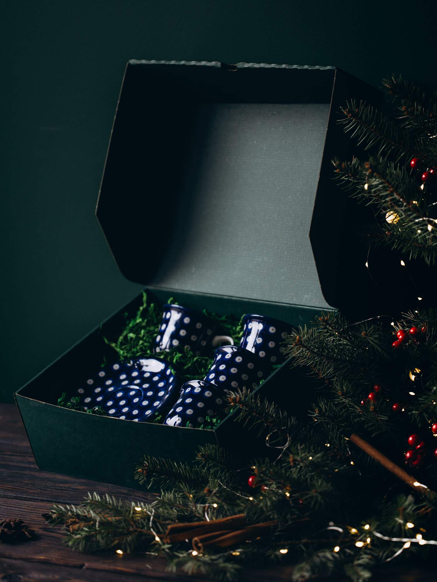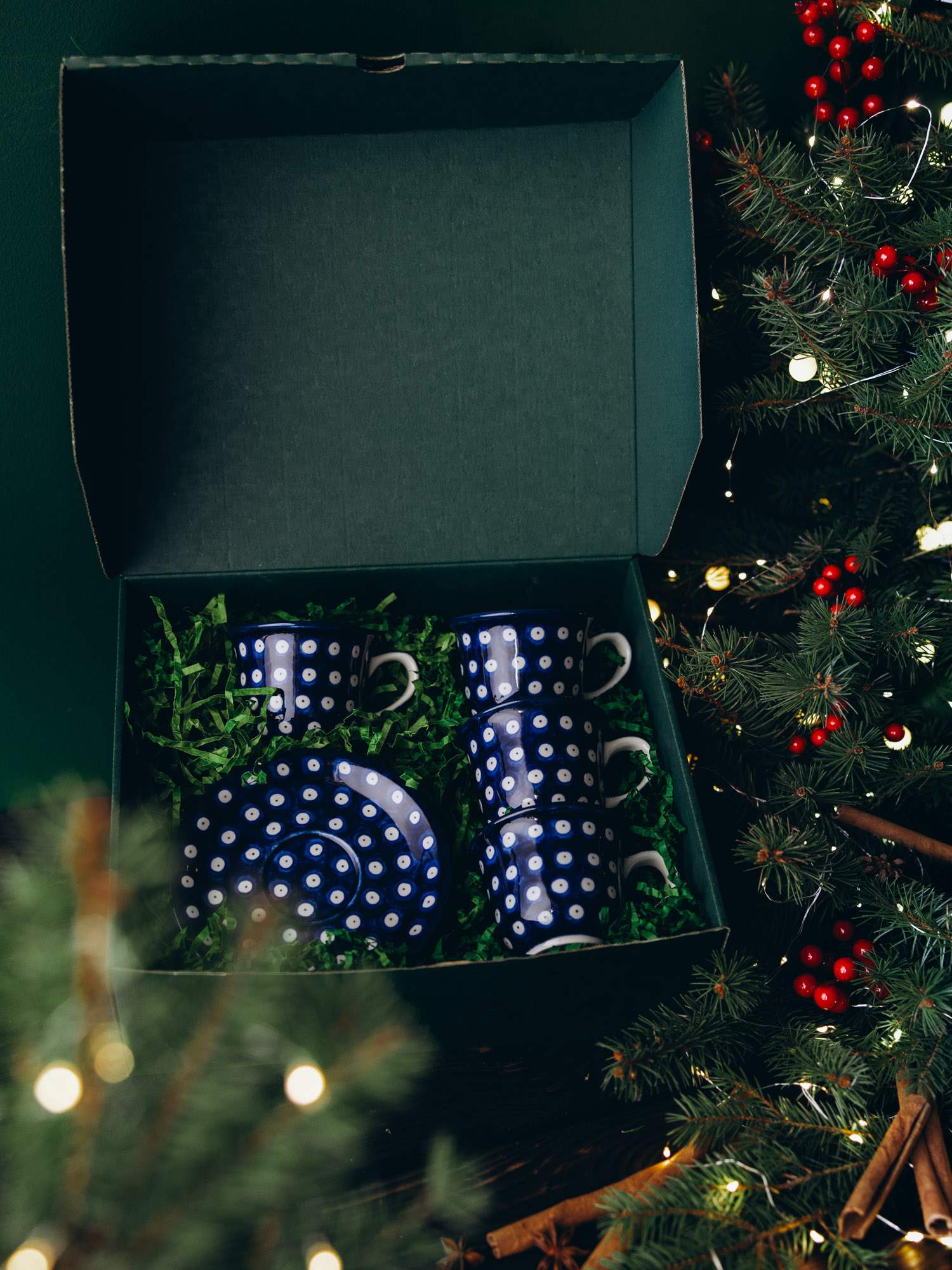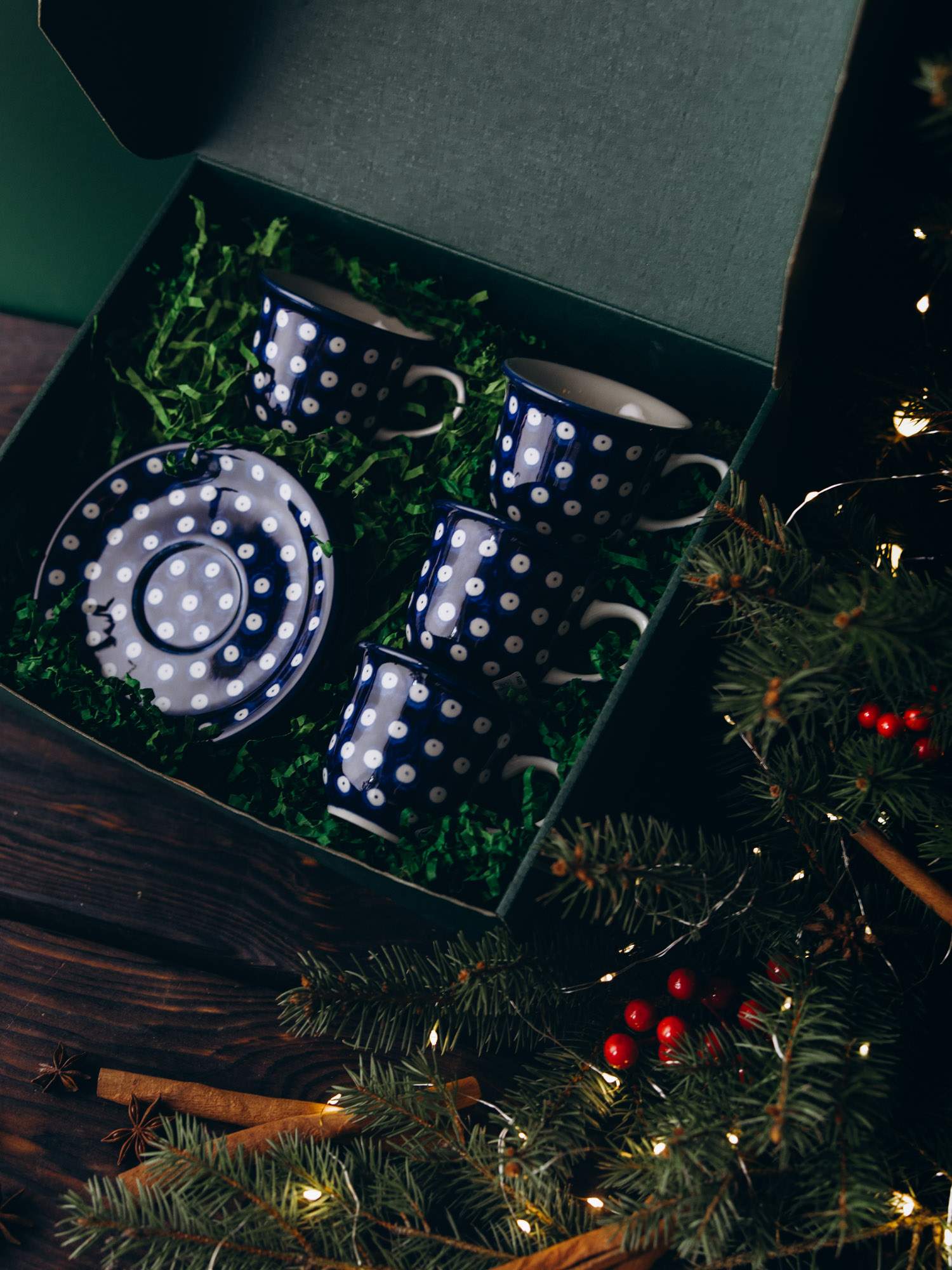Elegancki zestaw czterech filiżanek kawowych z wywiniętym brzegiem, w komplecie ze spodkami. Jasna ceramika została ozdobiona ręcznie, kobaltowym wzorem groszków. Spodki posiadają delikatne wgłębienie, które pozwala utrzymać filiżankę w odpowiednim miejscu. Filiżanki zapakowane są w zielone pudełko, wypełnione dekoracyjnymi wiórkami oraz ozdobione wstążką i złotym kogucikiem. Idealny zestaw na prezent.
