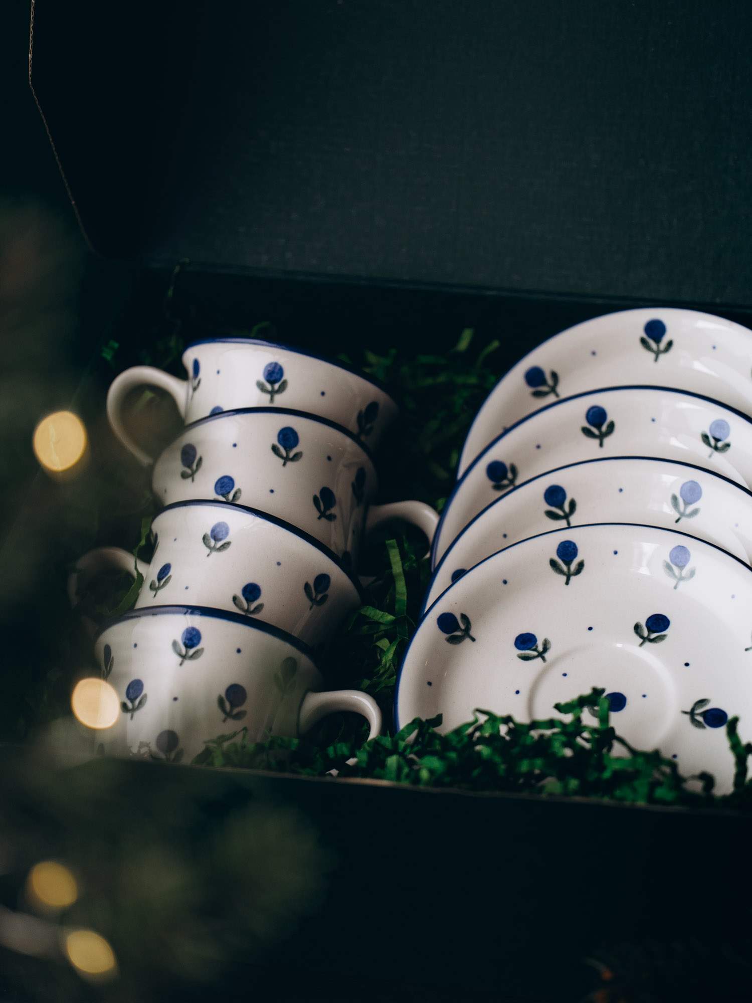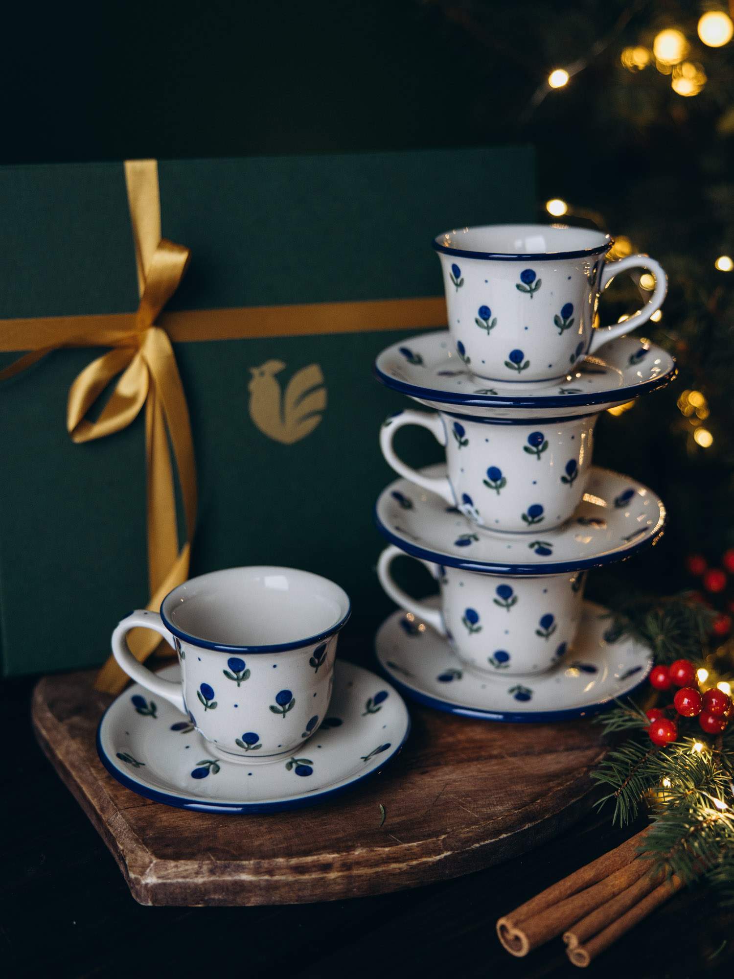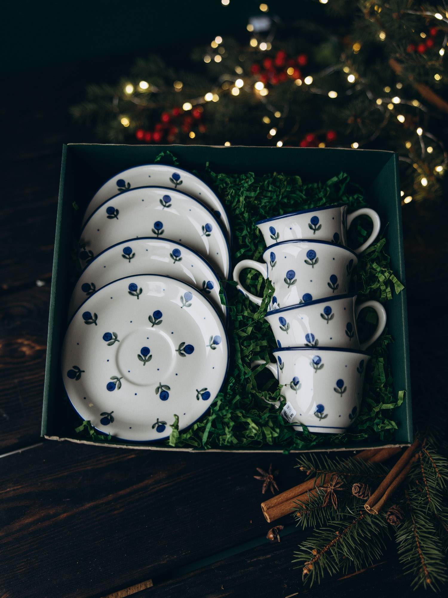 Elegancki zestaw czterech filiżanek kawowych z wywiniętym brzegiem, w komplecie ze spodkami. Jasna ceramika została ozdobiona ręcznie, kobaltowo-zielonym wzorem jagódek. Spodki posiadają delikatne wgłębienie, które pozwala utrzymać filiżankę w odpowiednim miejscu. Filiżanki zapakowane są w zielone pudełko, wypełnione dekoracyjnymi wiórkami oraz ozdobione wstążką i złotym kogucikiem. Idealny zestaw na prezent.
