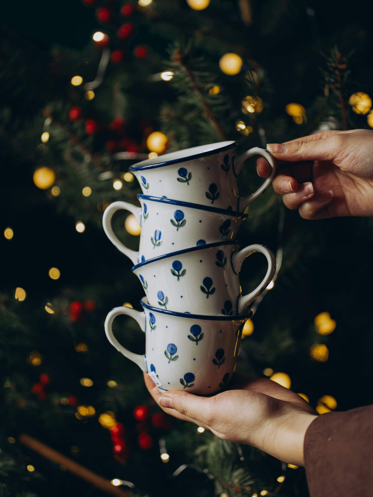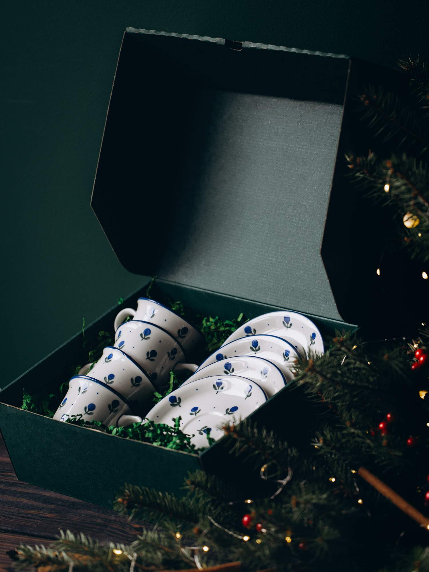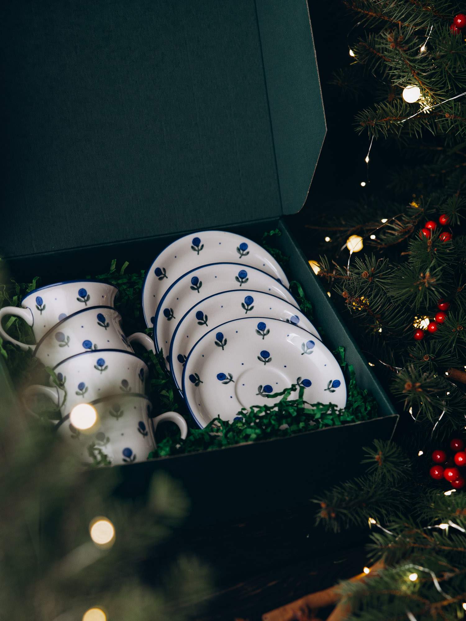 Elegancki zestaw czterech filiżanek kawowych z wywiniętym brzegiem, w komplecie ze spodkami. Jasna ceramika została ozdobiona ręcznie, kobaltowo-zielonym wzorem jagódek. Spodki posiadają delikatne wgłębienie, które pozwala utrzymać filiżankę w odpowiednim miejscu. Filiżanki zapakowane są w zielone pudełko, wypełnione dekoracyjnymi wiórkami oraz ozdobione wstążką i złotym kogucikiem. Idealny zestaw na prezent.