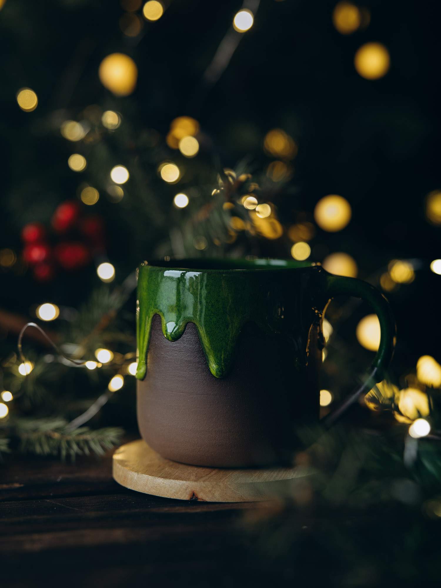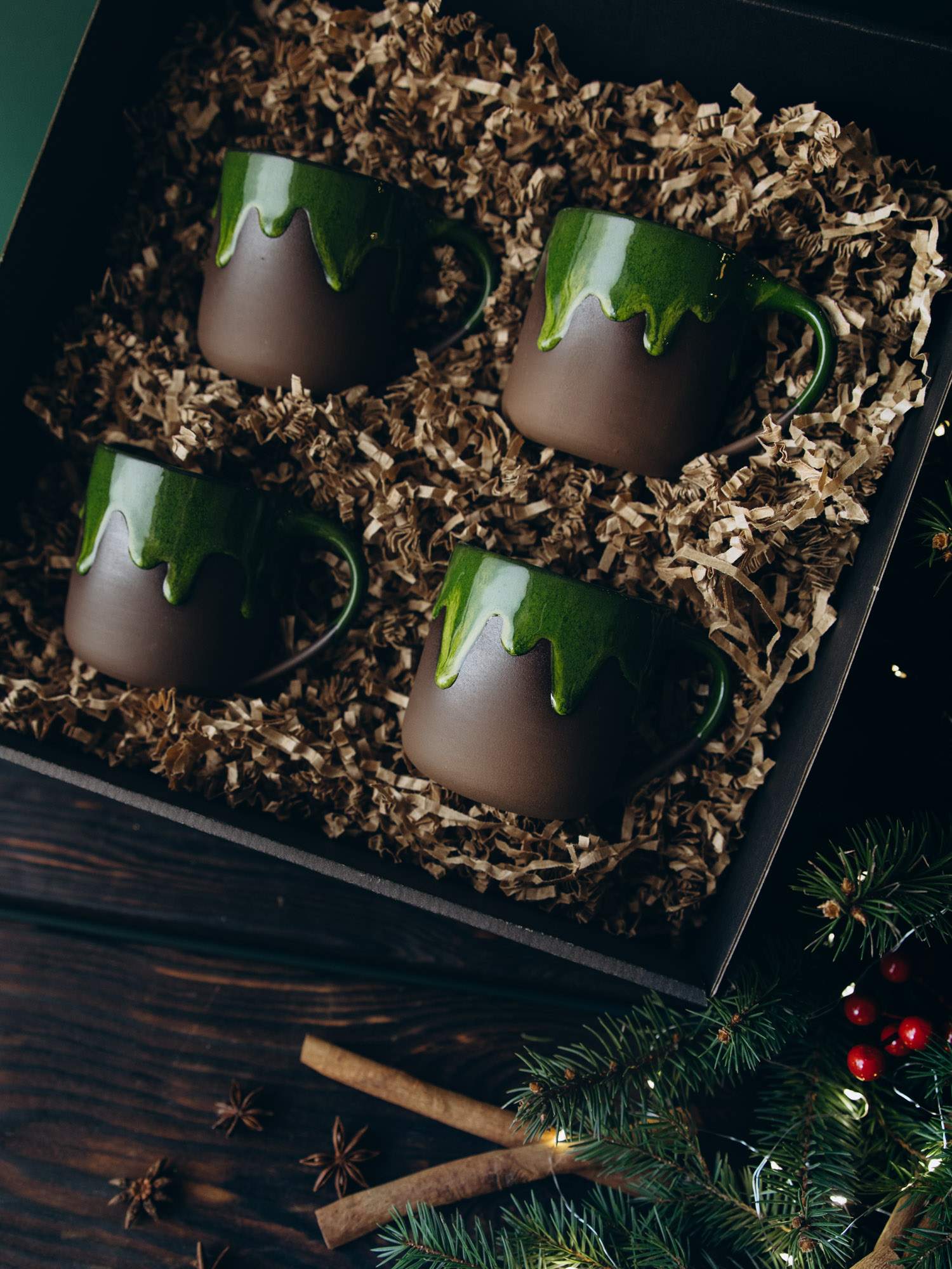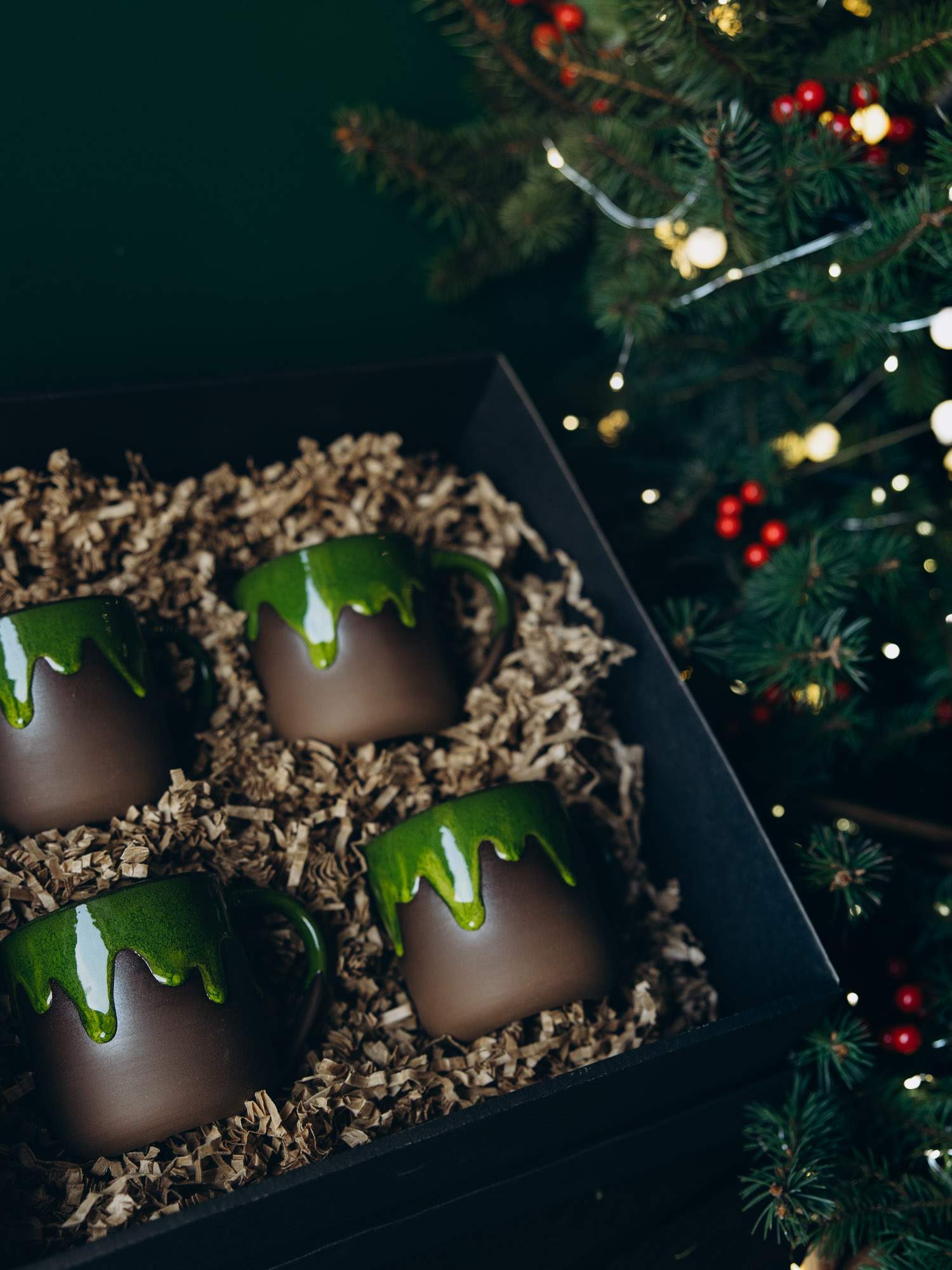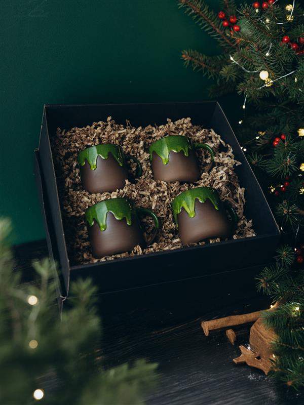 Zestaw prezentowy czterech prostych kubków z zielonymi zdobieniami z Warsztatu Rodziny Konopczyńskich w Bolimowie. Zachwyca swoim prostym, lecz wyrafinowanym designem. Naturalny kolor gliny z delikatnymi zdobieniami oraz subtelna forma nadają mu niepowtarzalny charakter. Kubki zapakowane są w czarne pudełko, wypełnione dekoracyjnymi wiórkami oraz ozdobione wstążką i złotym kogucikiem. Idealny zestaw na prezent.