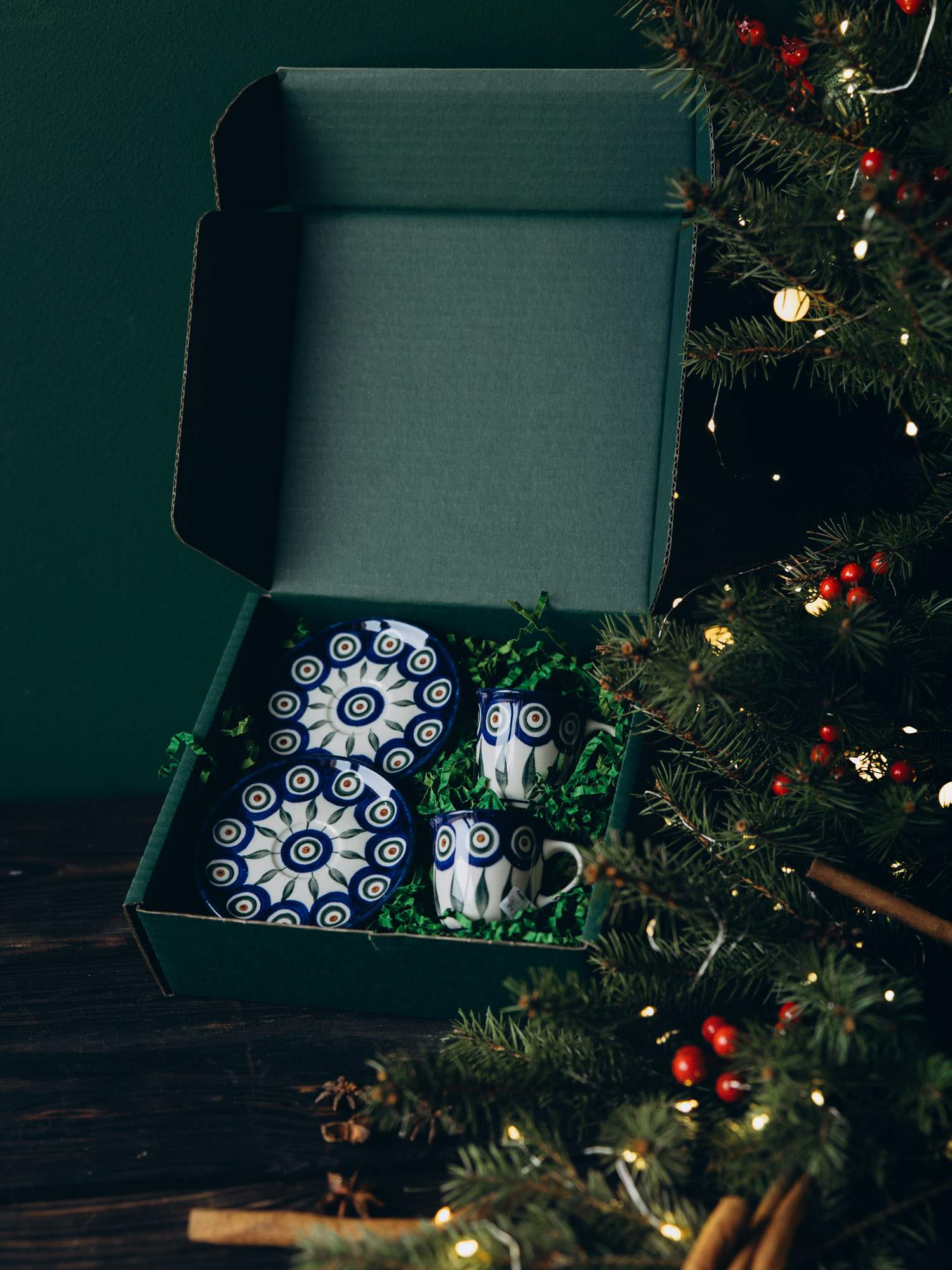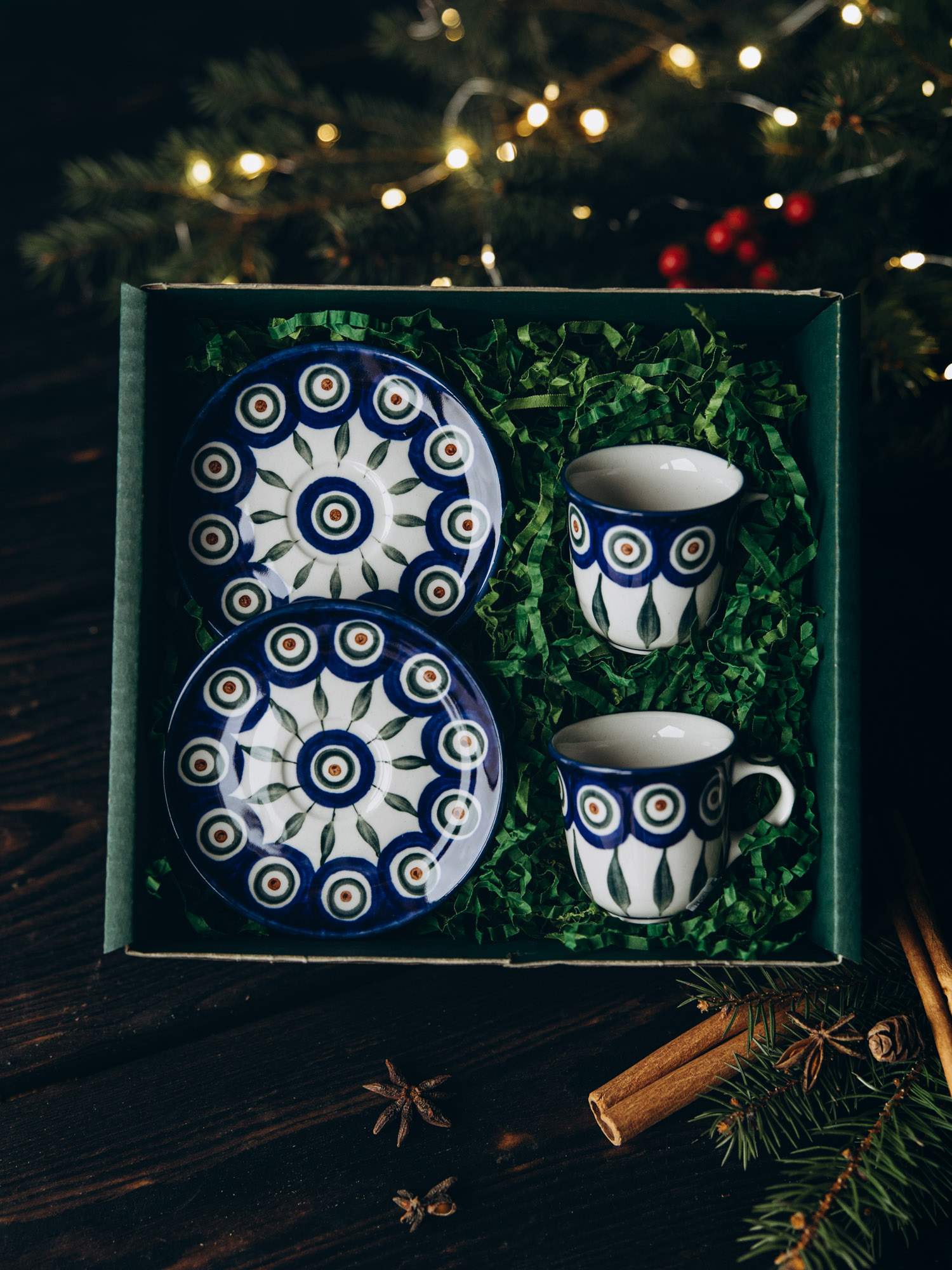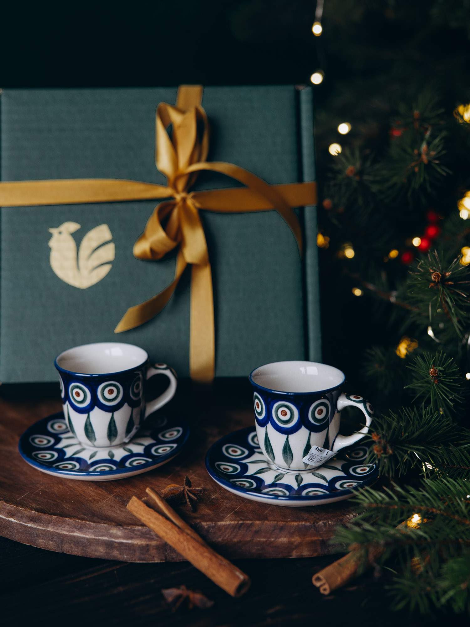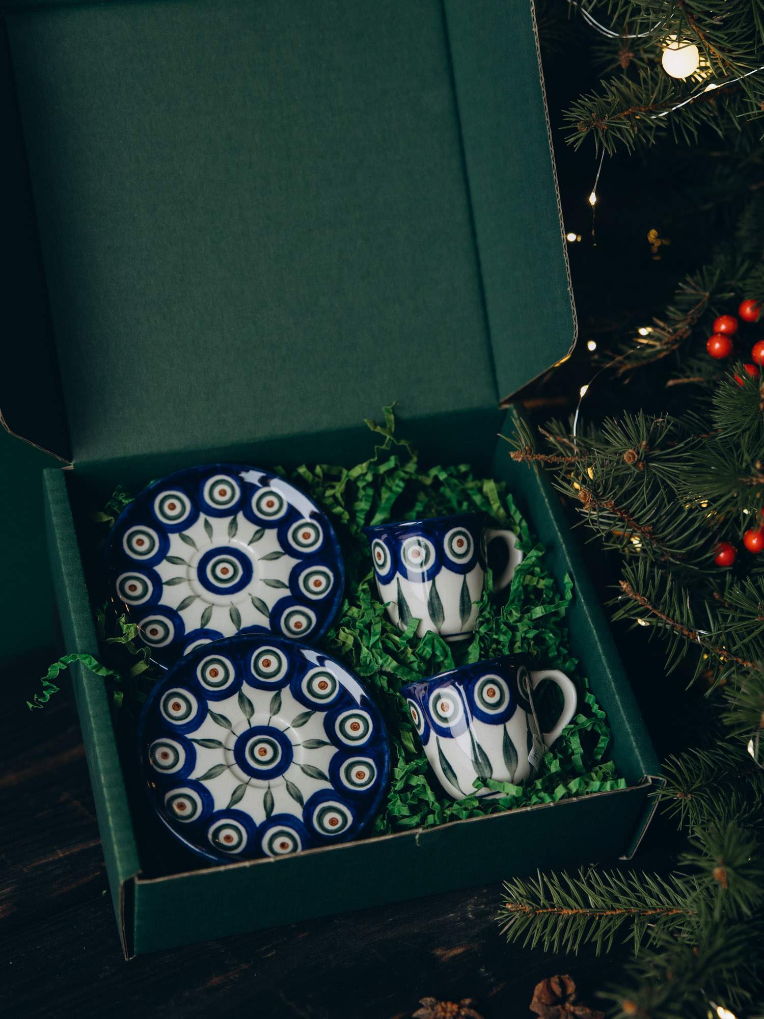 Zestaw prezentowy z dwoma niewielkimi filiżankami w komplecie z talerzykiem. Jasna ceramika została ozdobiona ręcznie, kobaltowo-zielonym wzorem pawiego oczka z listkiem. Podstawek posiada delikatne wgłębienie, które pozwala utrzymać filiżankę w odpowiednim miejscu. Filiżanki zapakowane są w zielone pudełko, wypełnione dekoracyjnymi wiórkami oraz ozdobione wstążką i złotym kogucikiem. Idealny zestaw na prezent.