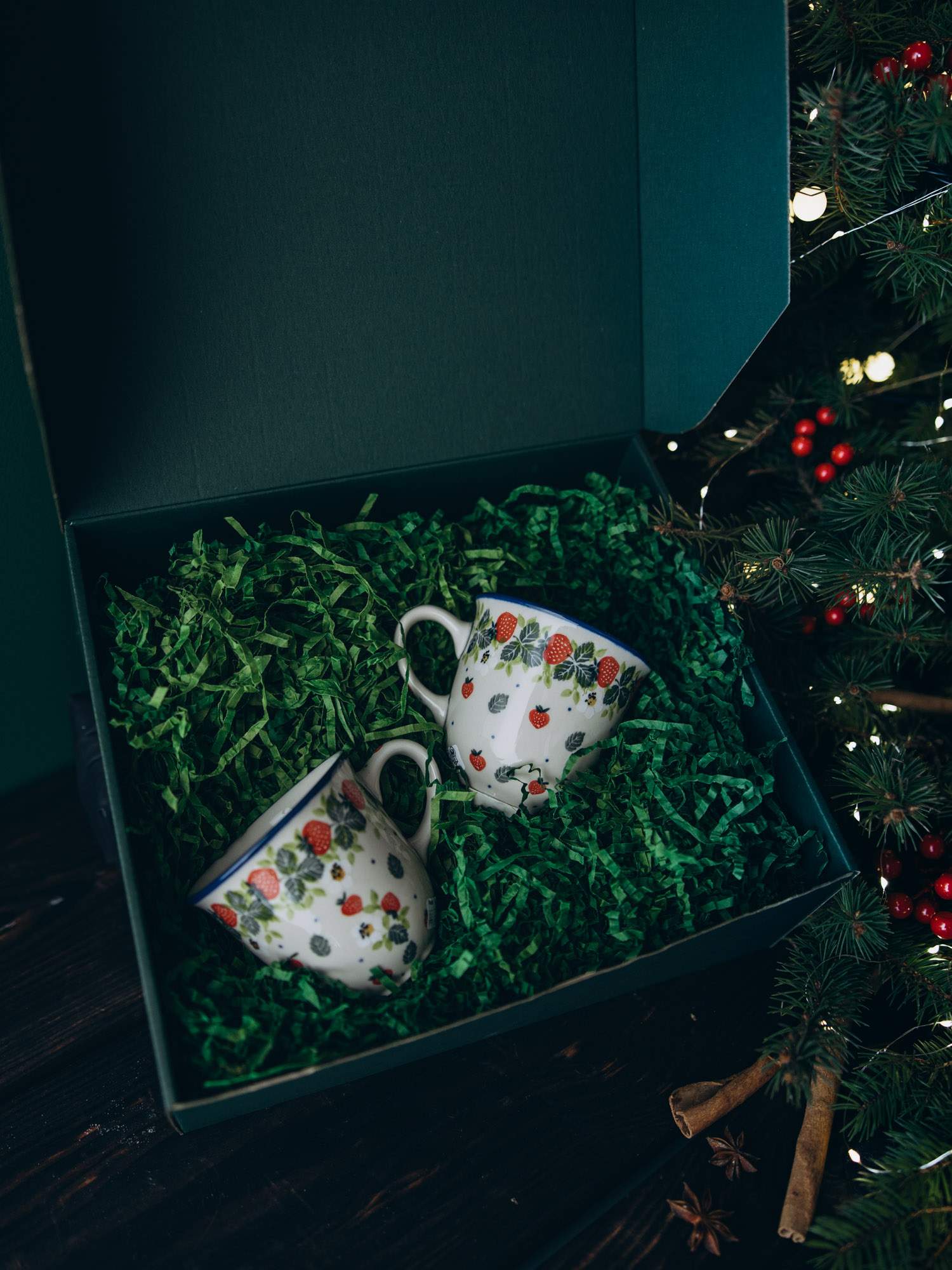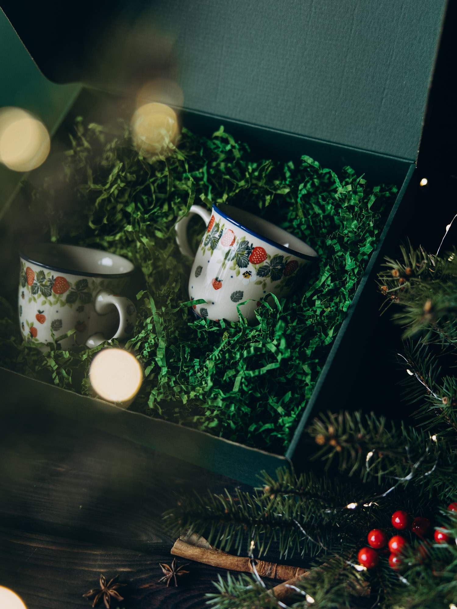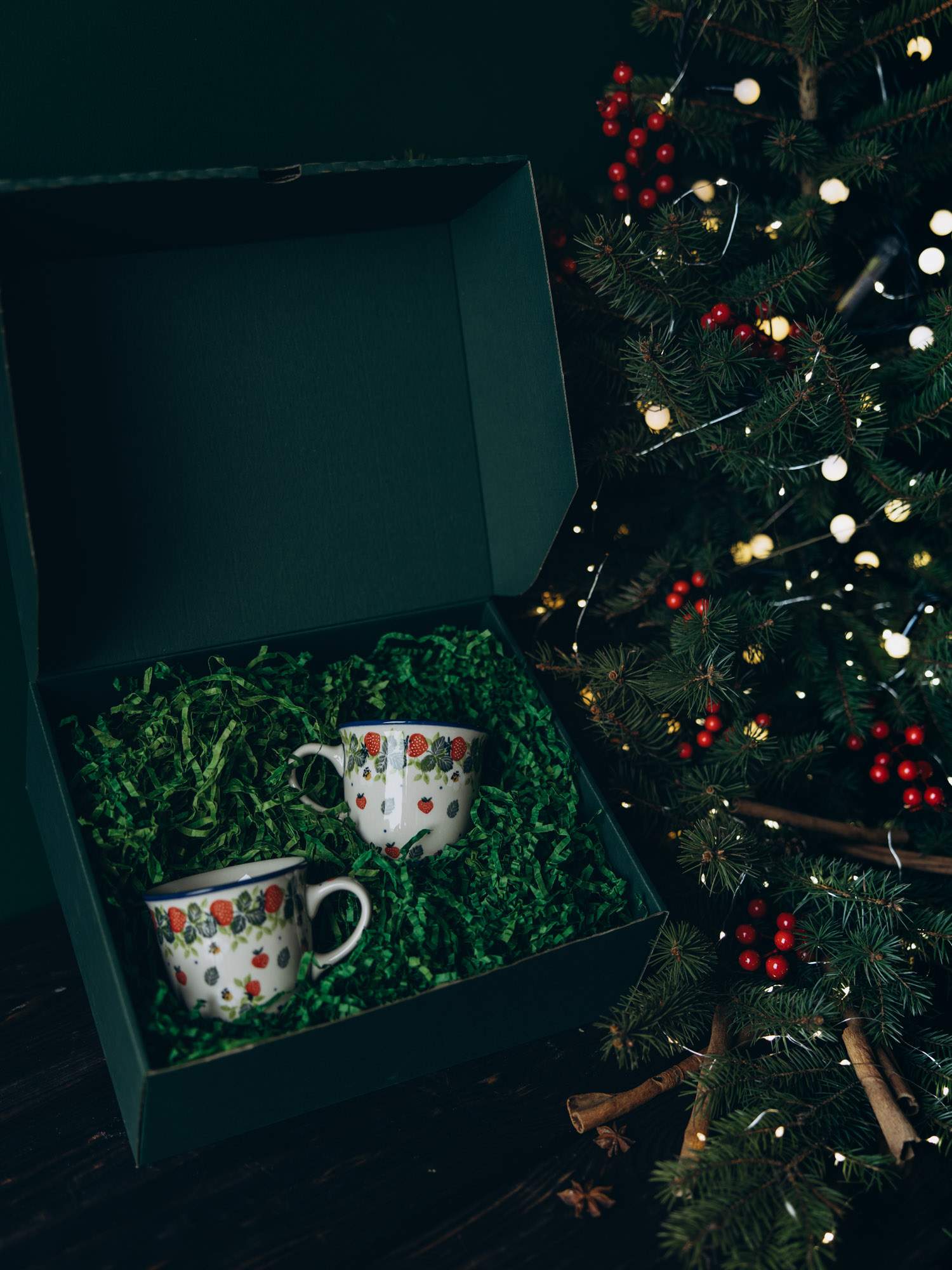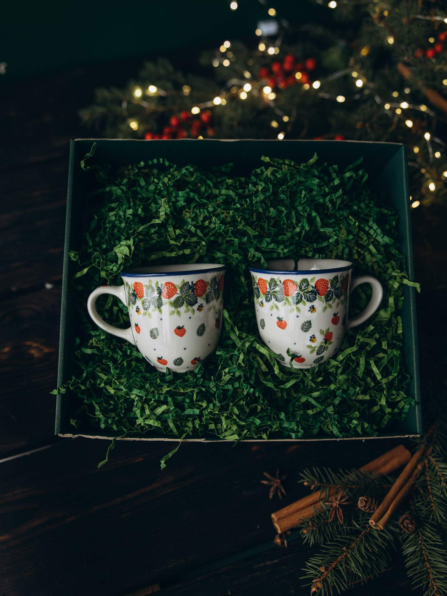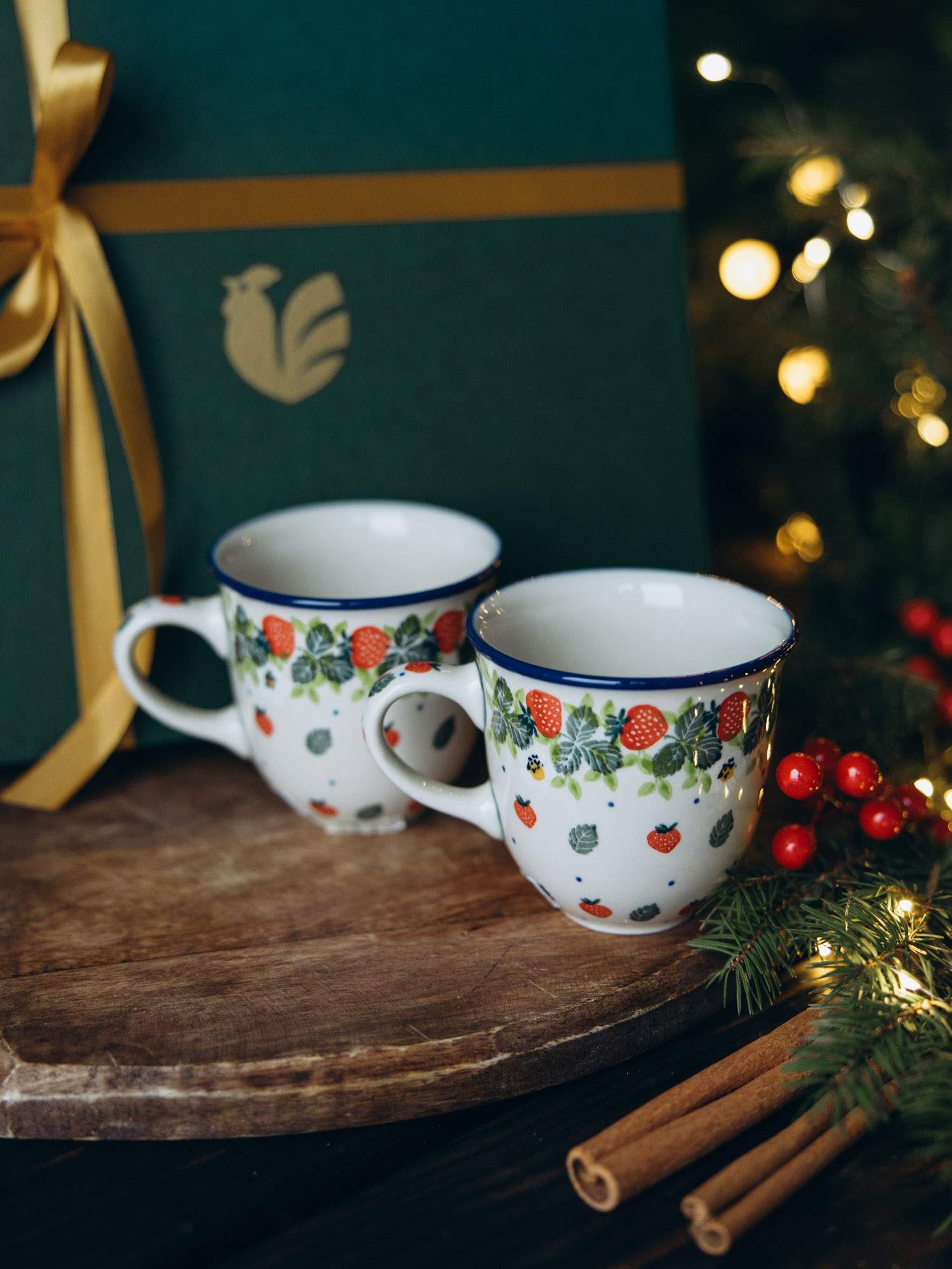 Zestaw dwóch kubków filiżankowych imitujących dużą filiżankę. Jasna ceramika została ozdobiona ręcznie, wzorem czerwonych truskawek z zielonymi detalami. Naczynie posiada subtelnie wywinięty brzeg oraz wygodny uchwyt. Kubki zapakowane są w zielone pudełko, wypełnione dekoracyjnymi wiórkami oraz ozdobione wstążką i złotym kogucikiem. Idealny zestaw na prezent.